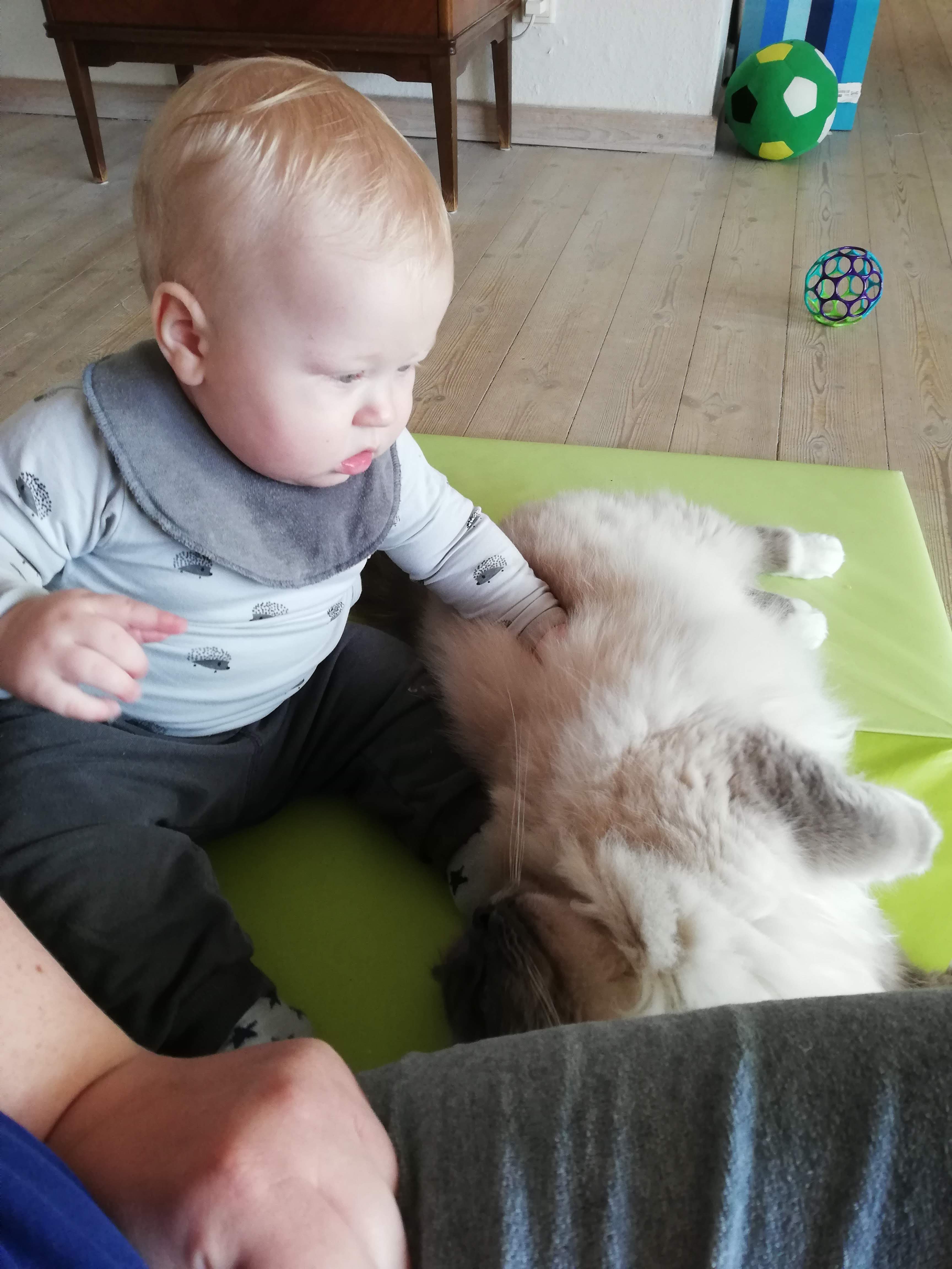 Vi havde også en anden kat fra dem, da sønnen var helt lille, som var vild med ham (desværre mistede vi katten til sygdom). Han har været cirka 5 år, da sønnen blev født.