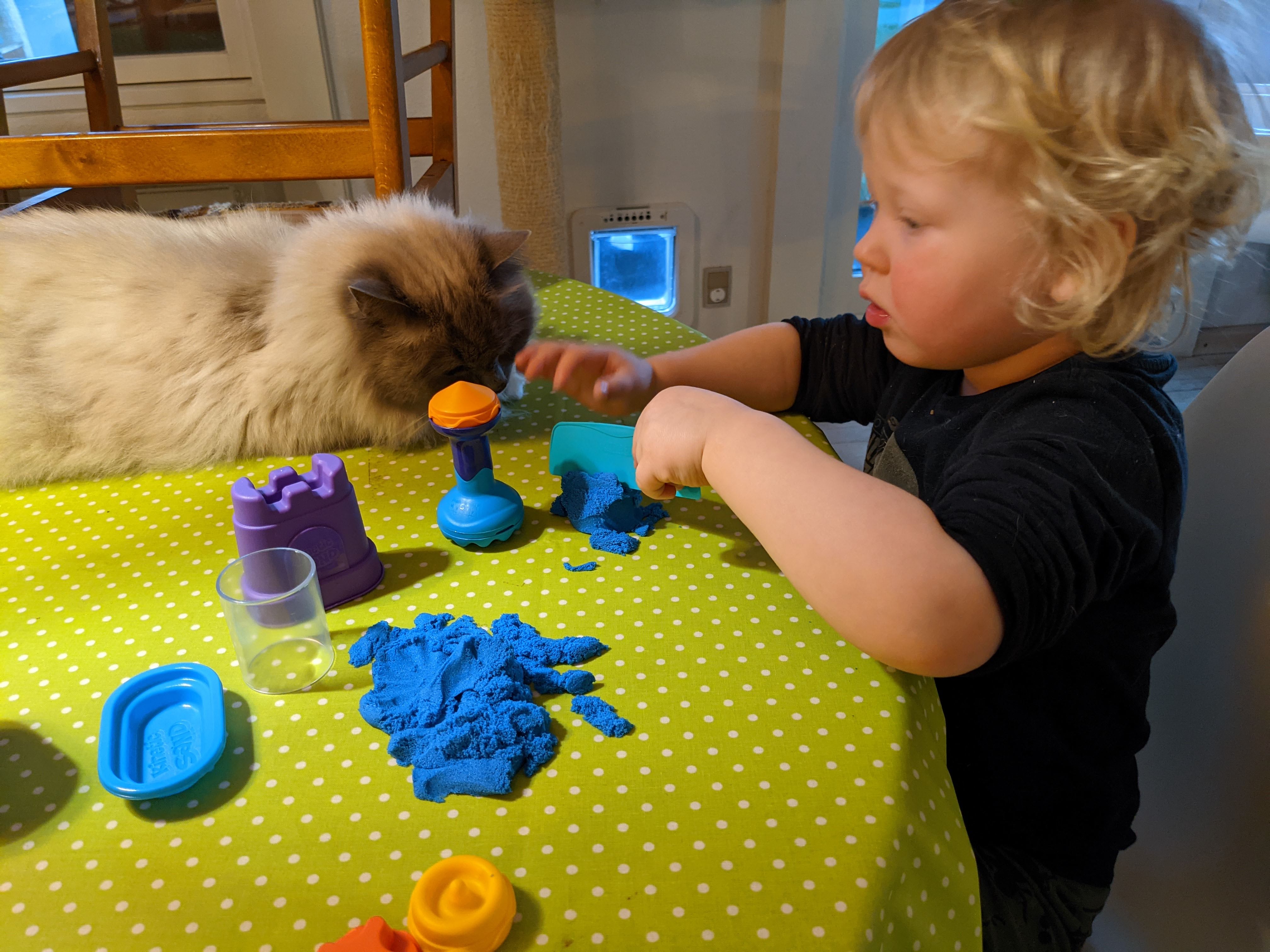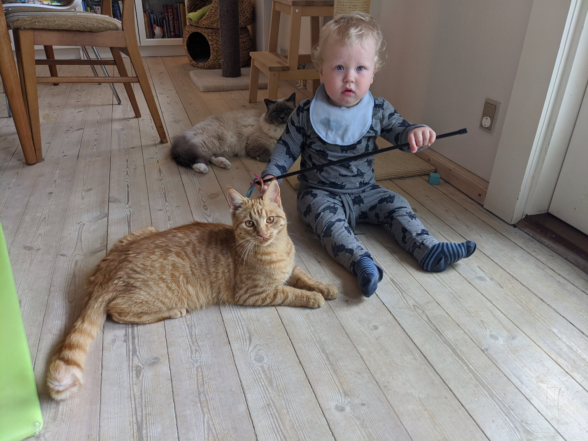 Den sidste kat, vi har, flyttede ind som killing. Hans mor gik fra ham, da han var en 6 uger, og siden er han vokset op sammen med andre killinger hos en plejefamilie. De to er buddies! Katten er sådan en, hvor man virkeligt skal være over børn, fordi han finder sig i alt fra dem. Sønnen og katten har lige brugt en halv time på at lege med drillepind