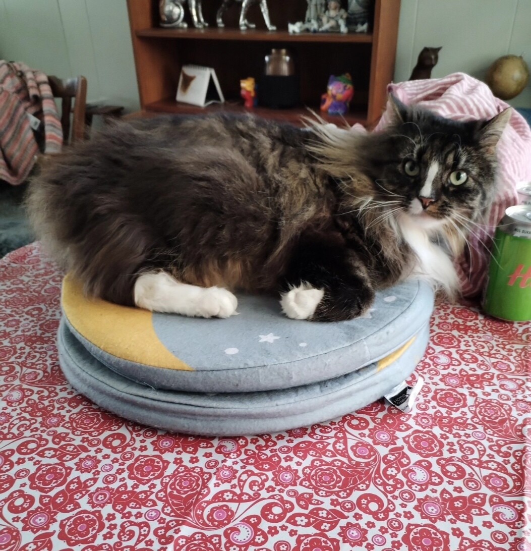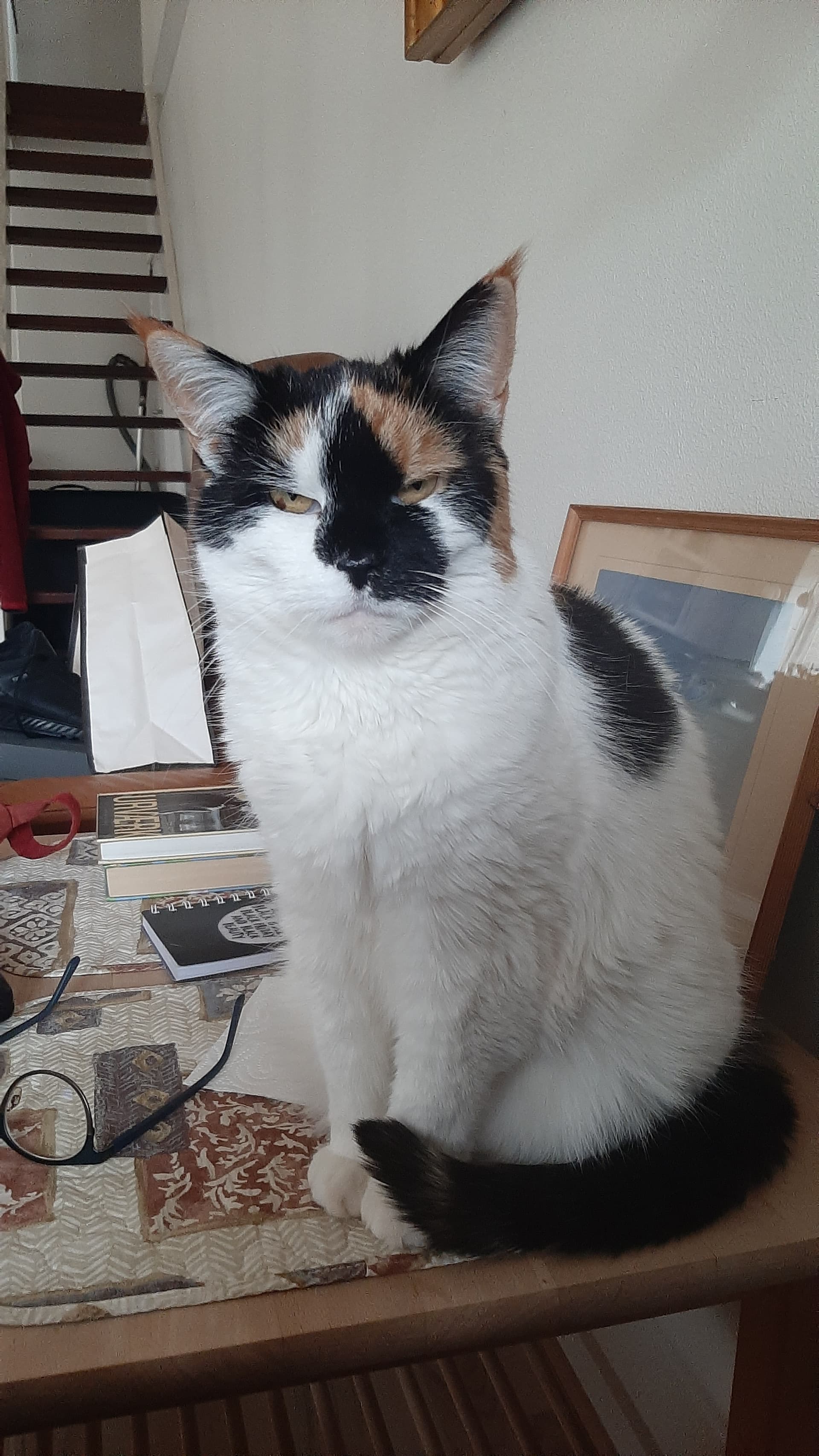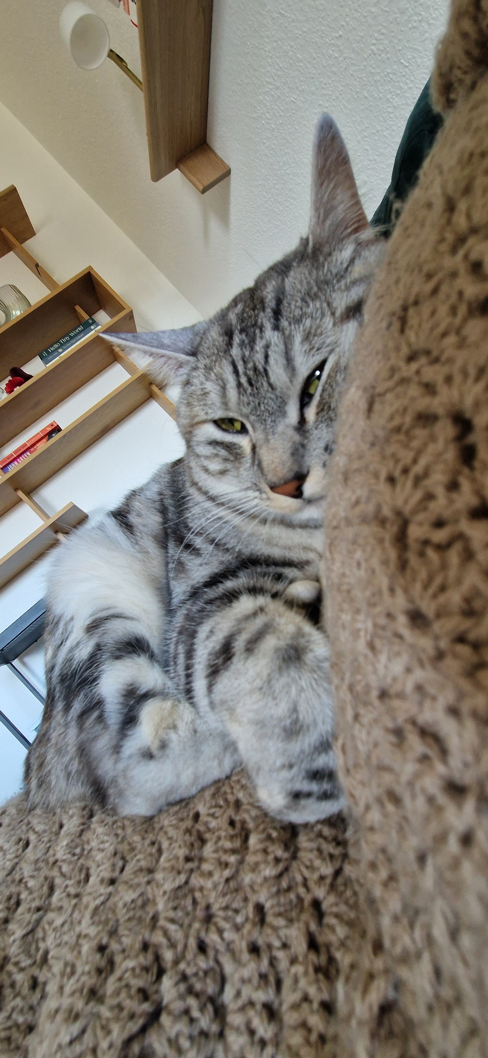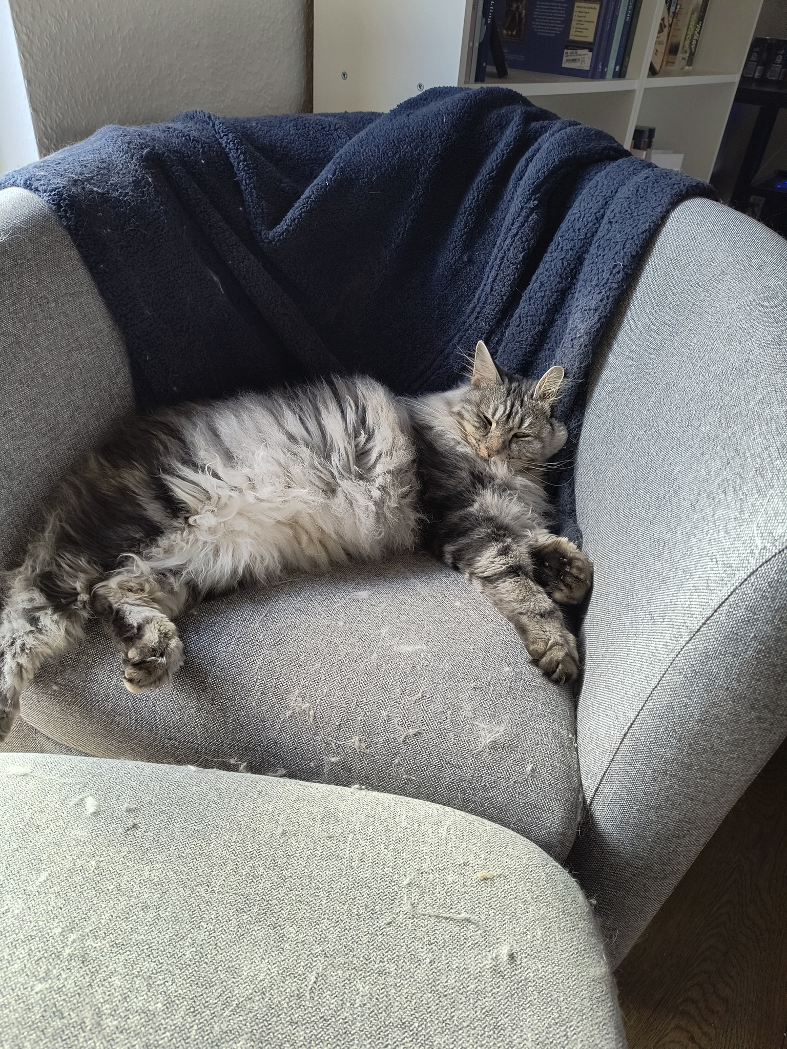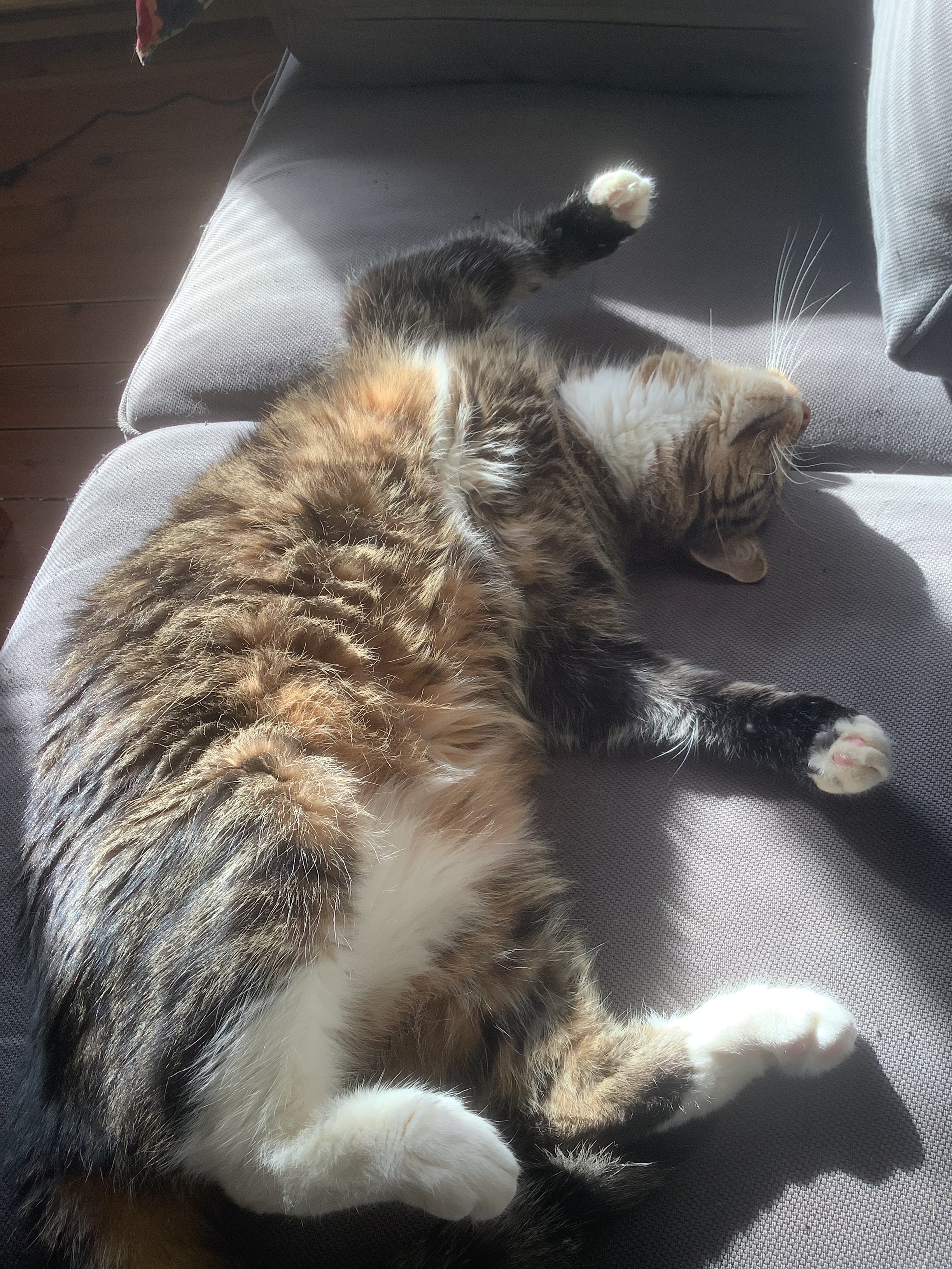Tror ikke jeg nogensinde har haft en anden kat, der, som Delle, kan bruge flere timer, og helst hele dage, på bare at ligge på mig. Hun er mors pige og virkelig en klisterkat på sin egen måde. For hun kræver ikke min opmærksomhed når hun ligger hos mig, hun vil bare have en seng bestående af mig og tæppe.