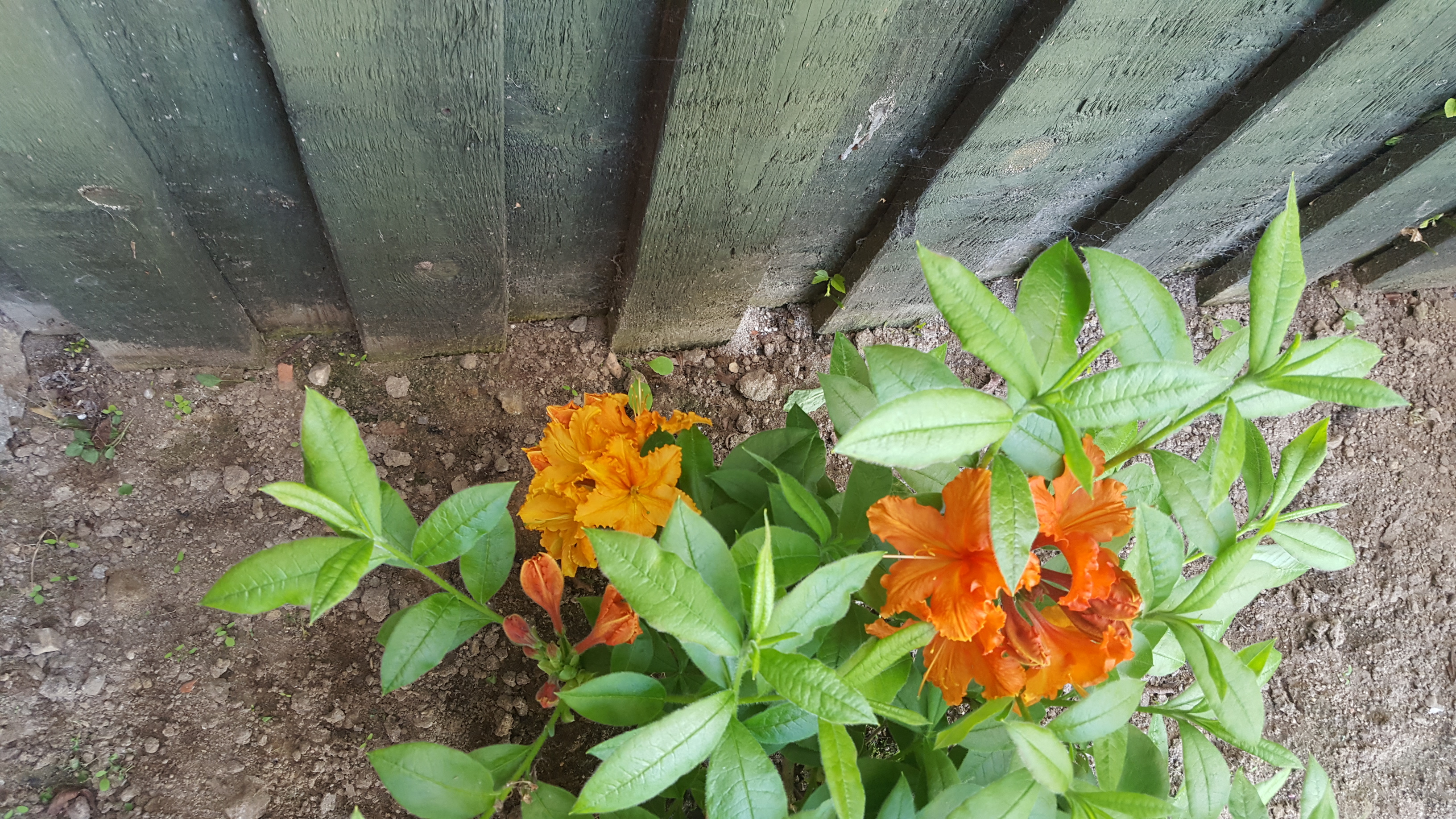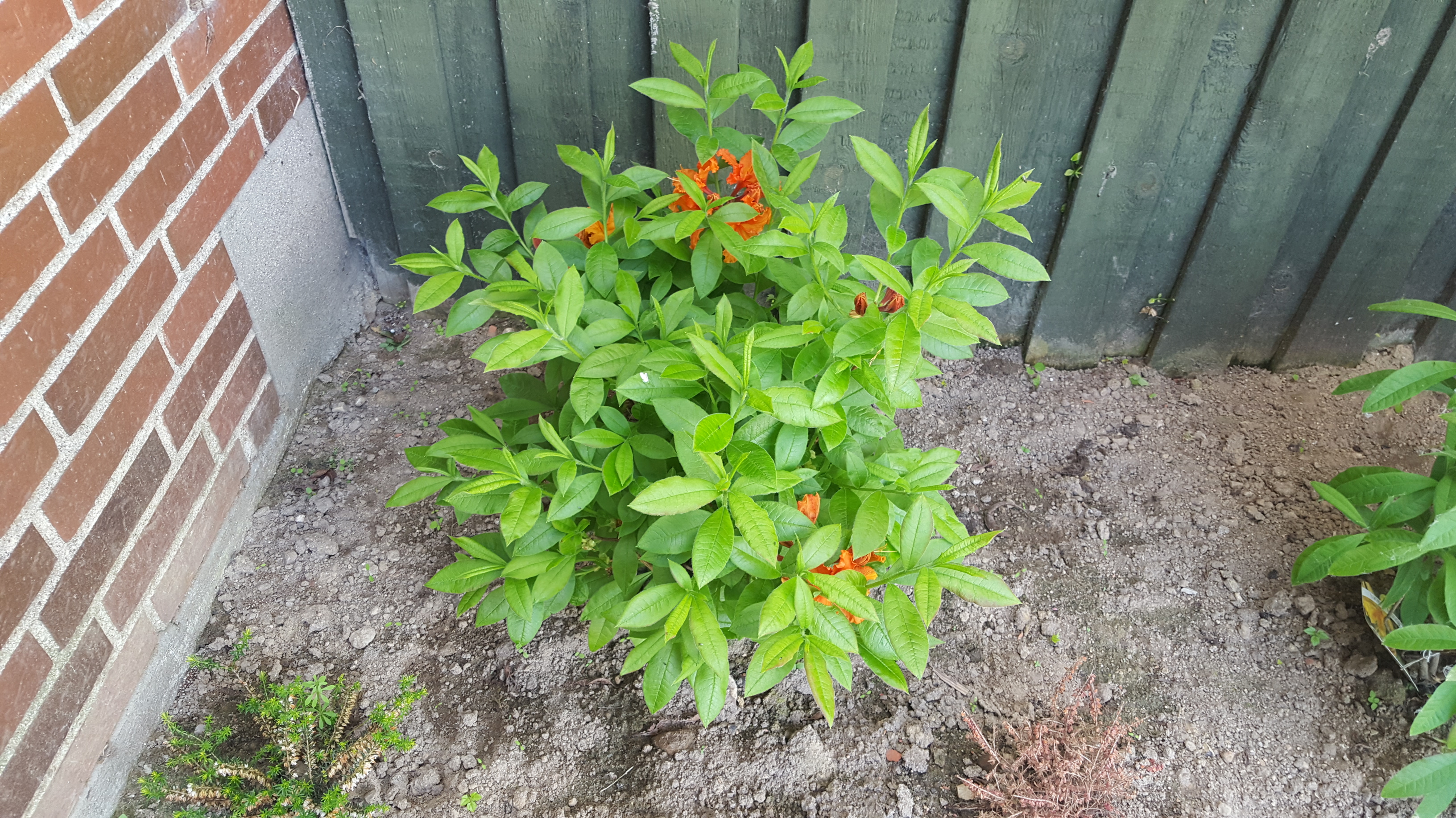 Et par steder er der dog lidt liv. Her min orange rhododendron. Jeg har været så spændt på at se blomsterne - og om der i det hele taget kom nogen, for den står gemt væk i næsten total skygge.