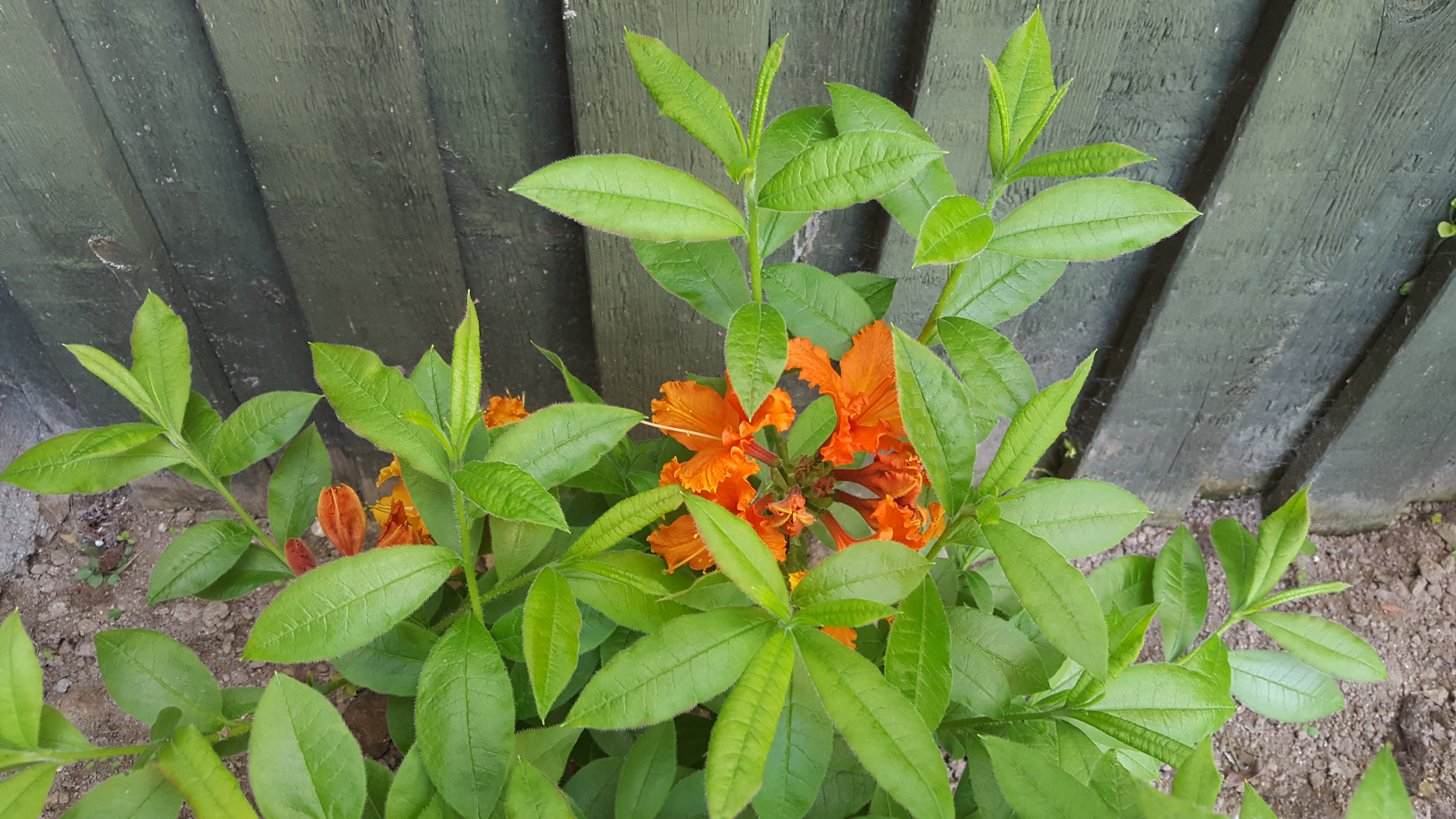Trekantsblomsten har også sat de første blomster. Det er en, der var i haven, men jeg er stærkt i tvivl om, om den skal blive der. Den sætter små udløbere i alle retninger og flere meter væk fra moderplanten. Så enten skal den graves op og smides væk til efteråret, eller også skal den begrænses på en eller anden måde.