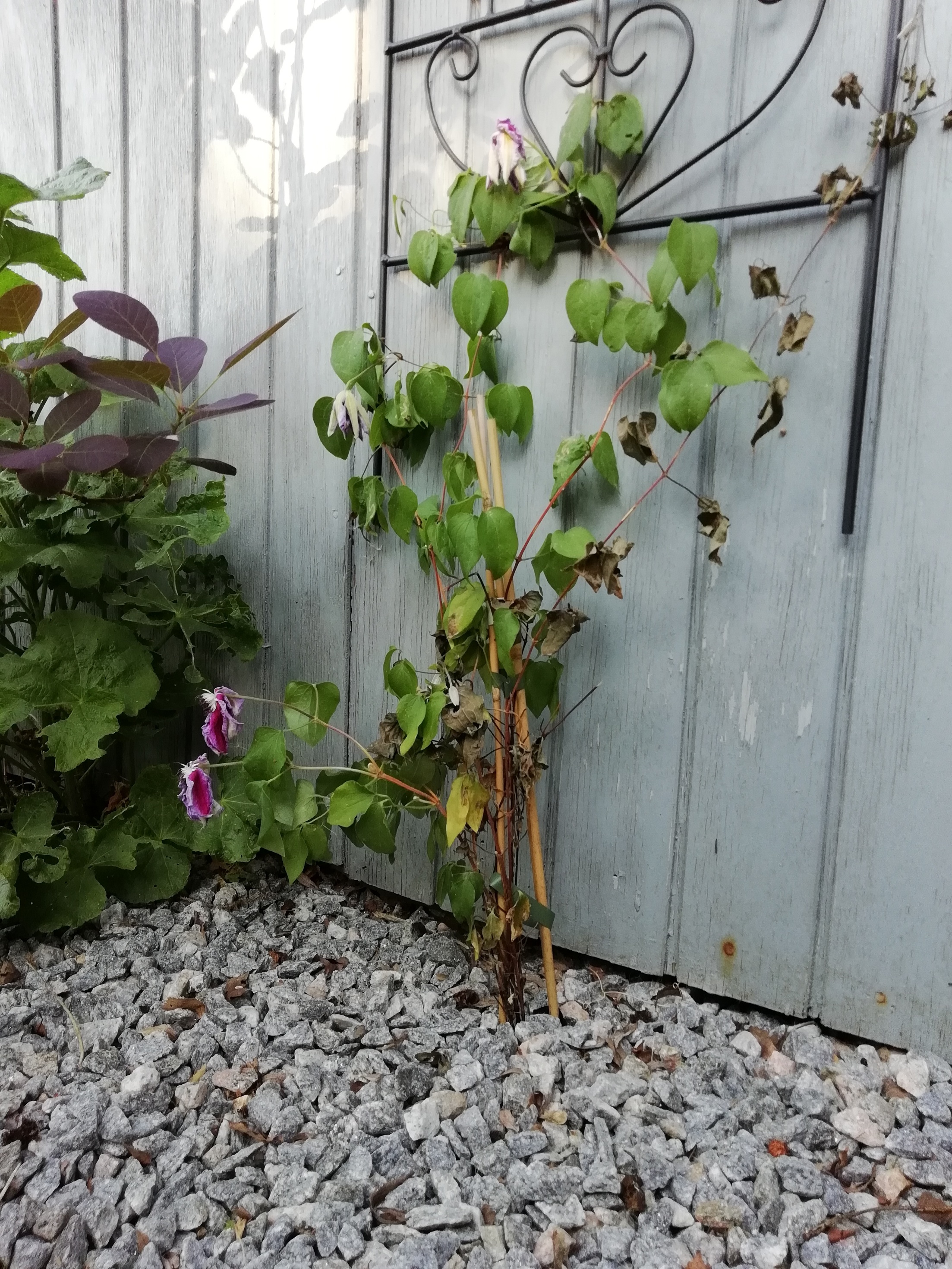 Købte en ny Klematis for et par måneder siden, plantede den og har passet og plejet den efter alle kunstens regler … i går morges stod den så flot og fin med de første blomster, i dag ser den sådan her ud:
