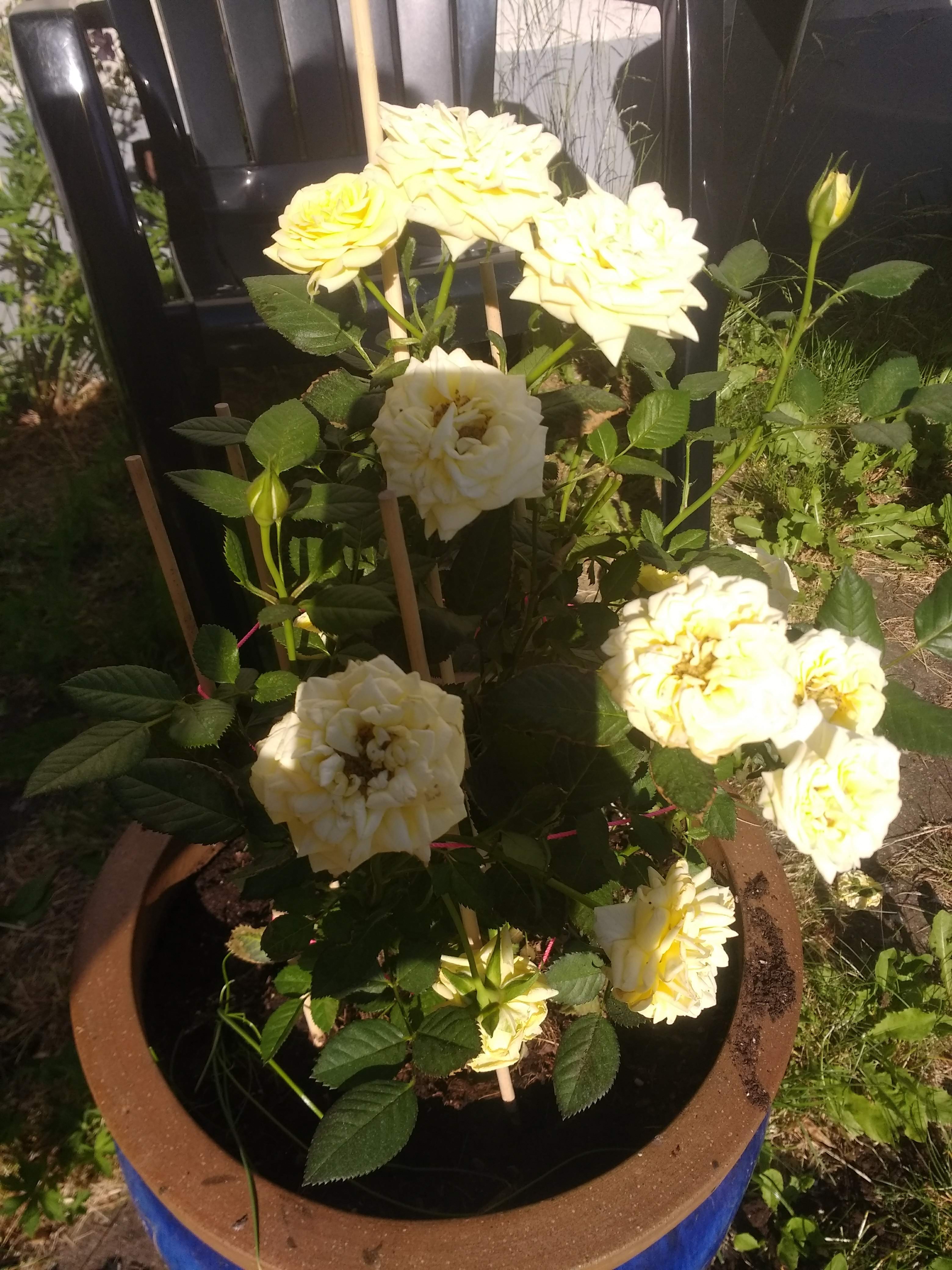Jeg har plantet en rose i min krukke. En krukke der ellers i flere år, kun har vokset senegræs i, fordi jeg aldrig kan tage mig sammen til at få plantet noget fornuftigt. Jeg har sat lidt purløg ude i siden. Aner ikke om det kan trives sammen med rosen.