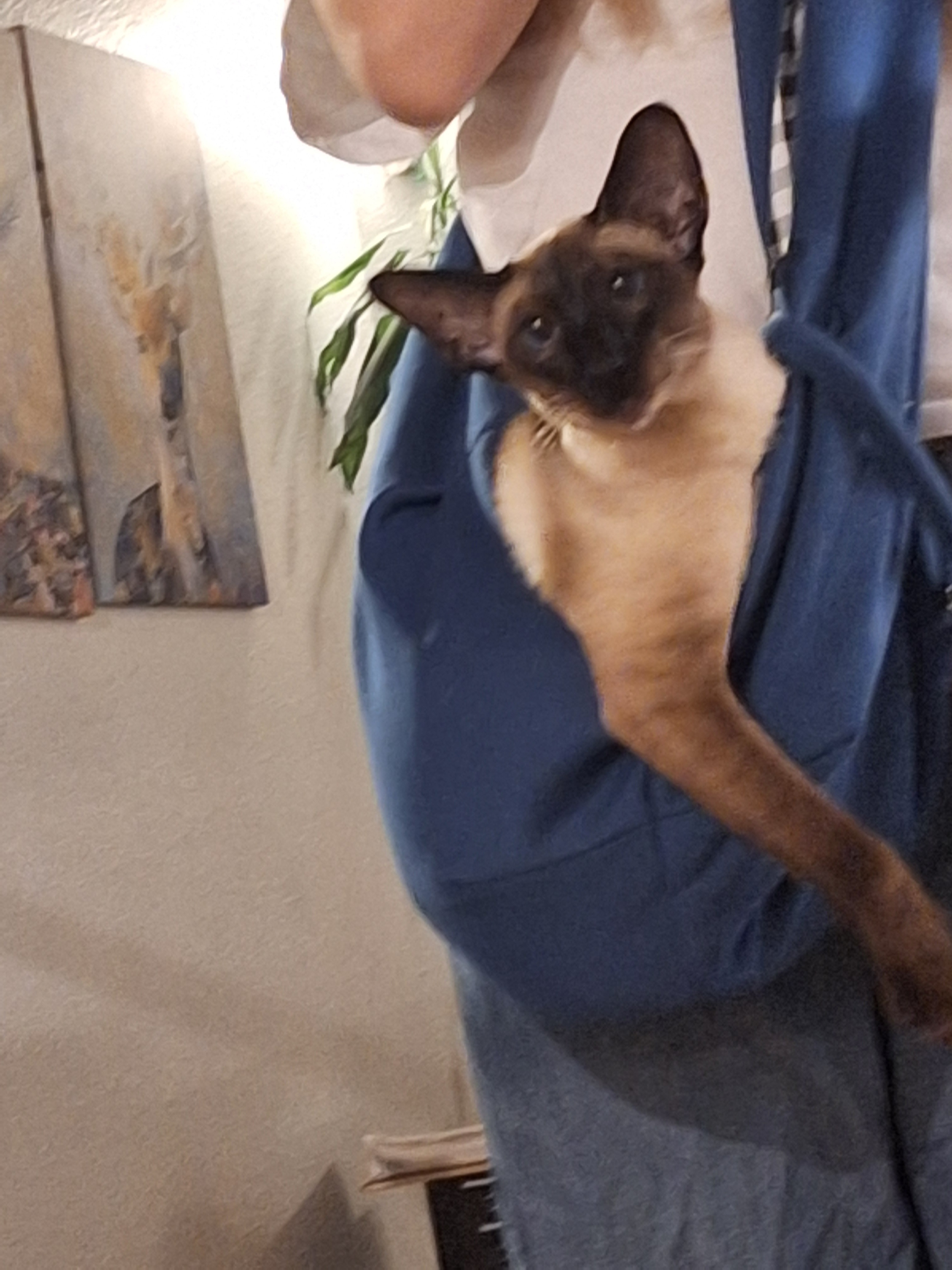 Vi har konstant hjælp til alt og hun bare spandt da jeg lavede en pose i den trøje jeg har på og lod damen blive i den mens/så jeg kunne få lov til at fylde nogle julekalenendere med chokolade. Idgie er mere glad for den helt tætte varmende kontakt end andre voksne siataler jeg har haft, så jeg kom til at tænke på at kia også havde siamesere med det behov, hvor en slynge gjorde en kæmpe forskel.