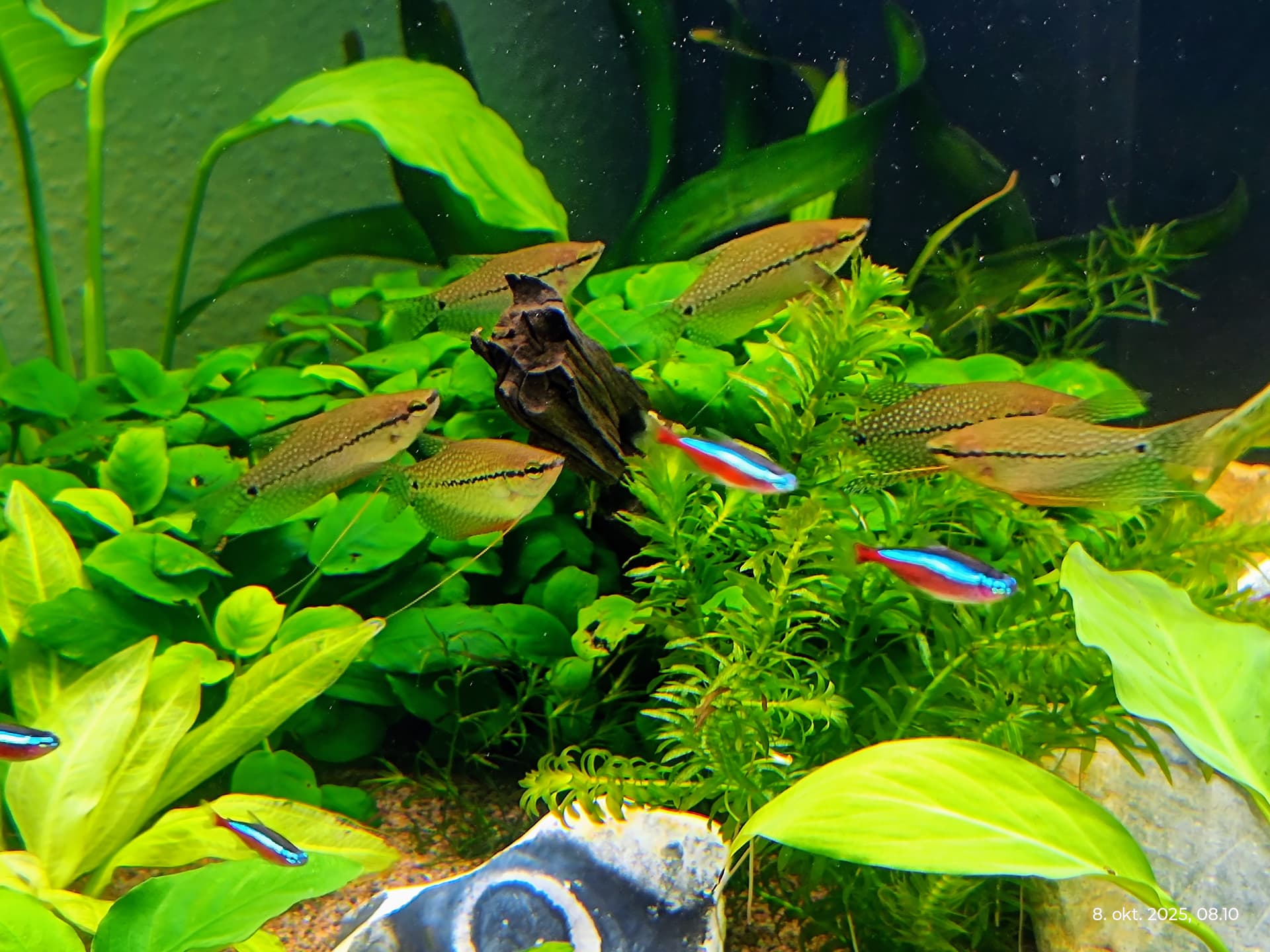 Mine sugemaller ser ud til at hygge sig. De har været meget mere fremme, undersøger det hele og smager på alting. Mine neonfisk boltre sig også i hele akvariet. Jeg er virkelig glad for jeg valgte så stort et akvarie ![]()