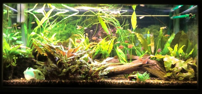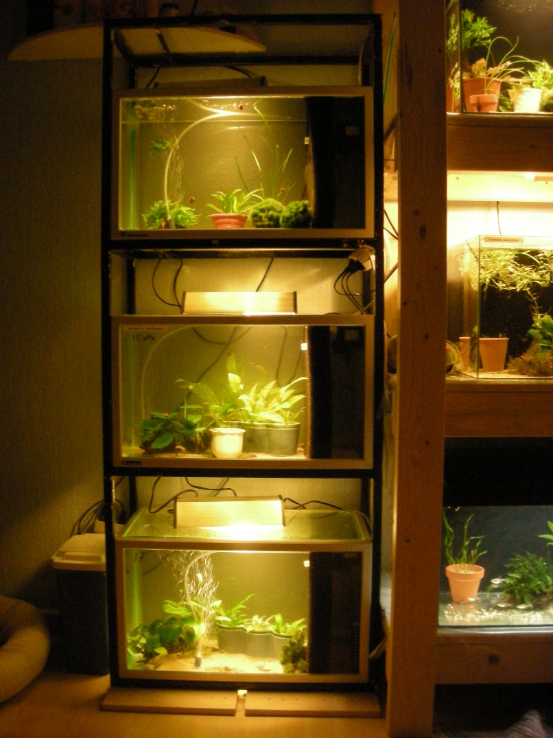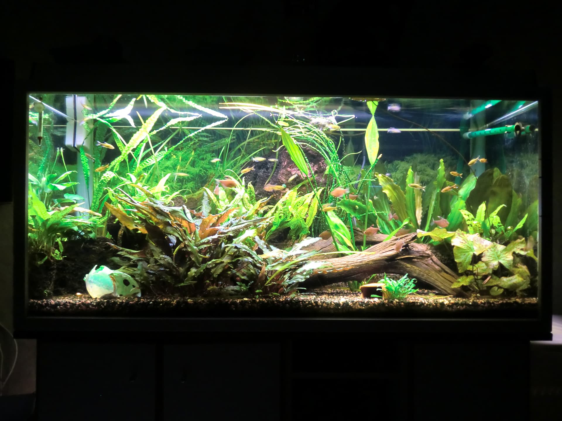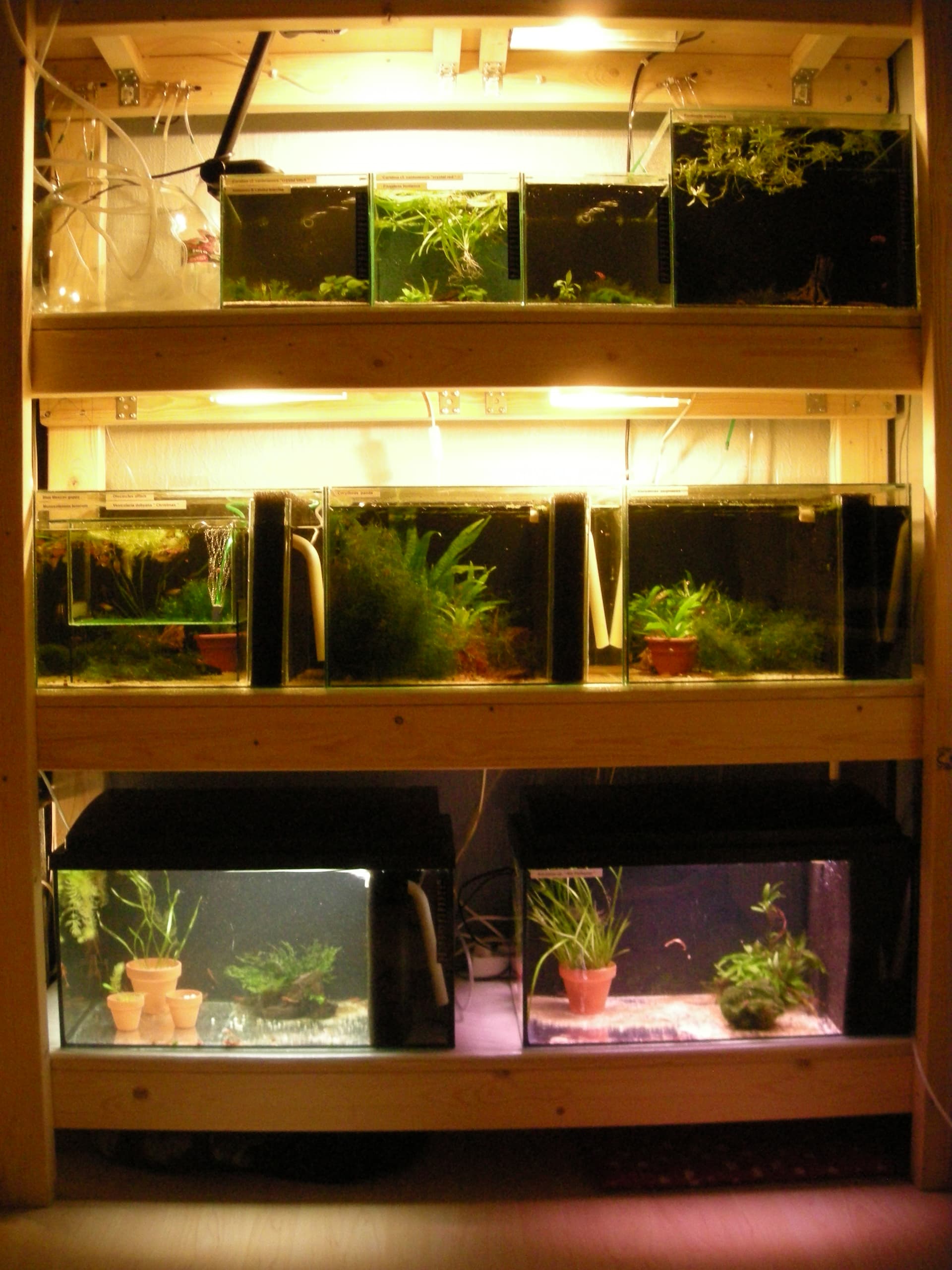 Vi havde et par store akvarier. Den i stuen var på 180l. Sønnikes var på 450l, samt jeg havde vel 20 akvarier i forskellige str fra 15l til 50 l hvori jeg havde opdræt af pansermaller og ikke mindst mine røde grenmaller