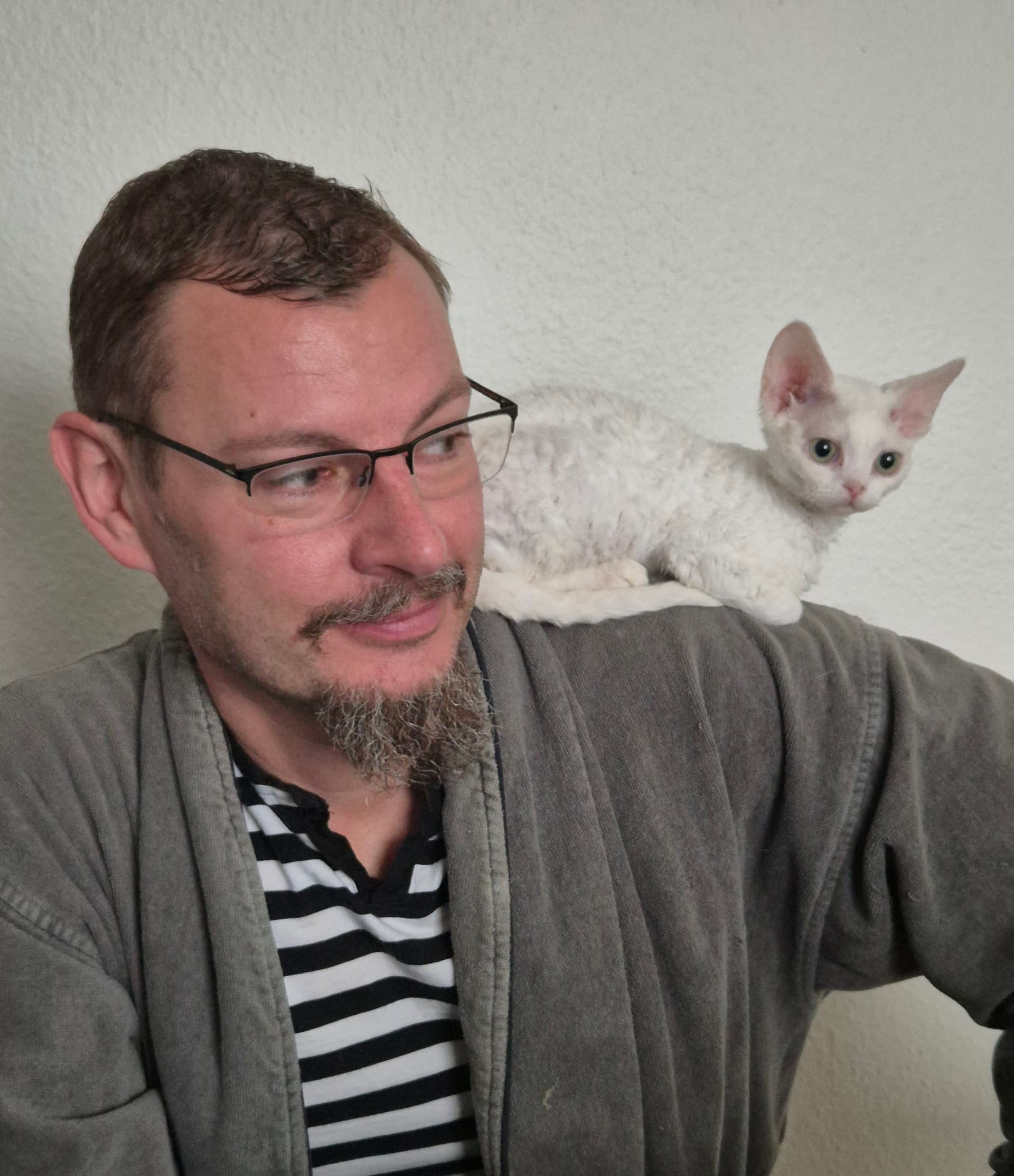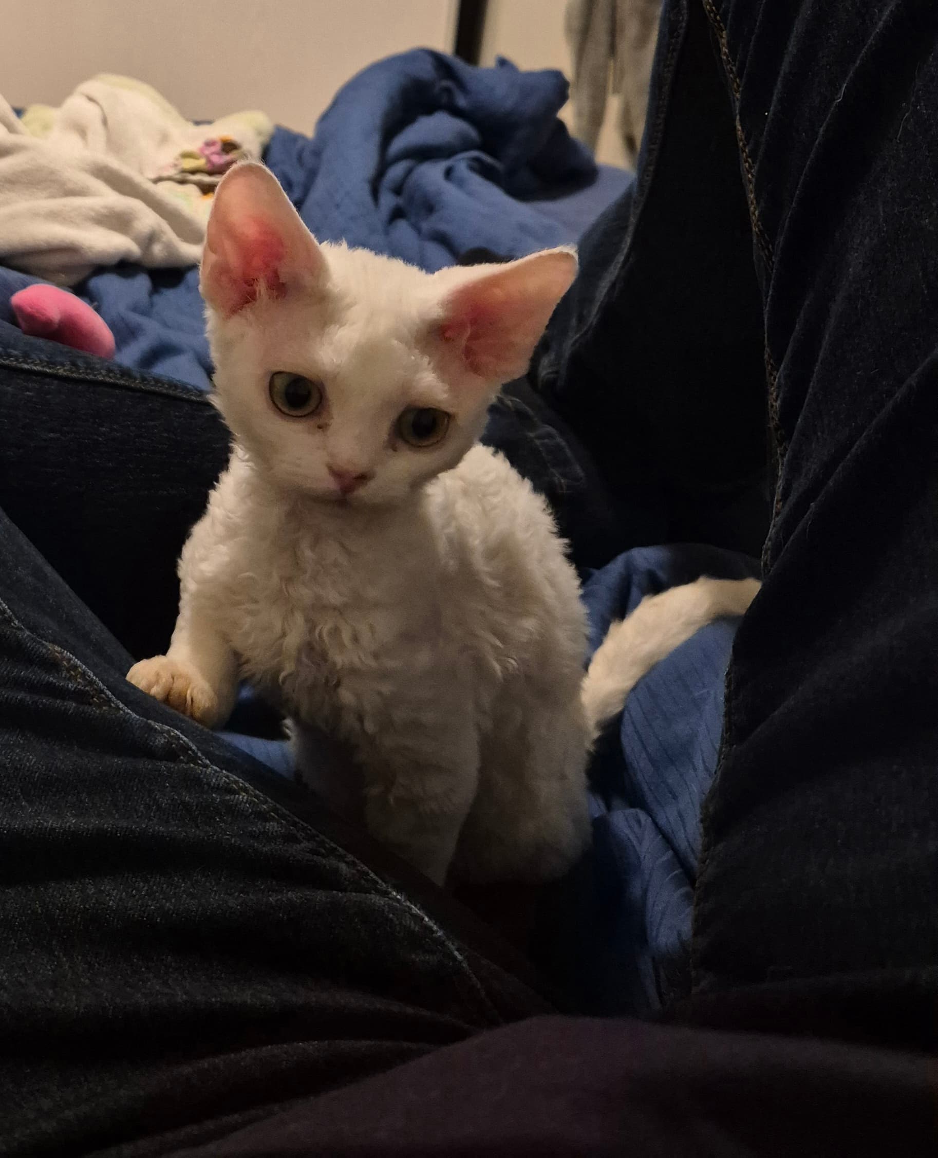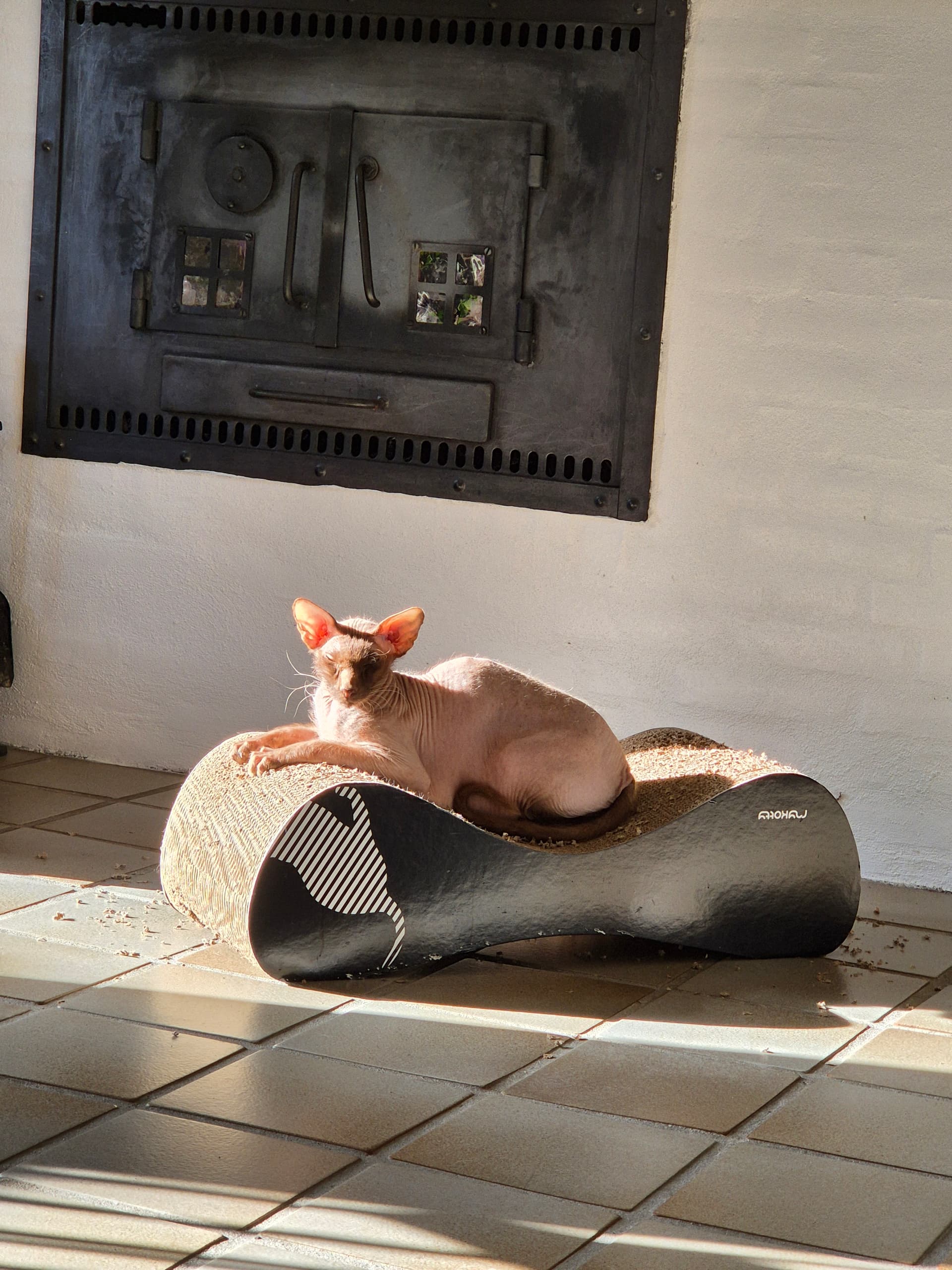 Han er en peterbald. En orientaler med et gen der giver grader af mærkelig pels eller mangel på samme.