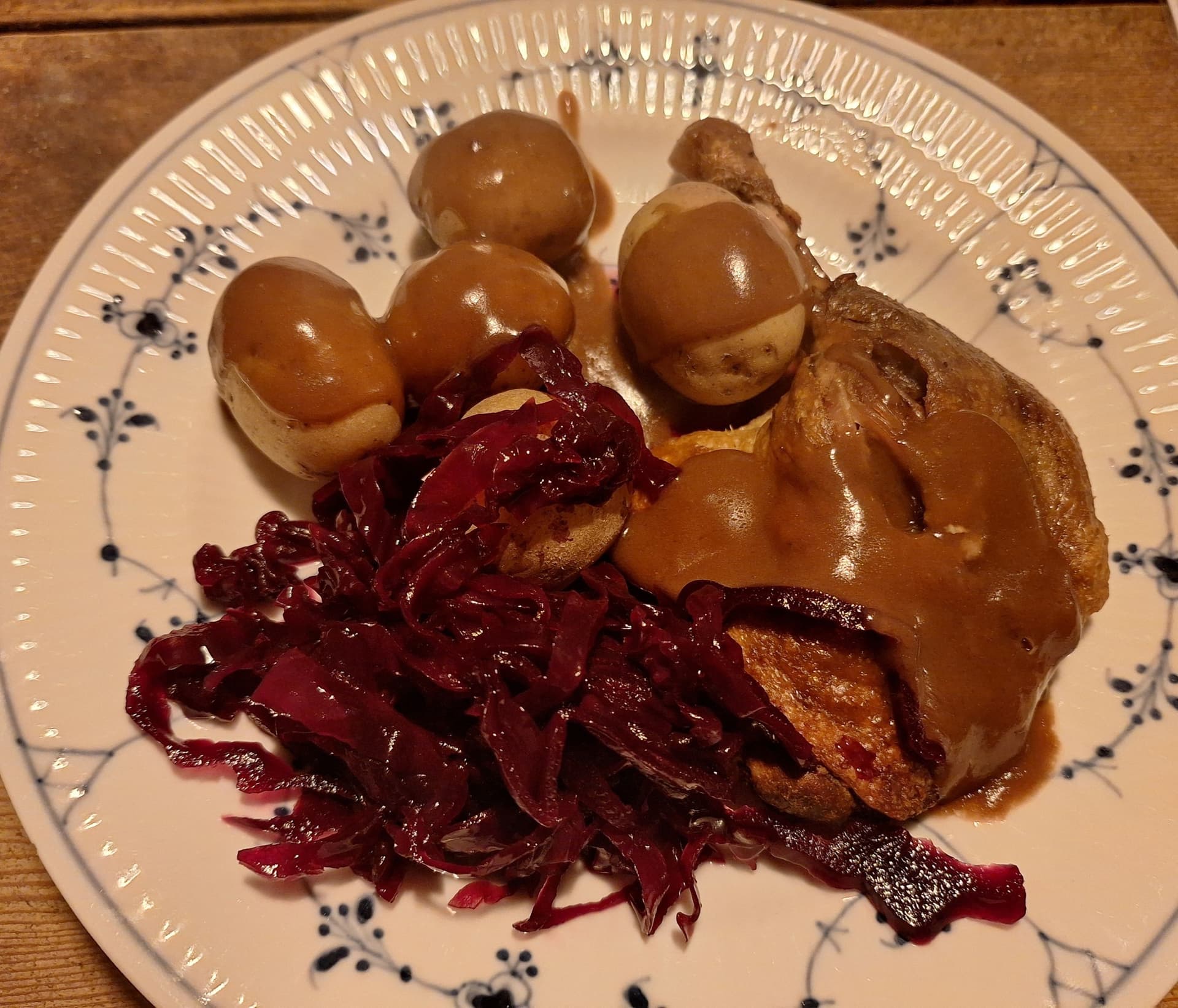 Vi fik 100% død flæskesteg og andebryster, overkogte kartofler, lækker sovs og rødkål (fra kantinen på mit arbejde) og en meget grov rødkålssalat, som jeg ikke tog noget af.