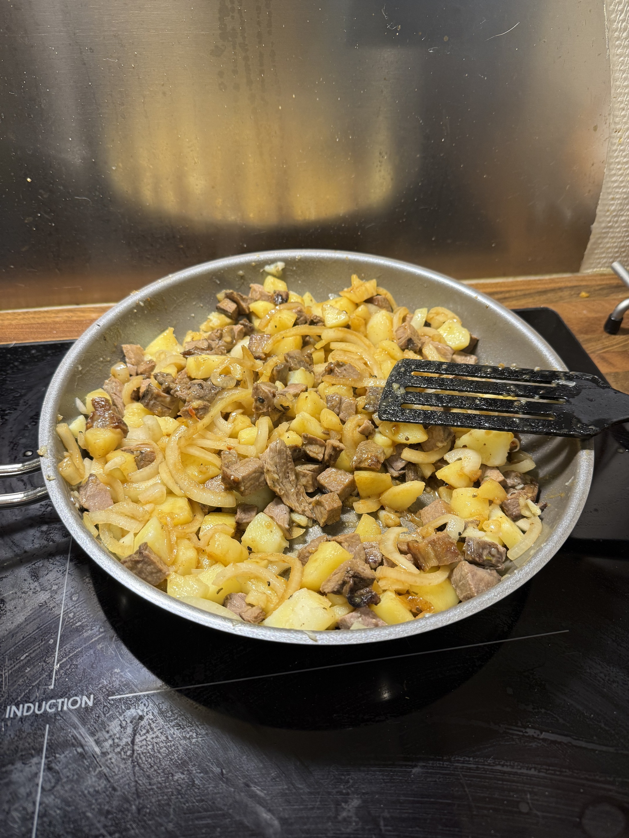 ) og de andre fik også and (andefedt generer min galdeblære, så rører den ikke) og så var der både brunede og hvide og franske kartofler, sovse af begge slags kød og syltede grøntsager.