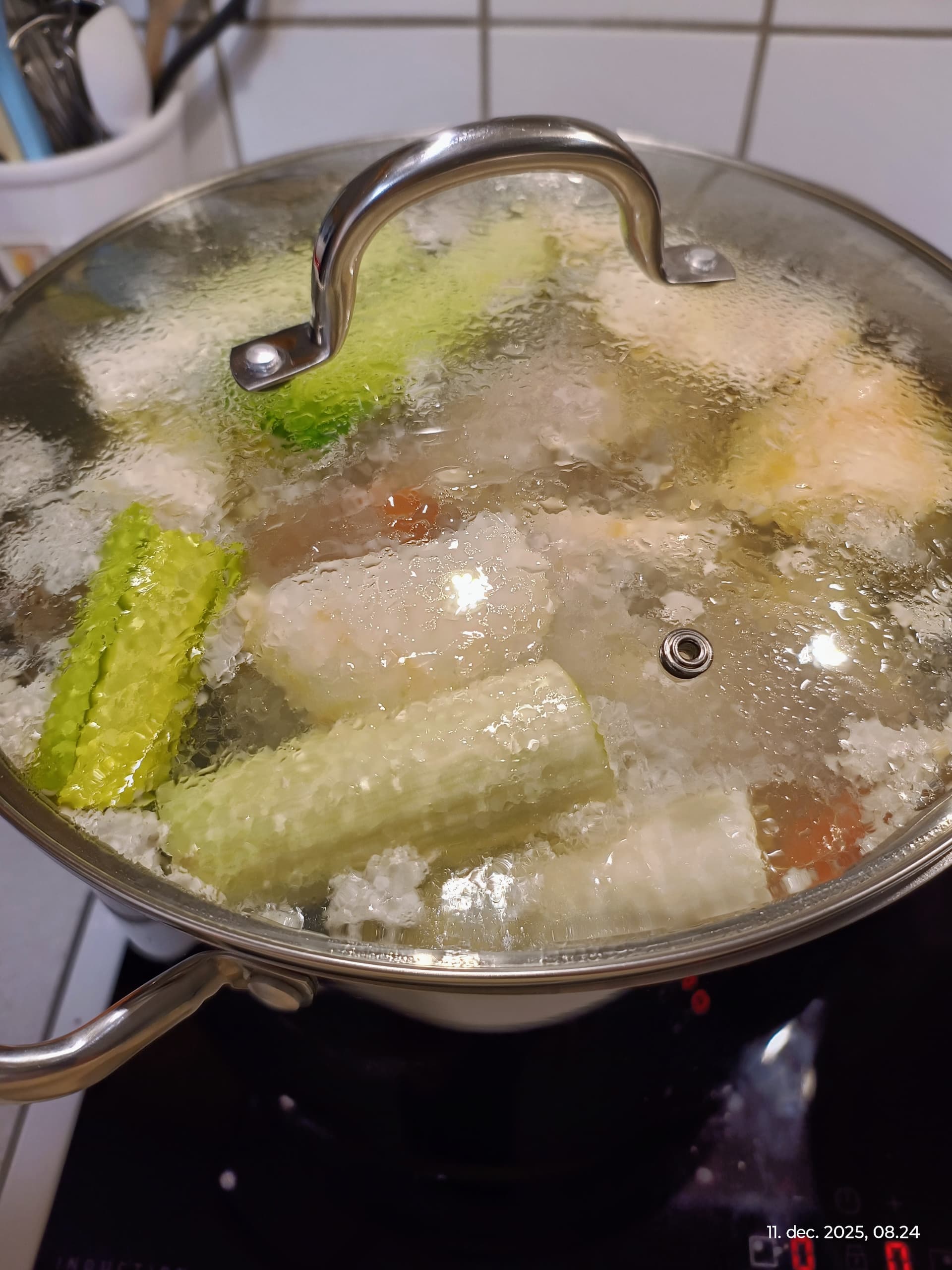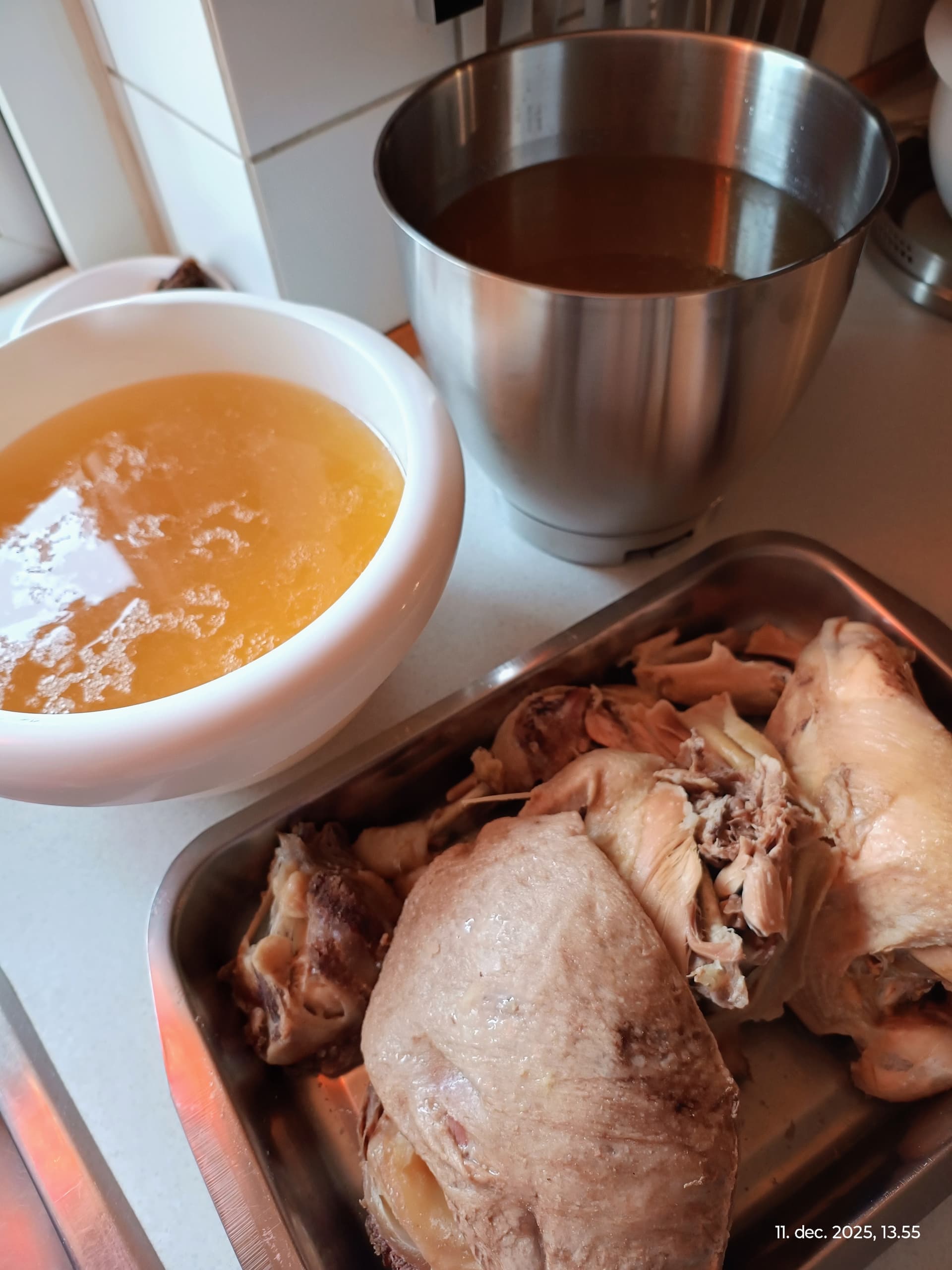 Kan ikke finde en tråd med mad i december, så nu laver jeg altså en. For jeg stod tidligt op i dag, for at sætte en ordentlig omgang suppe over. Hentede en godt tre kg. suppehøne i går og nu ligger den i min 15. l suppegryde, sammen med et kraftben, et stykke kalvespidsbryst og diverse grøntsager. Familien er inviteret til at komme og spise suppe og tarteletter den 20. og jeg håber jeg også har energi nok til selv at lave kød- og melboller.
