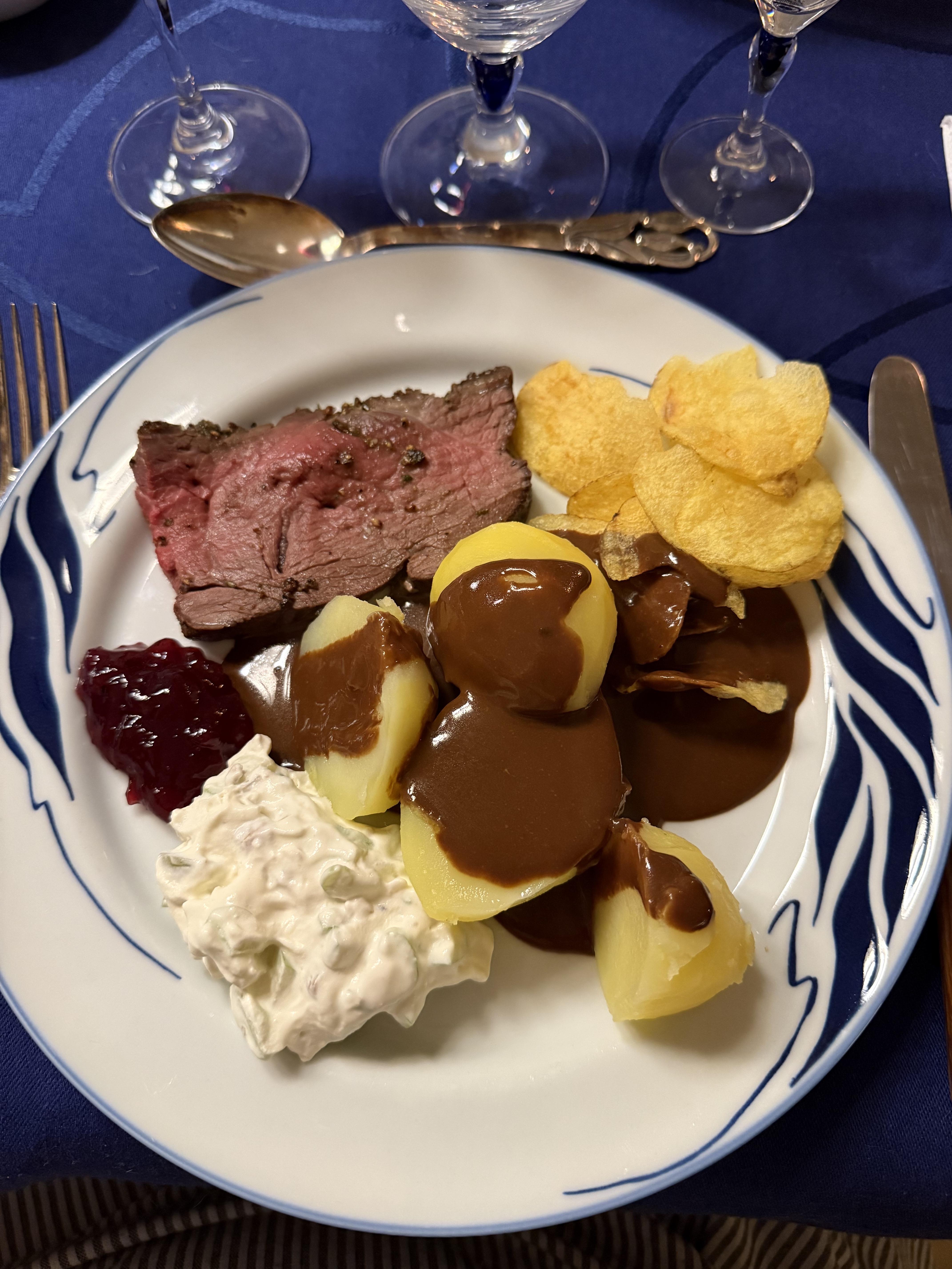 Jeg tog ingen billeder af maden, men vi fik lammekølle som desværre skrumpede en del under stegningen (så ingen rester til mig