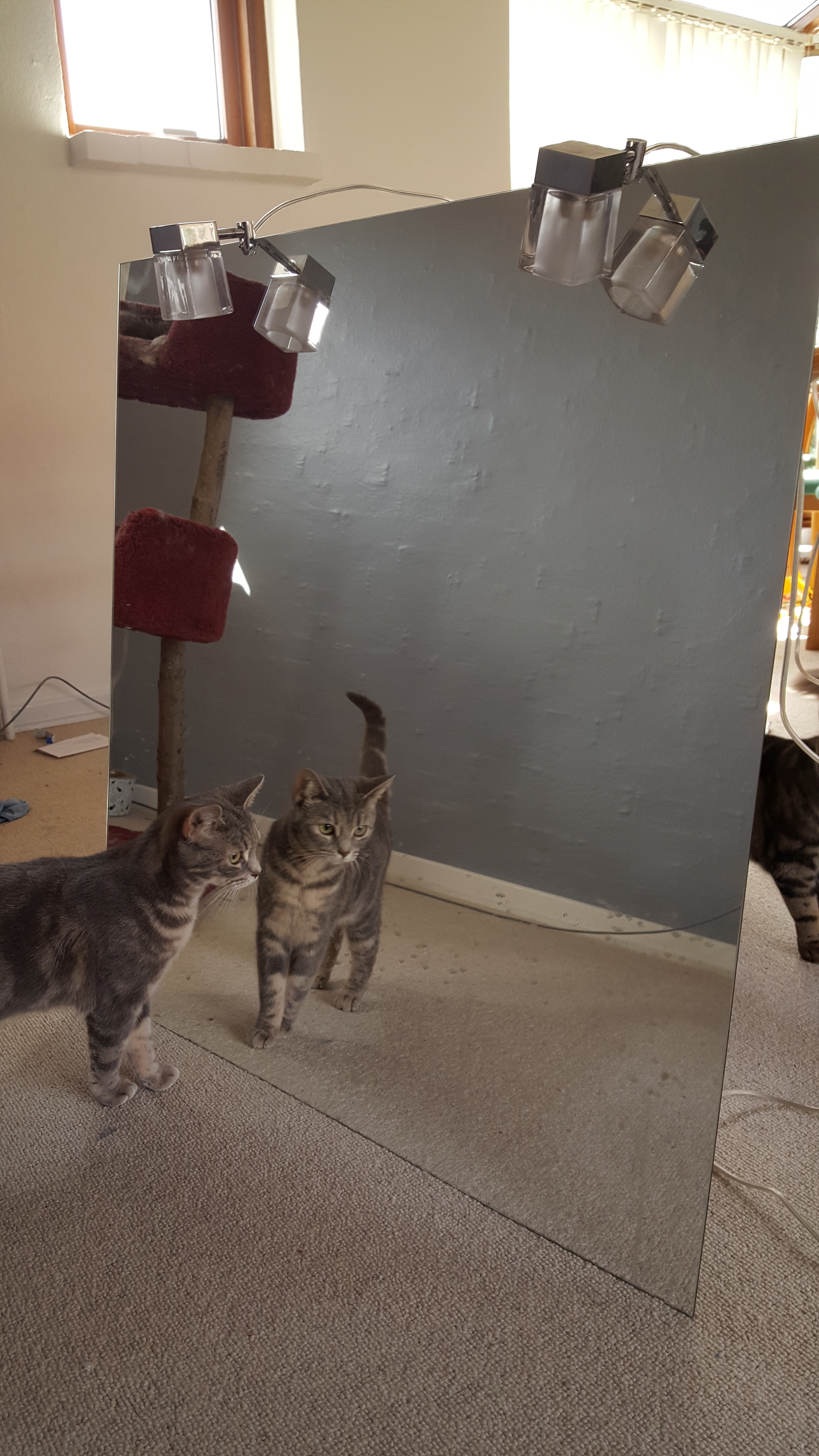 Badeværelsesspejl, b: 78 h: 86. Nyt spejl købt hos HTH - har ikke været monteret. De 2 lamper kan let afmonteres, hvis ikke man er til lamper; de sidder på kanten og fastholdes med en lille skrue. Kat ikke inkluderet ![]()