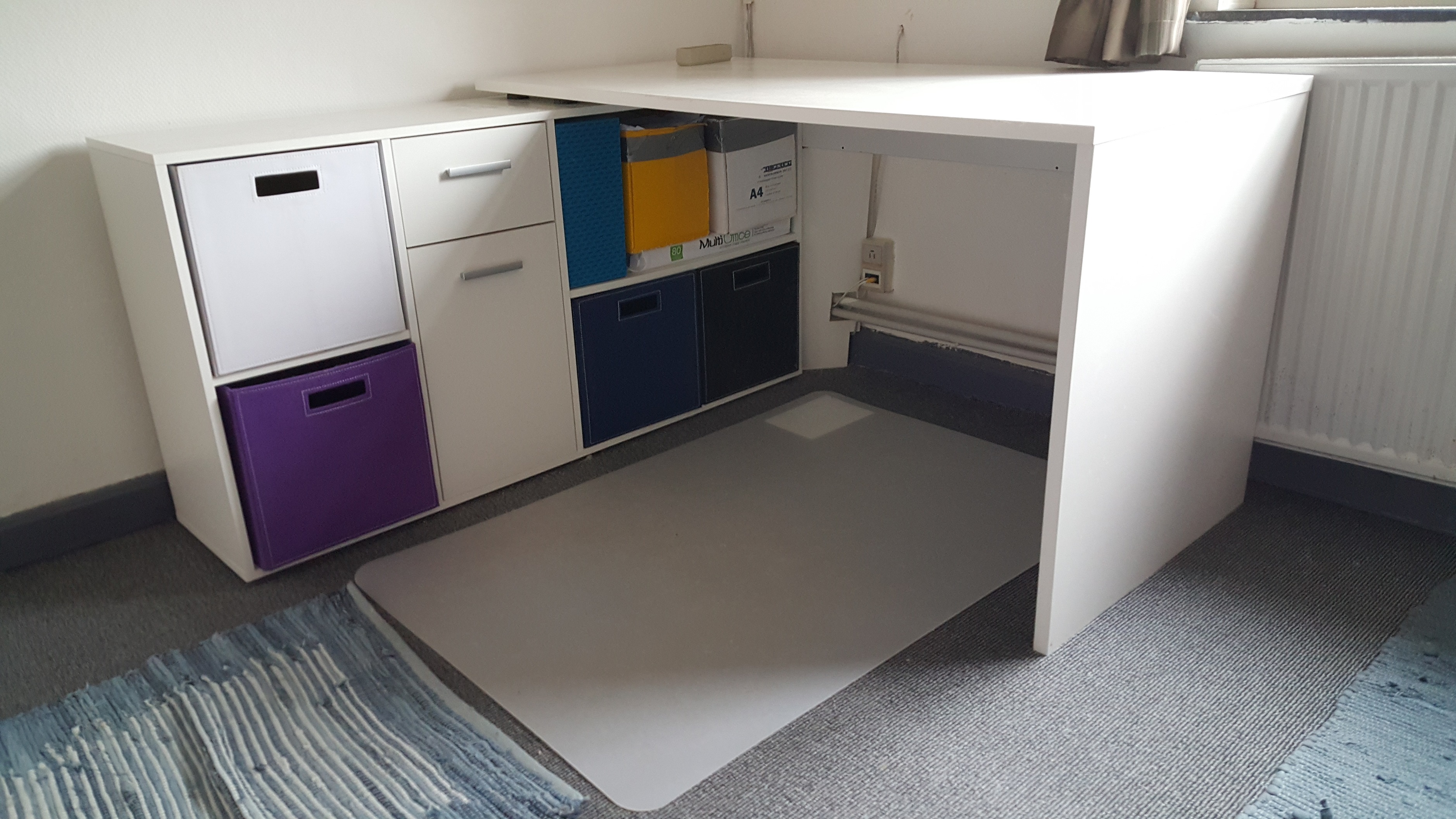Skrivebord i hvid laminat. Opstillet i vinkel, men kan også opstilles som ét langt arrangement.