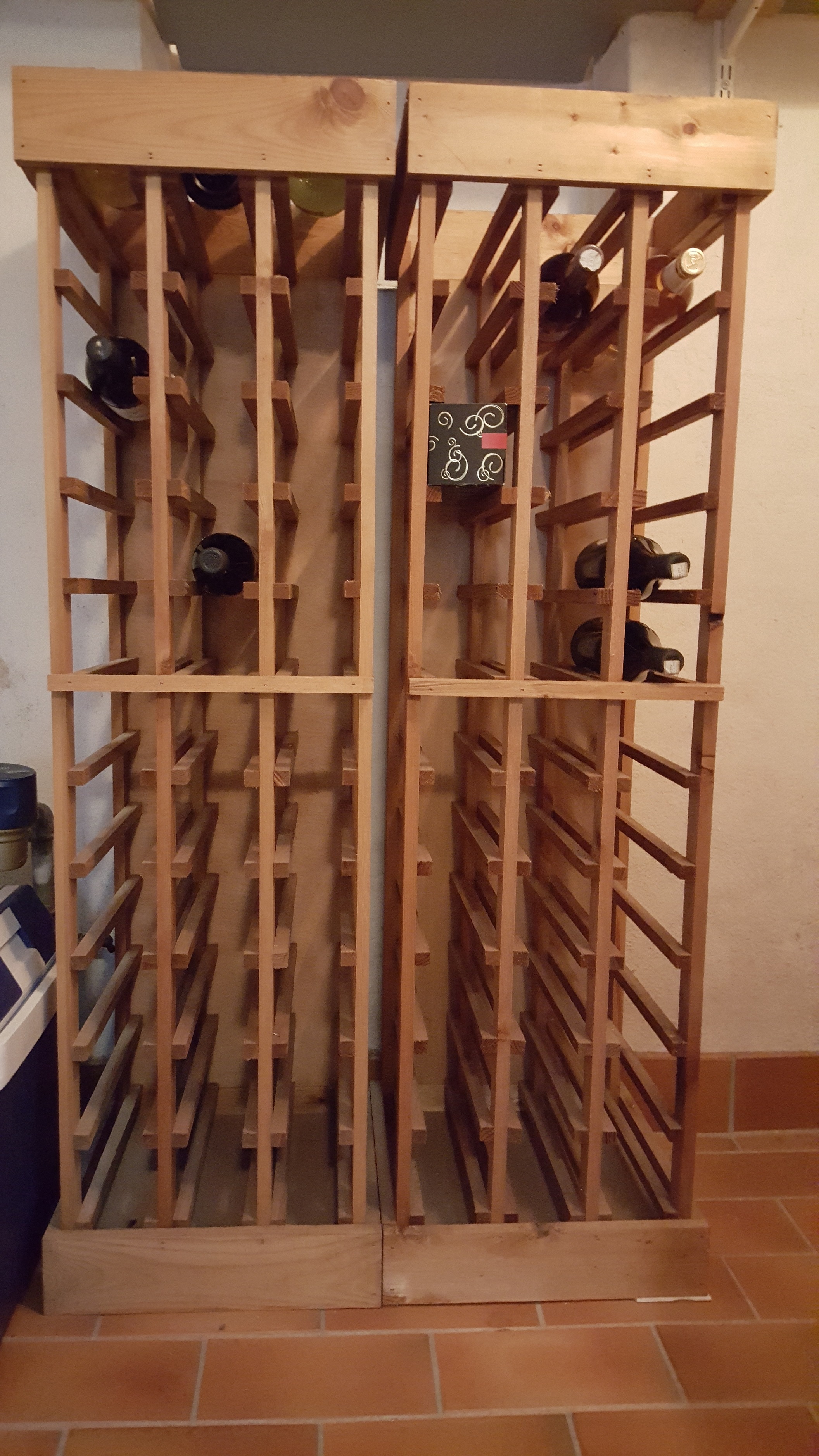 Vinreoler i træ; kan holde 36 flasker hver. Højde 1,32 m, bredde og dybde 0,38 m.