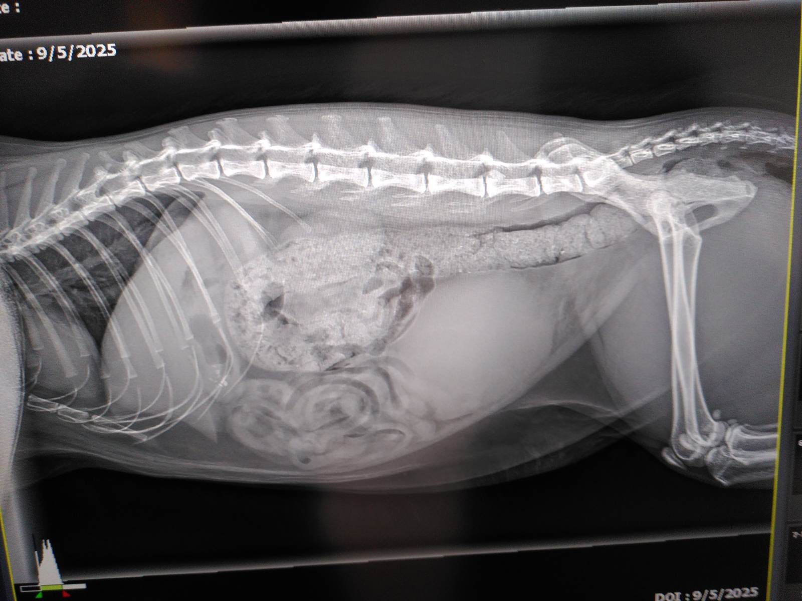 Vi tog til dyrlæge og aftalte at han skulle have noget beroligende og have taget billeder af lænden. Jeg var nødt til at køre i stalden fordi der kom smed til min hest. Så stod midt i at hente hest ind fra fold og gøre klar til smed da dyrlægen ringede tilbage med besked om at røntgenbillederne viste en overfyldt blære, helt fuld tarm og en stor massiv indvækst i rygkanalen ved den 6. lændehvirvel. Hun kunne ikke sige noget om det var knogledannelse eller en tumor, men den var så stor at hun ikke mente der var noget perspektiv i yderligere behandling og hun ville anbefale at han blev aflivet inden han nåede at vågne fra bedøvelsen. Så min mand kørte ned og var der da han fik den sidste sprøjte og tog ham med hjem så jeg og de andre katte kunne sige farvel til ham og vi kunne begrave ham ude i vores have, som han elskede.