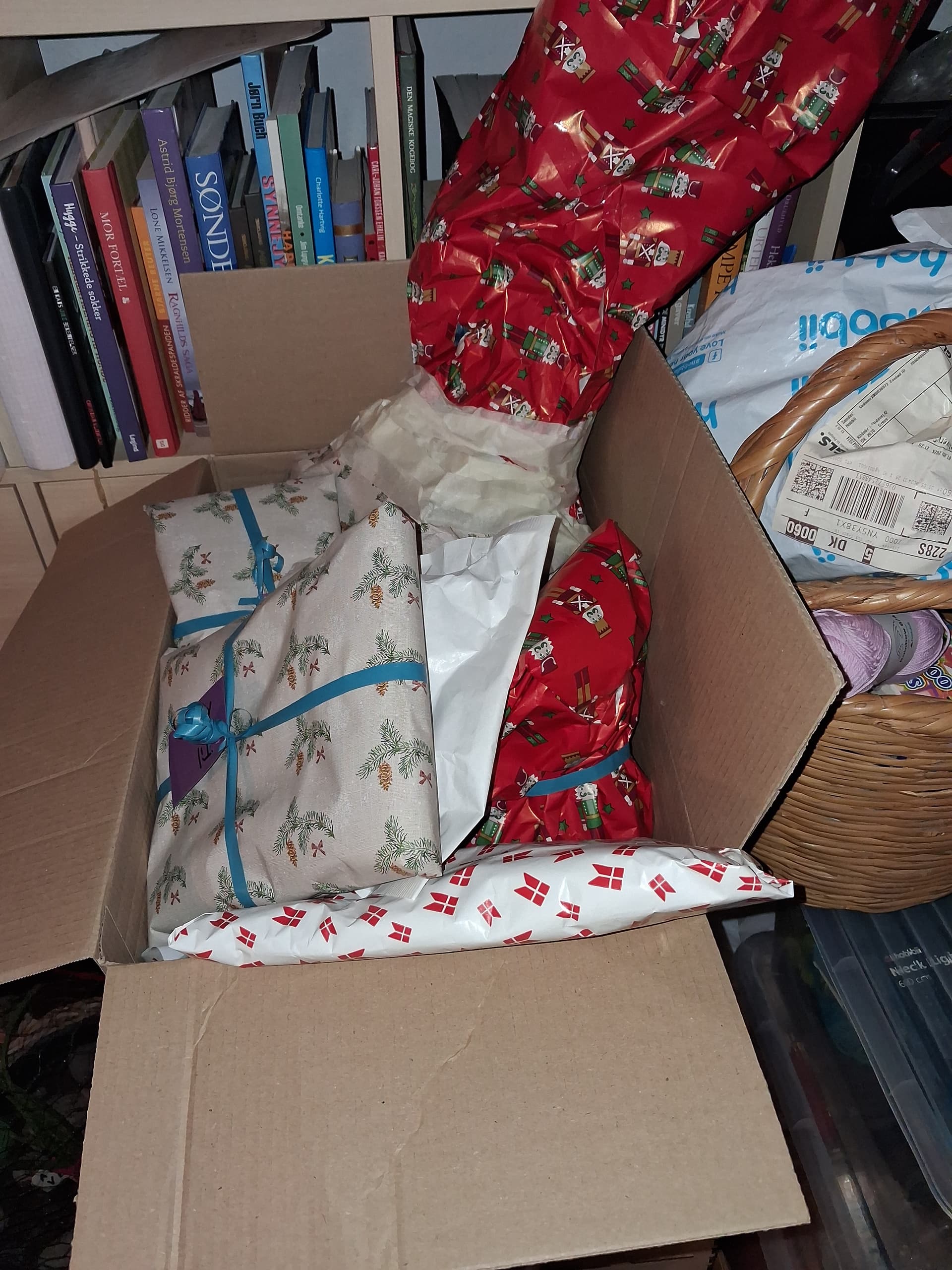 I går fik kattene overbevist mig om, at jeg da skulle pakke en af mandens gaver ind uden kassen den kom i for at de kunne lege i den, så nu er hans julegaver pakket ind