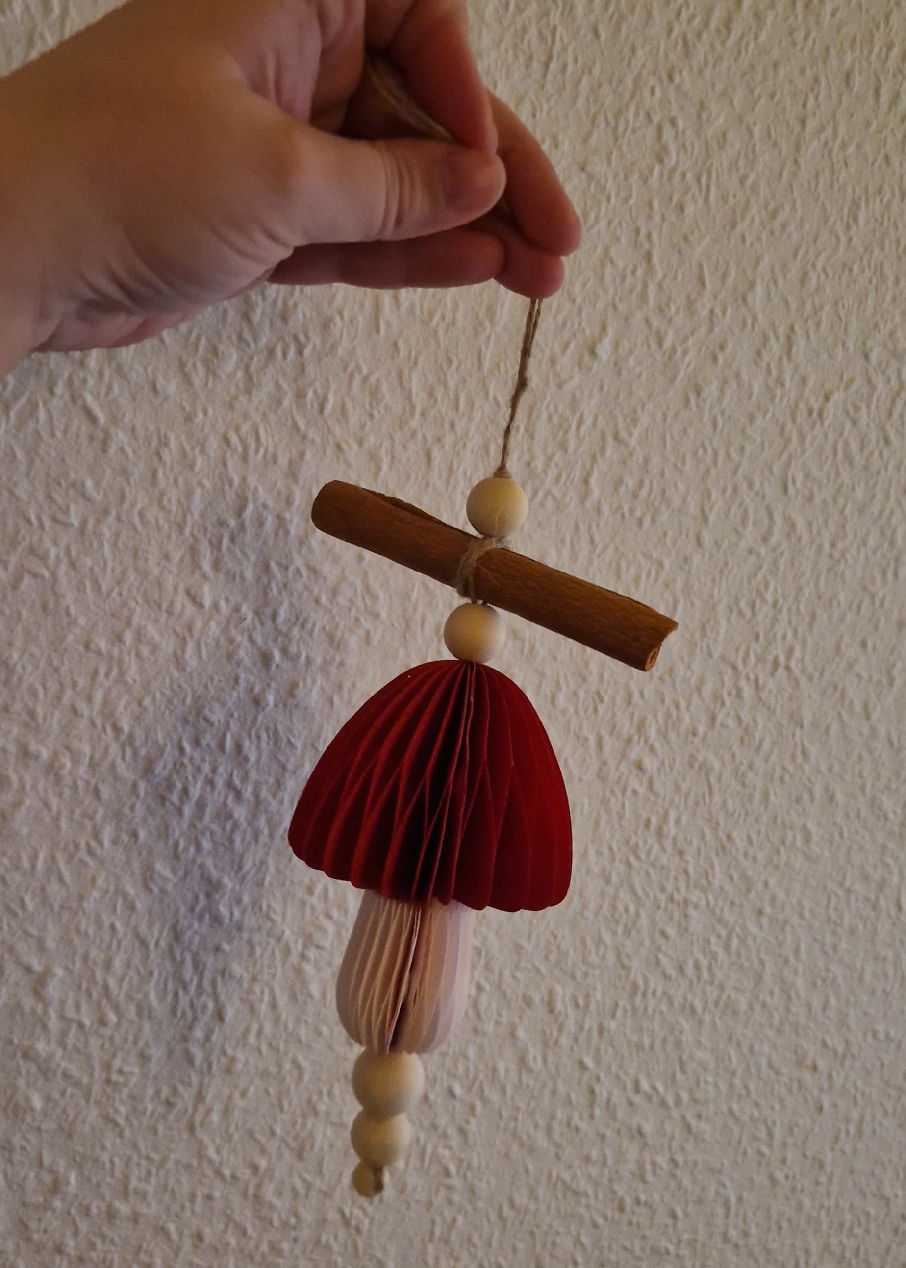 Fandt nogle søde svampe i søstrene grene, så lavede et lille ophæng med nogle træperler, en stang kanel og og lidt jutesnor.