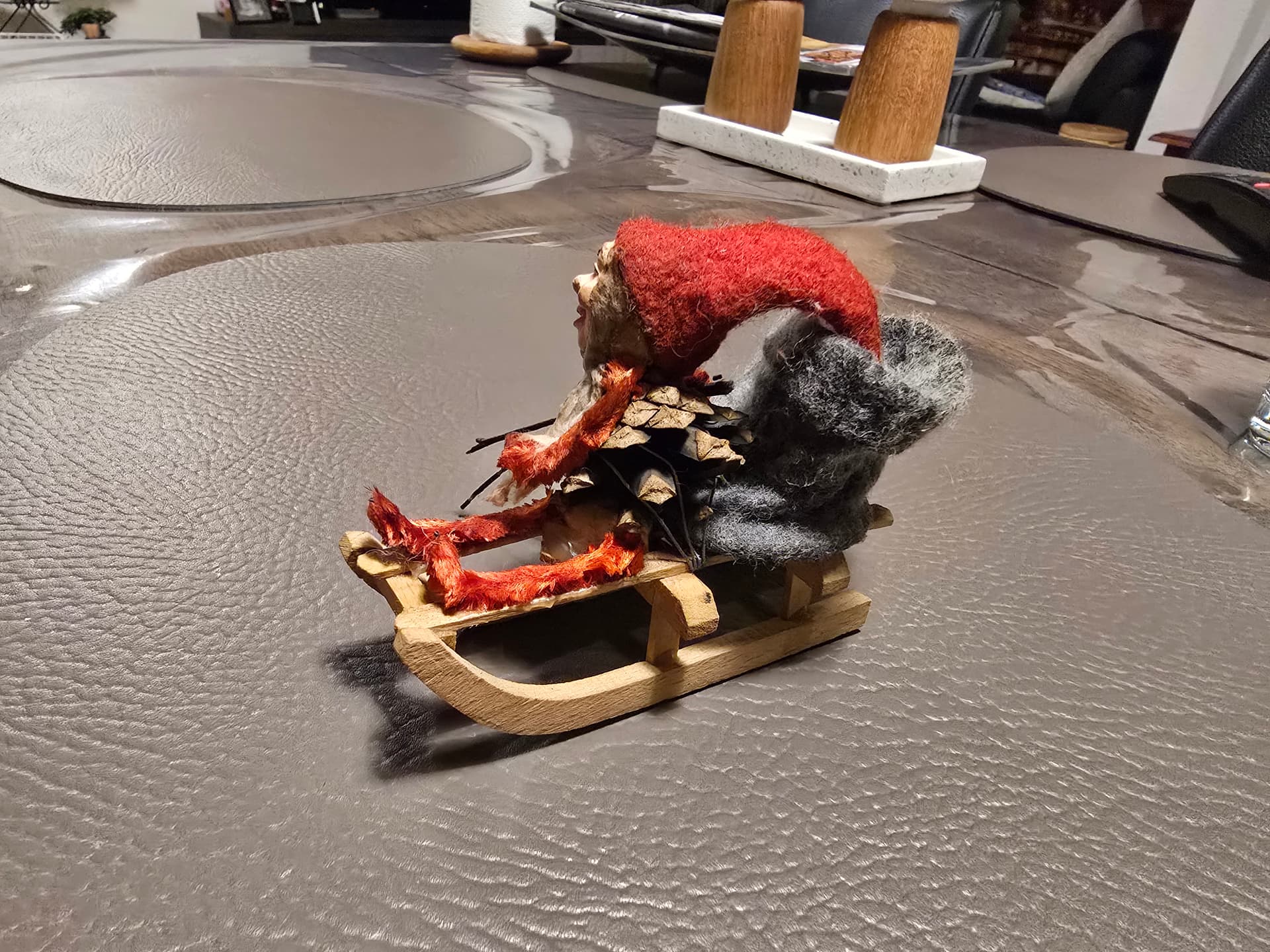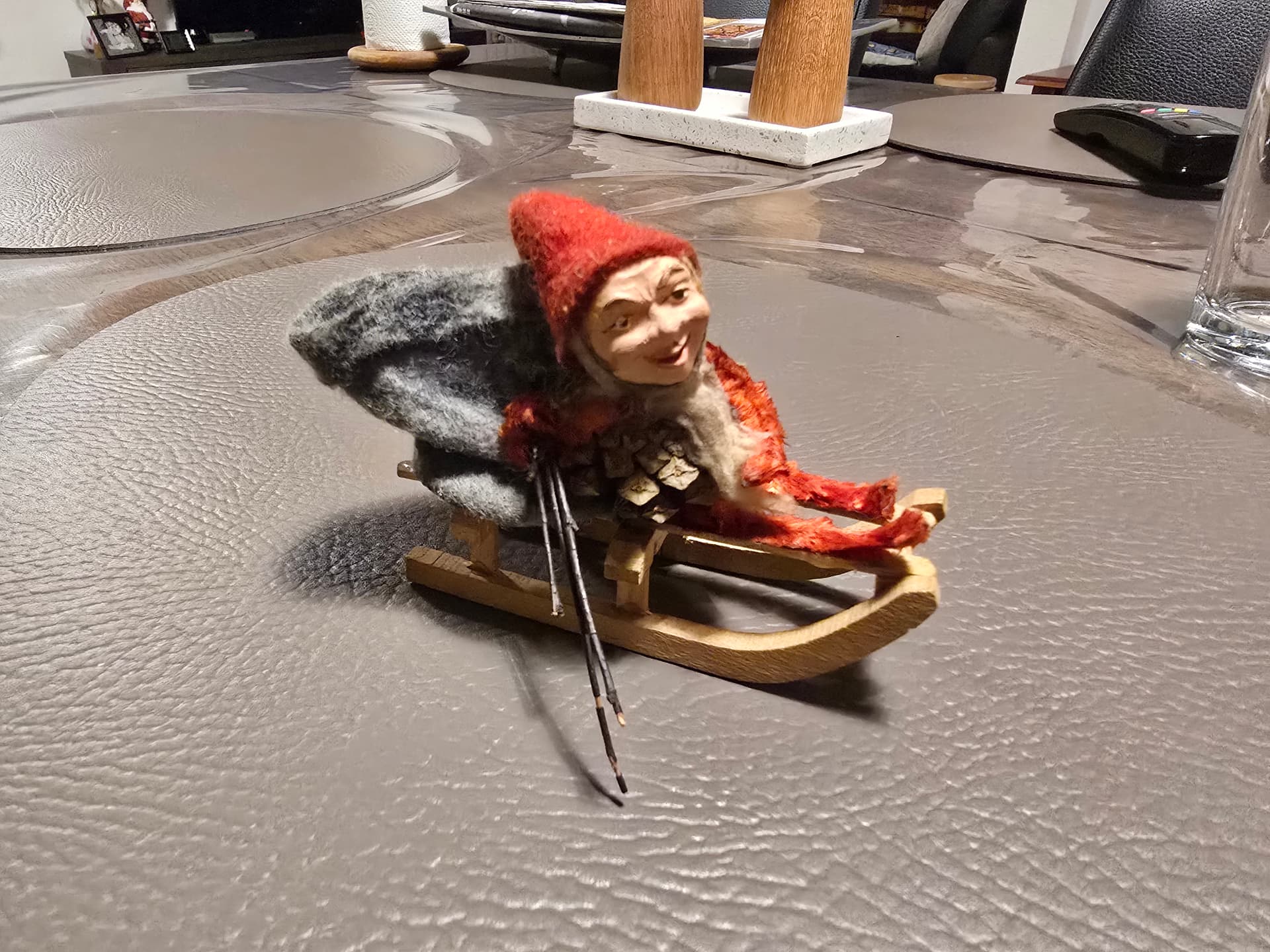 Han er omkring de 100 år gammel og stammer fra min første mands bedsteforældre. Jeg fik ham, sammen med en masse andet gammelt julepynt, da de døde for omkring 50 år siden. Siden han flyttede ind hos mig, bor han ved fjernsynet. Før i tiden havde han sin plads ovenpå fjernsynet, men nu må han nøjes med at bo under det ![]()
