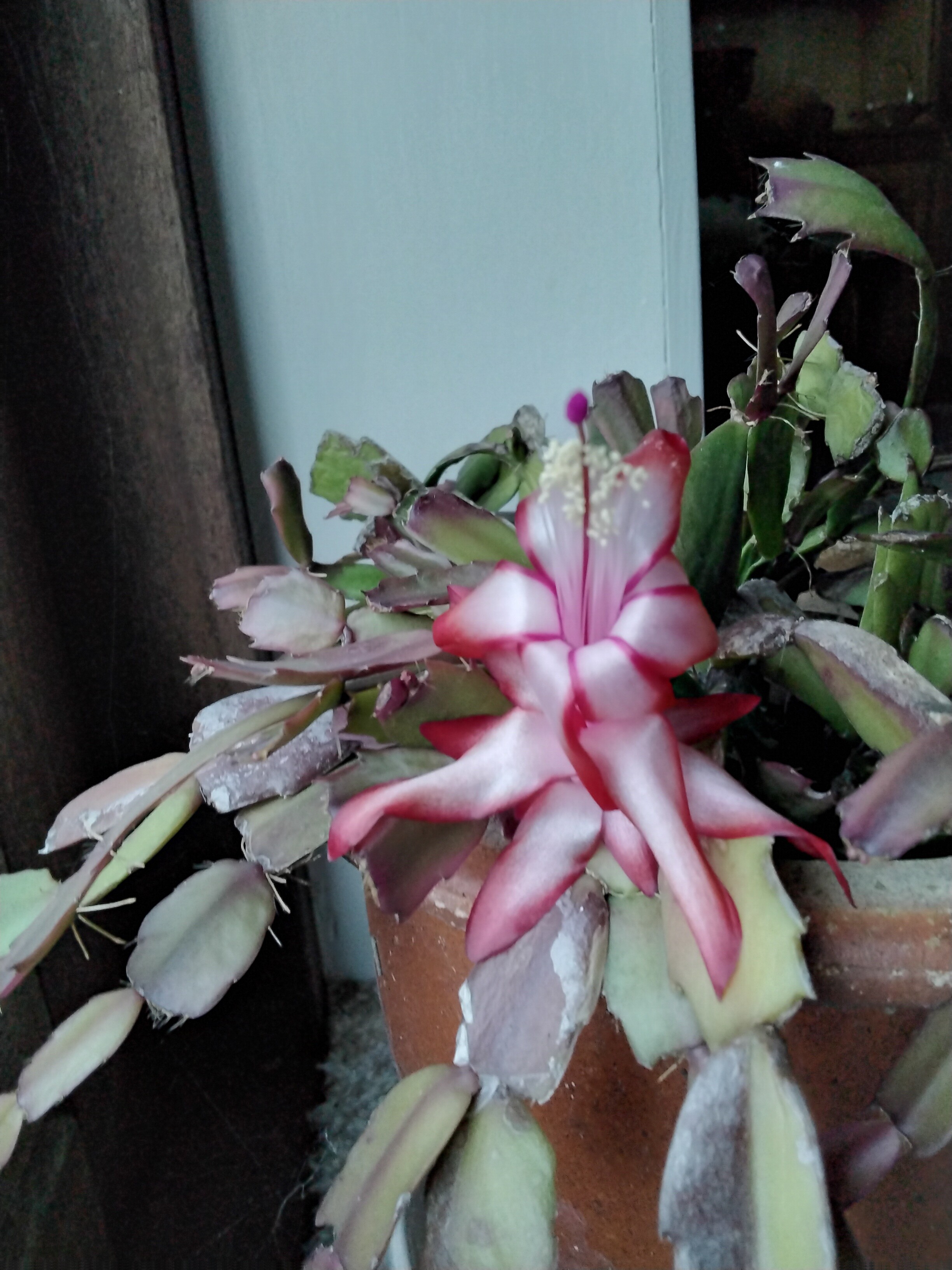 Denne her jule kaktus, har nogle år på bagen, for 3 år siden var den sådan set gået ud, men nu er der blomst i den igen, godt nok kun en men den er der, tja kunne måske smidt den ud og købt en ny, det var meget nemmere, men slet ikke det samme