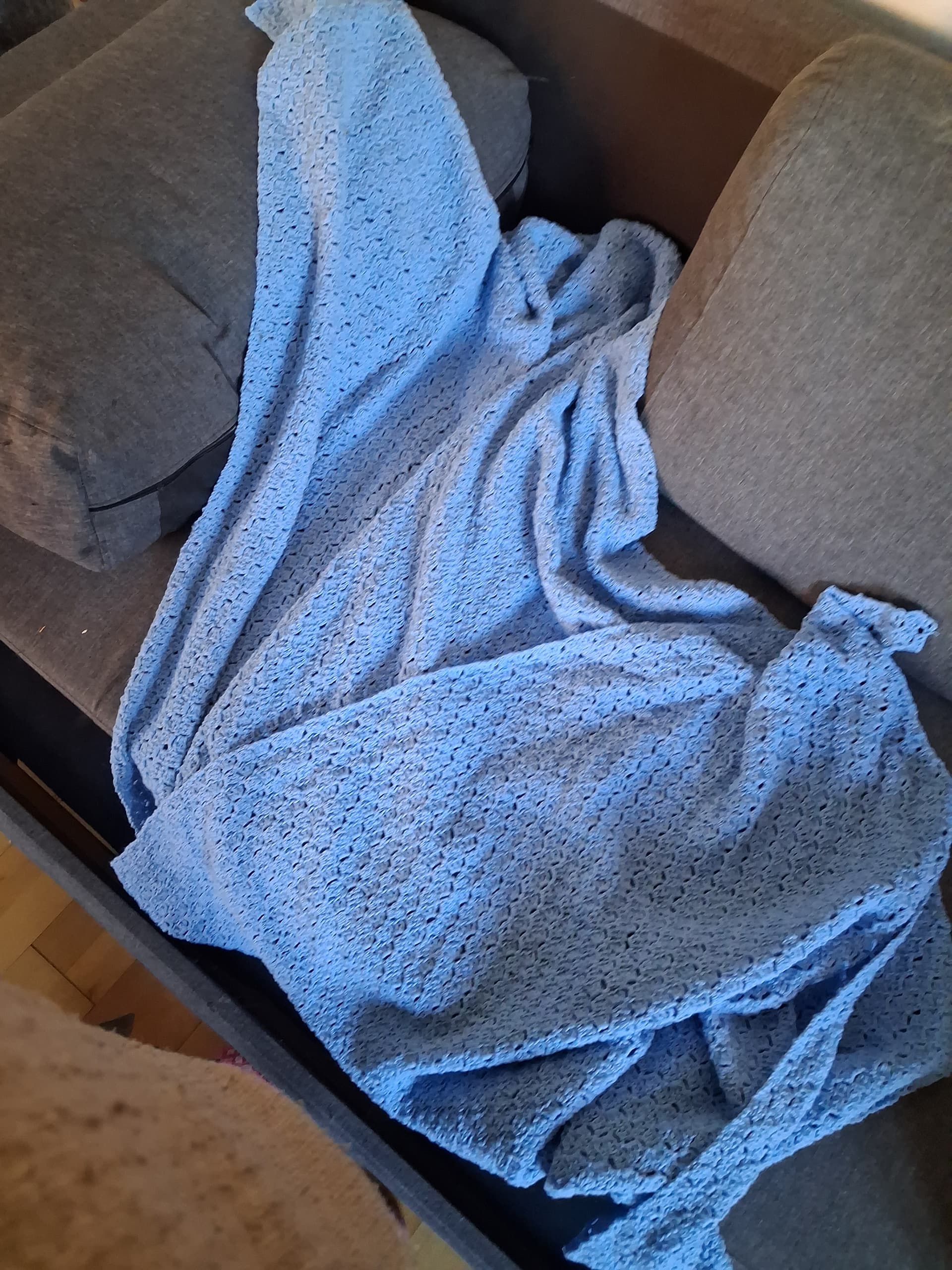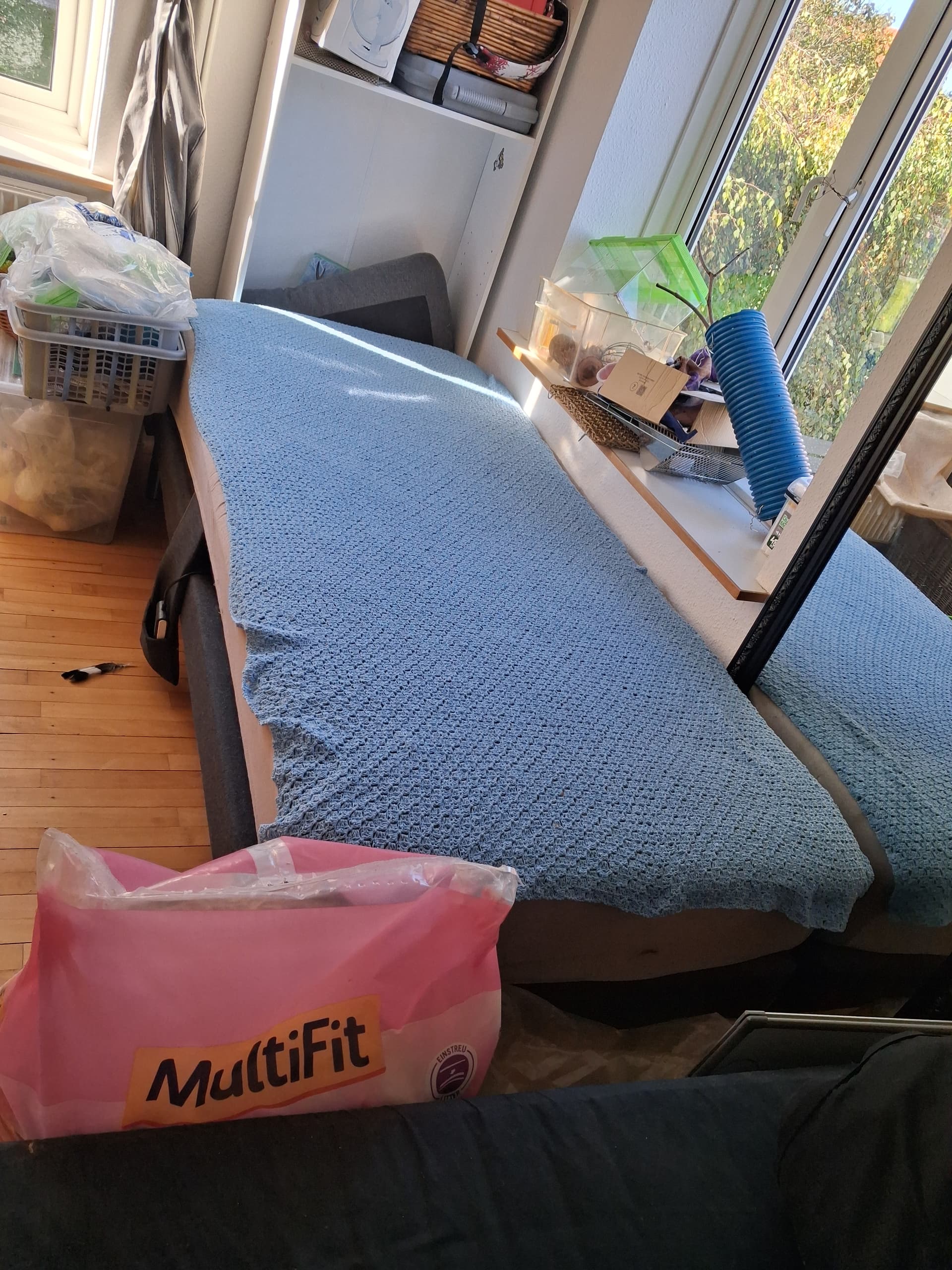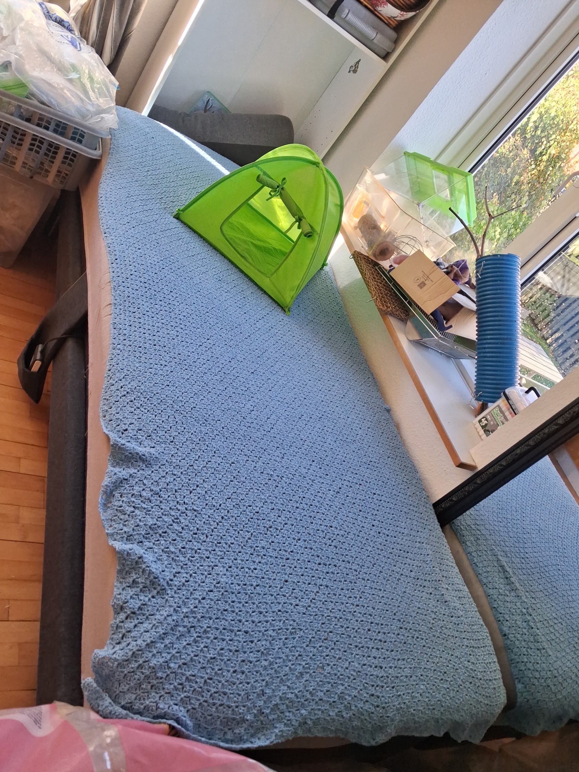 Jeg har lavet et tæppe til Katjas seng, så der ikke kommer SÅ mange kattehår på den (Det er der kattene sover om natten og Aslan også i dagtimerne)