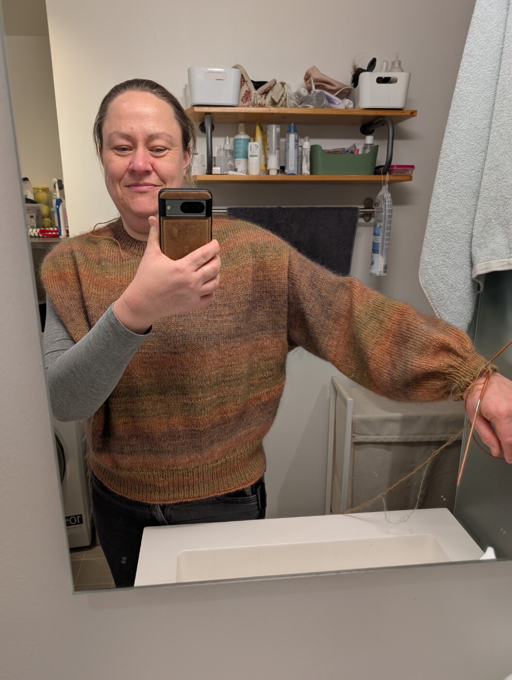 Den bliver så lækker.Den er strikket i 2 tråde, det er følgetråden - silk-mohair - som danner farvespillet. Hovedtråden er karamel-farvet.