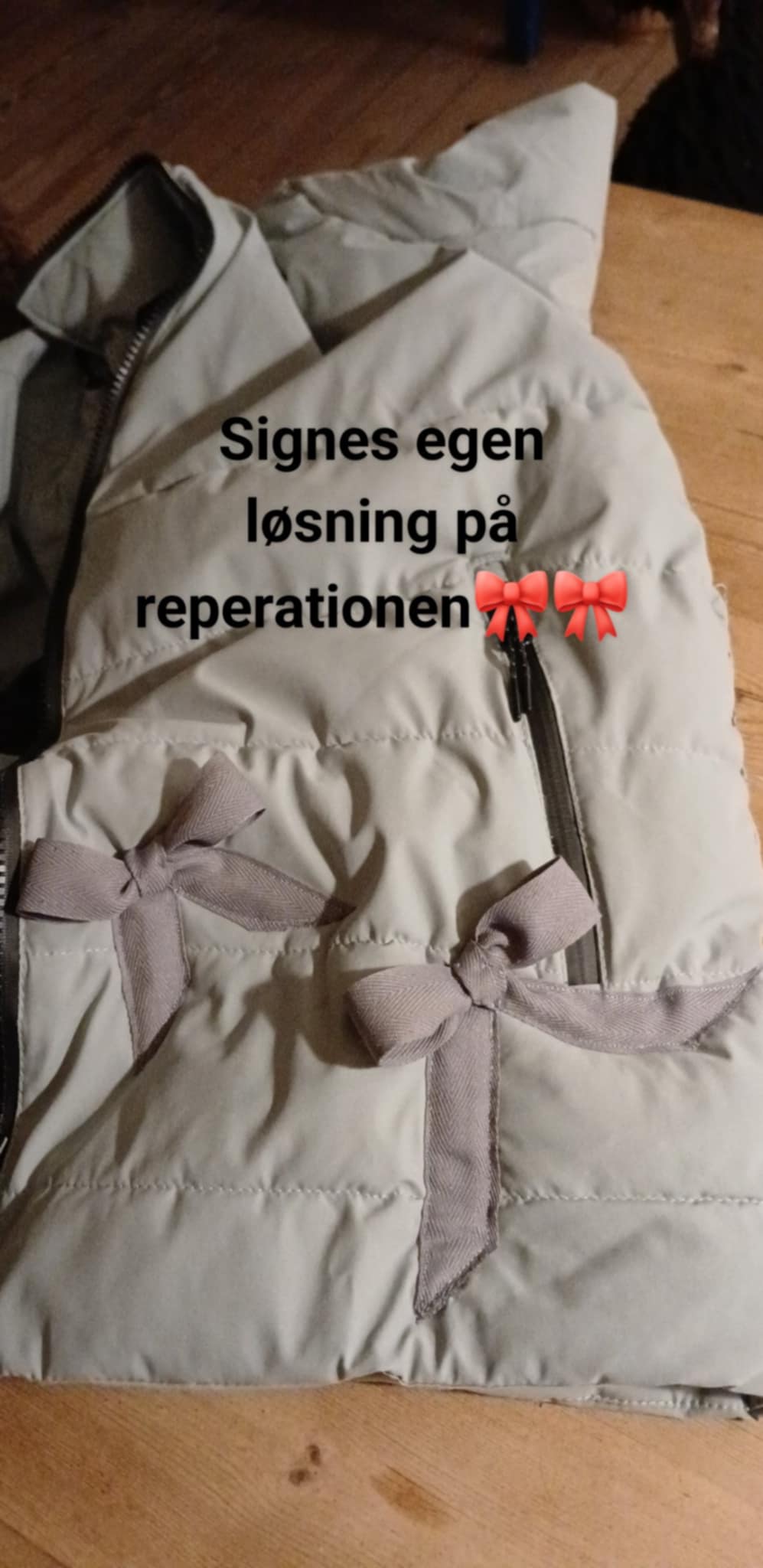 Blev ringet op i går, hun havde fået revet hul på hendes nye vinterjakke. De skulle bruge lidt vejledning i hvordan det ville være bedst at reaperere.