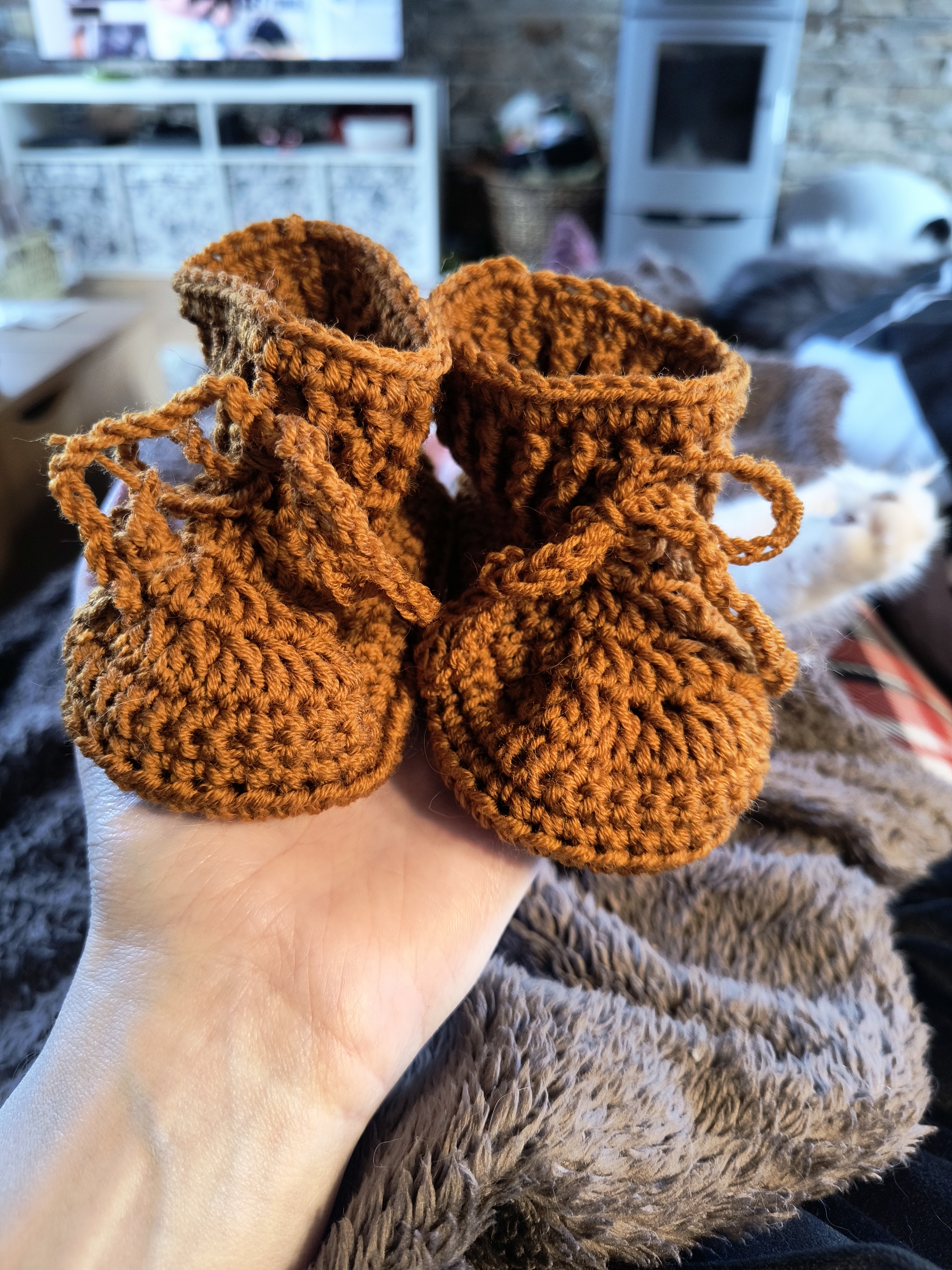Jeg hæklede for nogen tid siden futter og luffer til vores egen lille fyr, men lufferne gik fra str 0-6 mdr og futterne fra str. 0-2 mdr, så resten af garnet gik til et par i str. 2-6 mdr - som har ventet en måneds tid på at få binde bånd ![]()