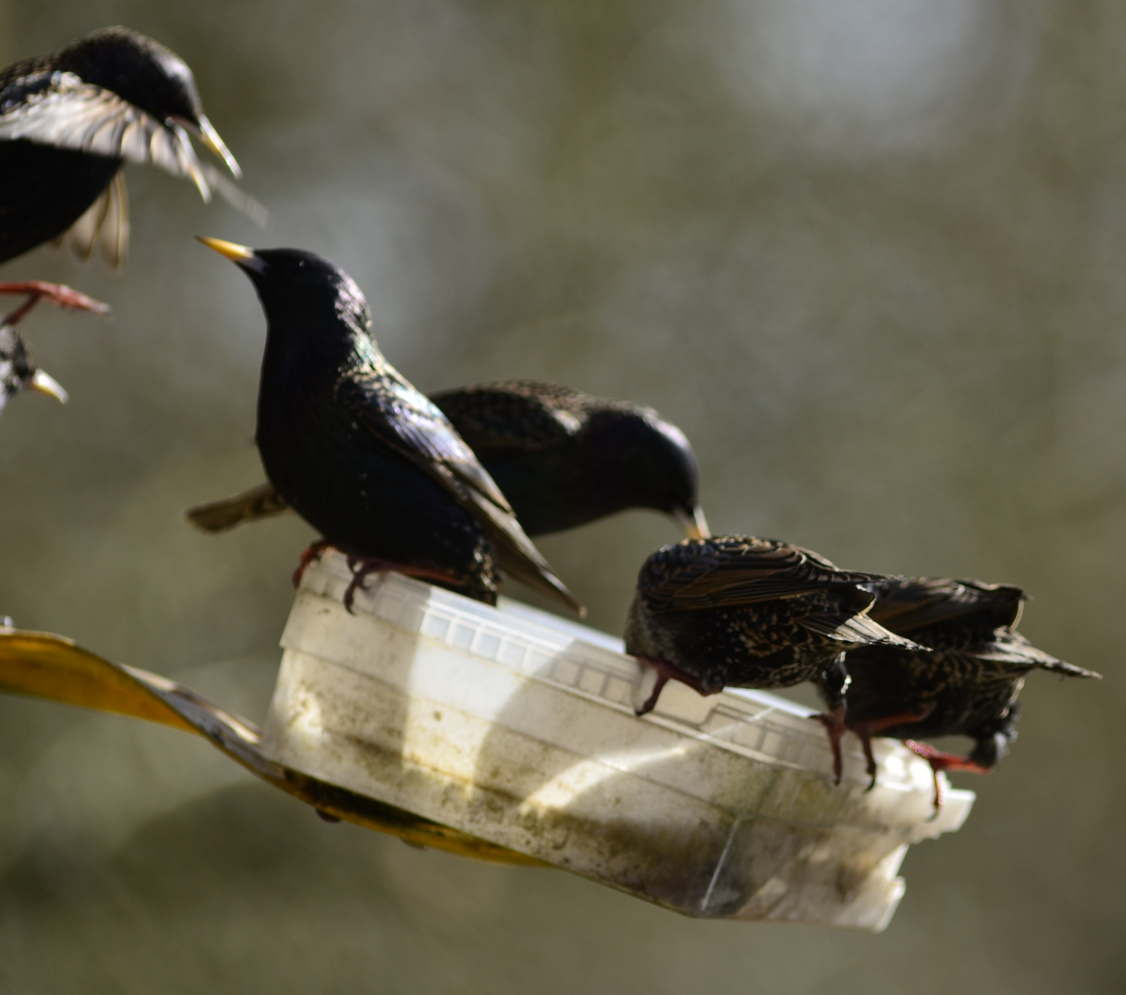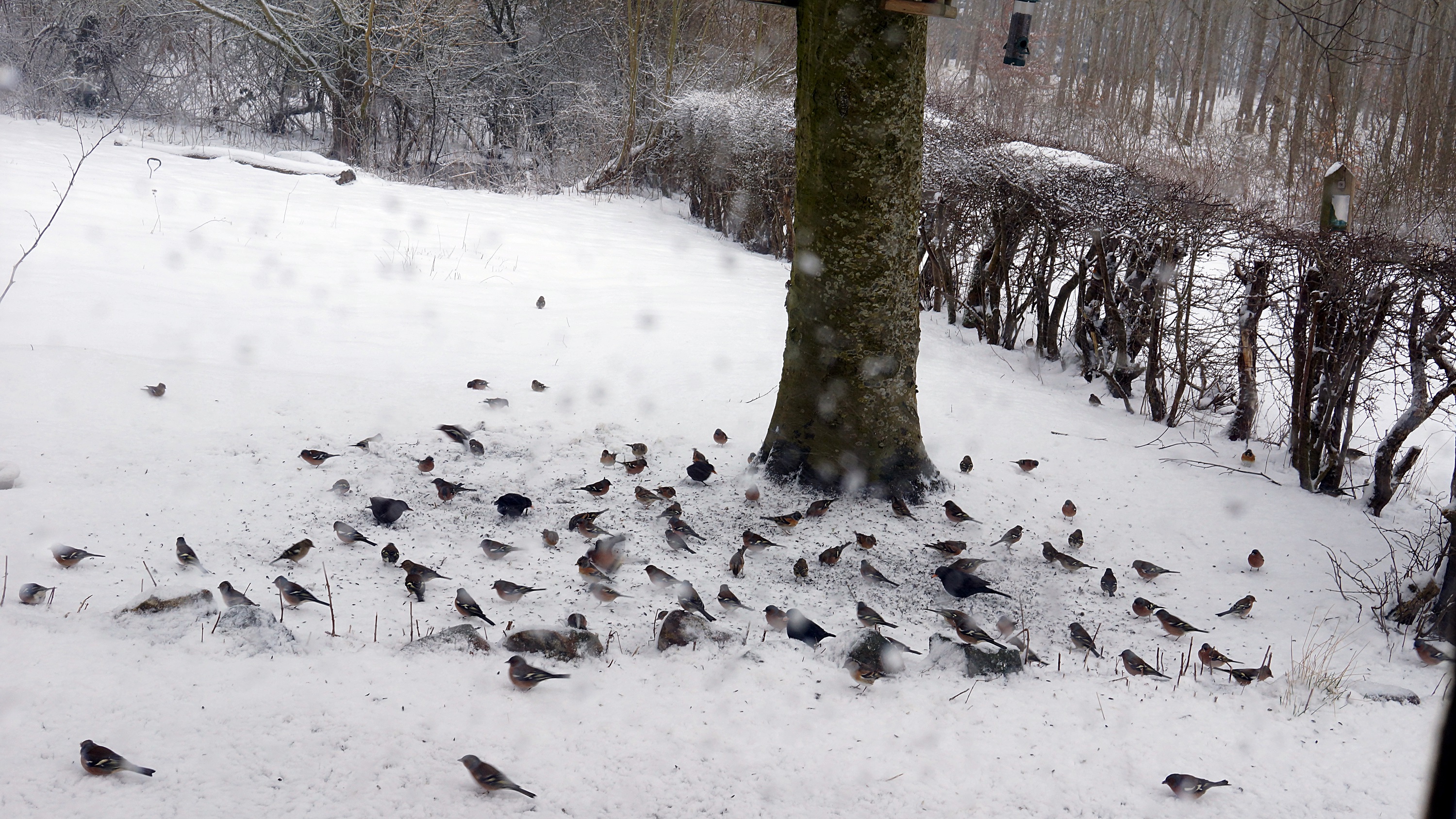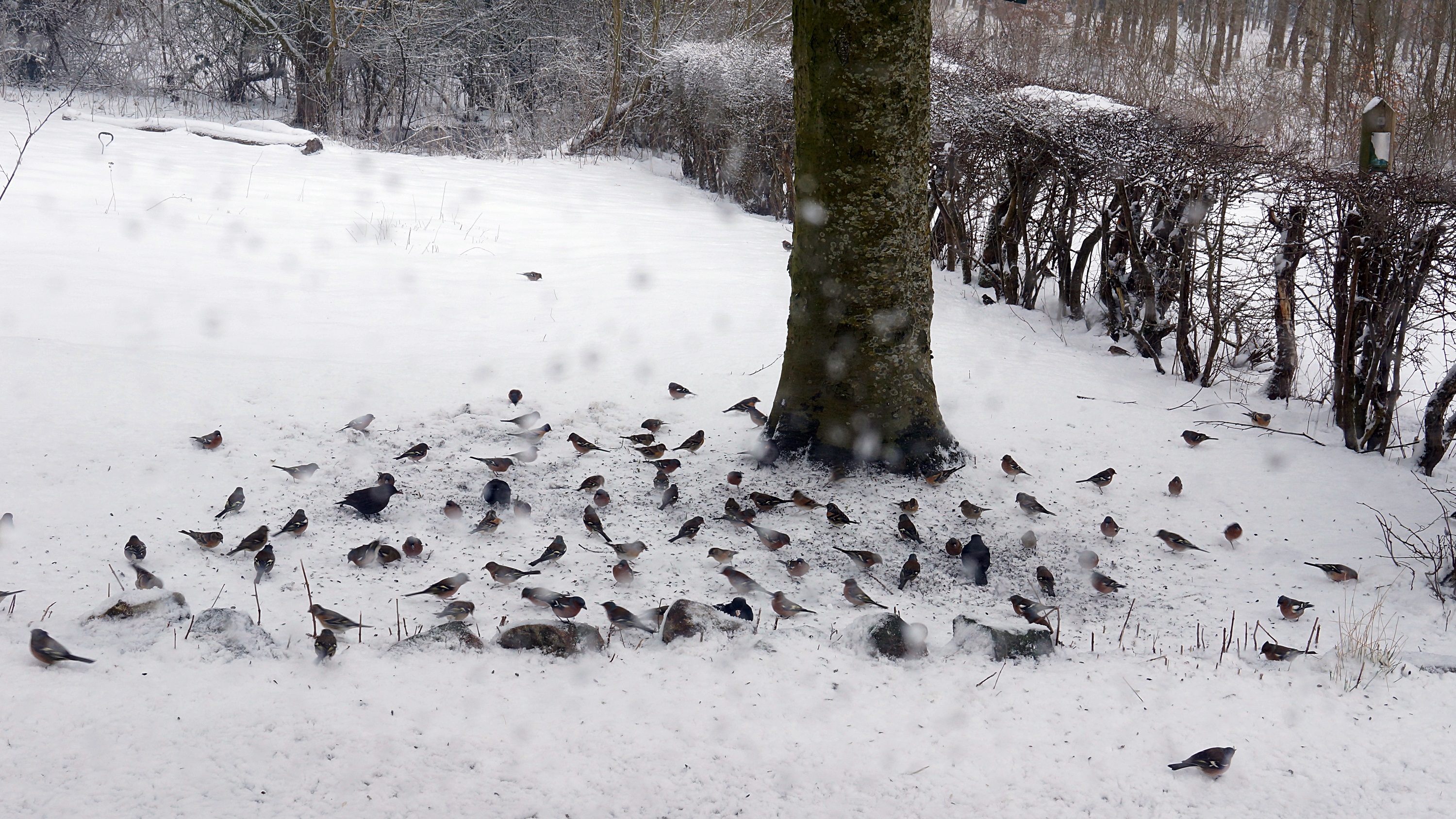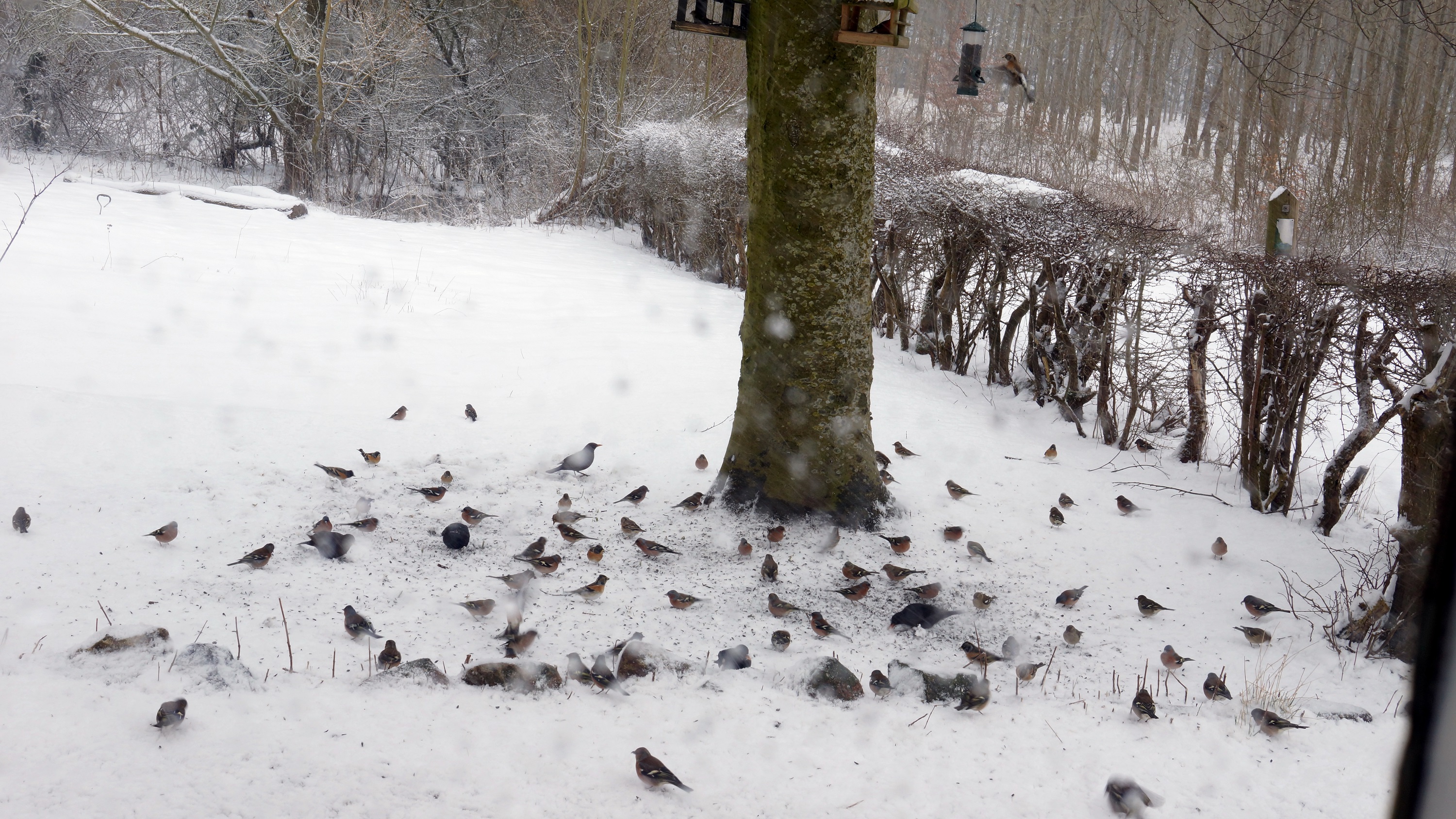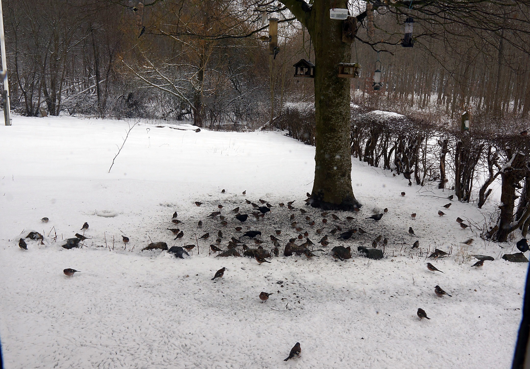 Jeg har lige været ude at fodre, og stort set med det samme, jeg var inde i køkkenet igen, var der mindst 15 solsorte herude