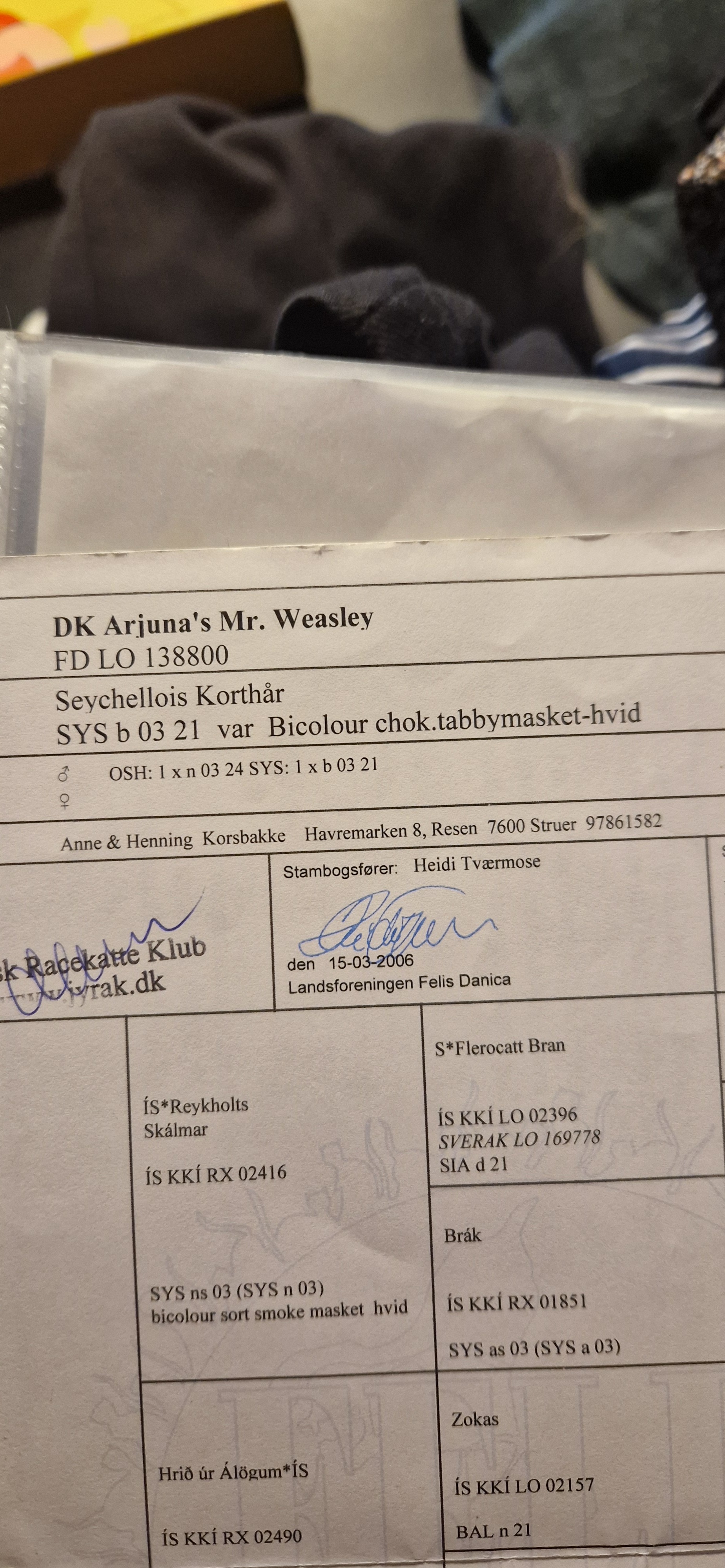 Mr fik sin tavle det år, hvid i siameser blev godkendt. Anne trak lige tiden med at søge stamtavlen, for at han kunne have en godkendt farve. For før 2006 ville han havde haft en ikke anerkendt farve og havde været riex, men efter 1 januar 2006 blev han fd lo.