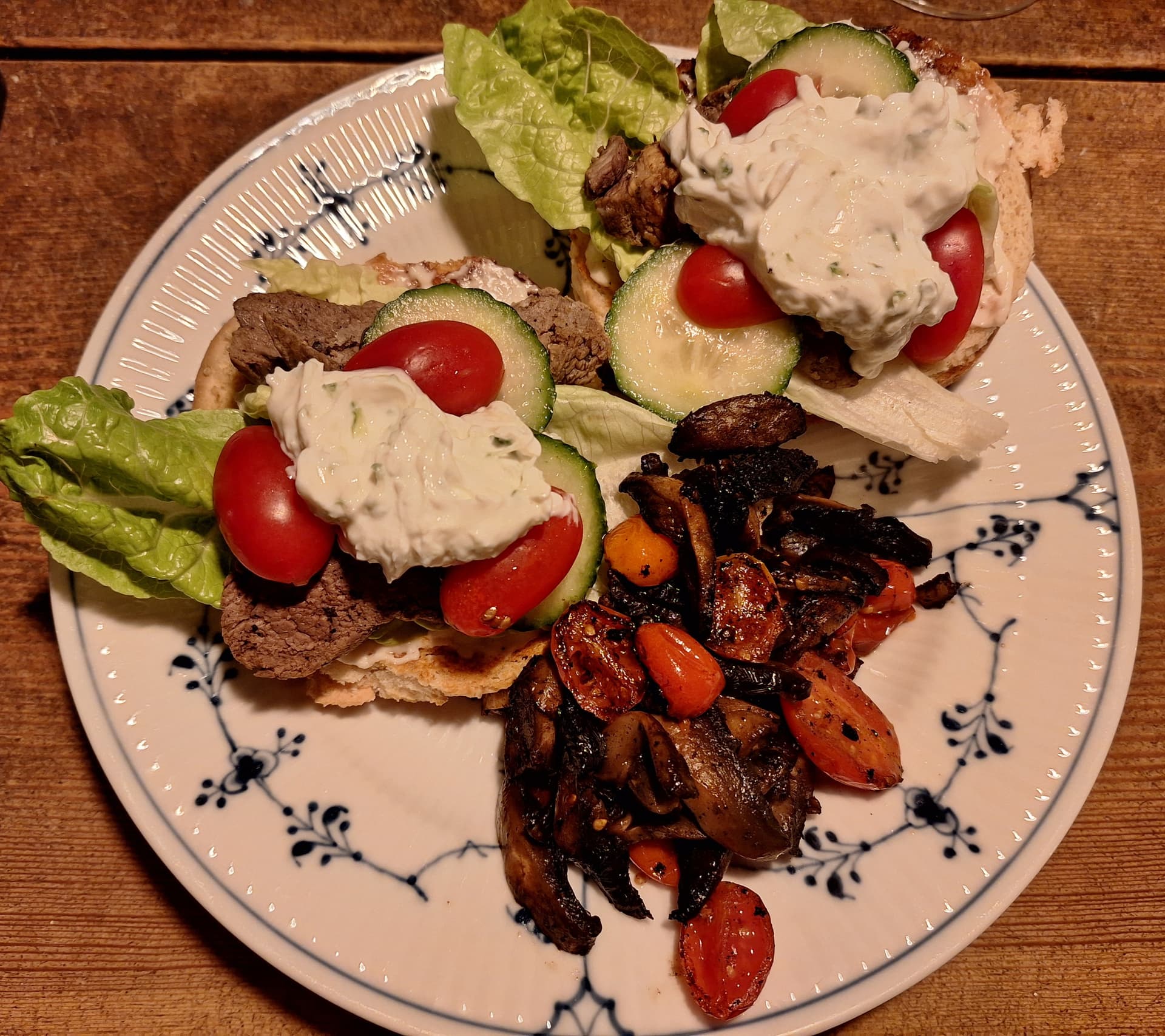 Den sidste rest lam fra nytårsaften blev i går til lammeburger med hjemmelavet tzatziki og tilbehør i form af stegte tomater (der var blevet runkne) og champignoner
