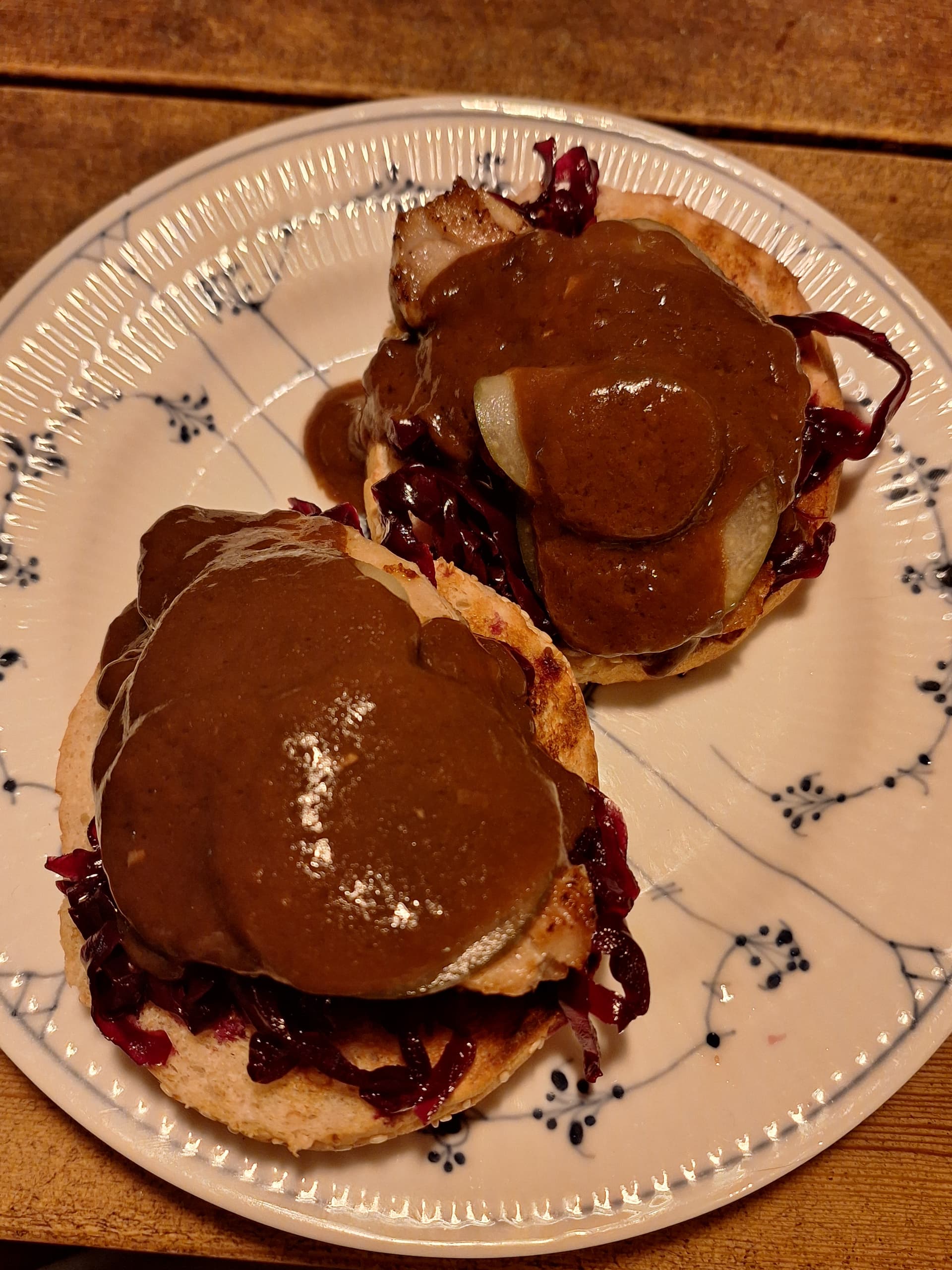 Op til jul køber jeg altid nogle af de billige flæskestege og skærer op i mindre portioner. Halvdelen af den første portion tilsat en rest hjemmelavet rødkål, hjemmelavet andesovs, lidt agurkesalat og en nyindkøbt burgerbolle blev til en lækker aftensmad idag.