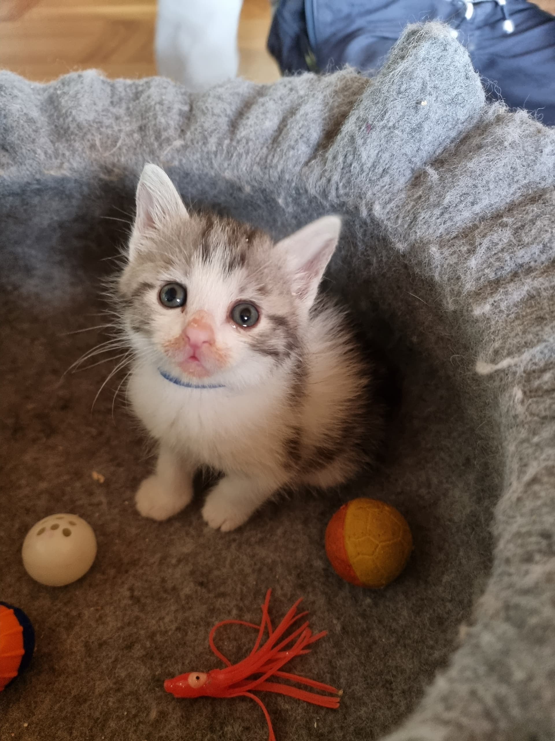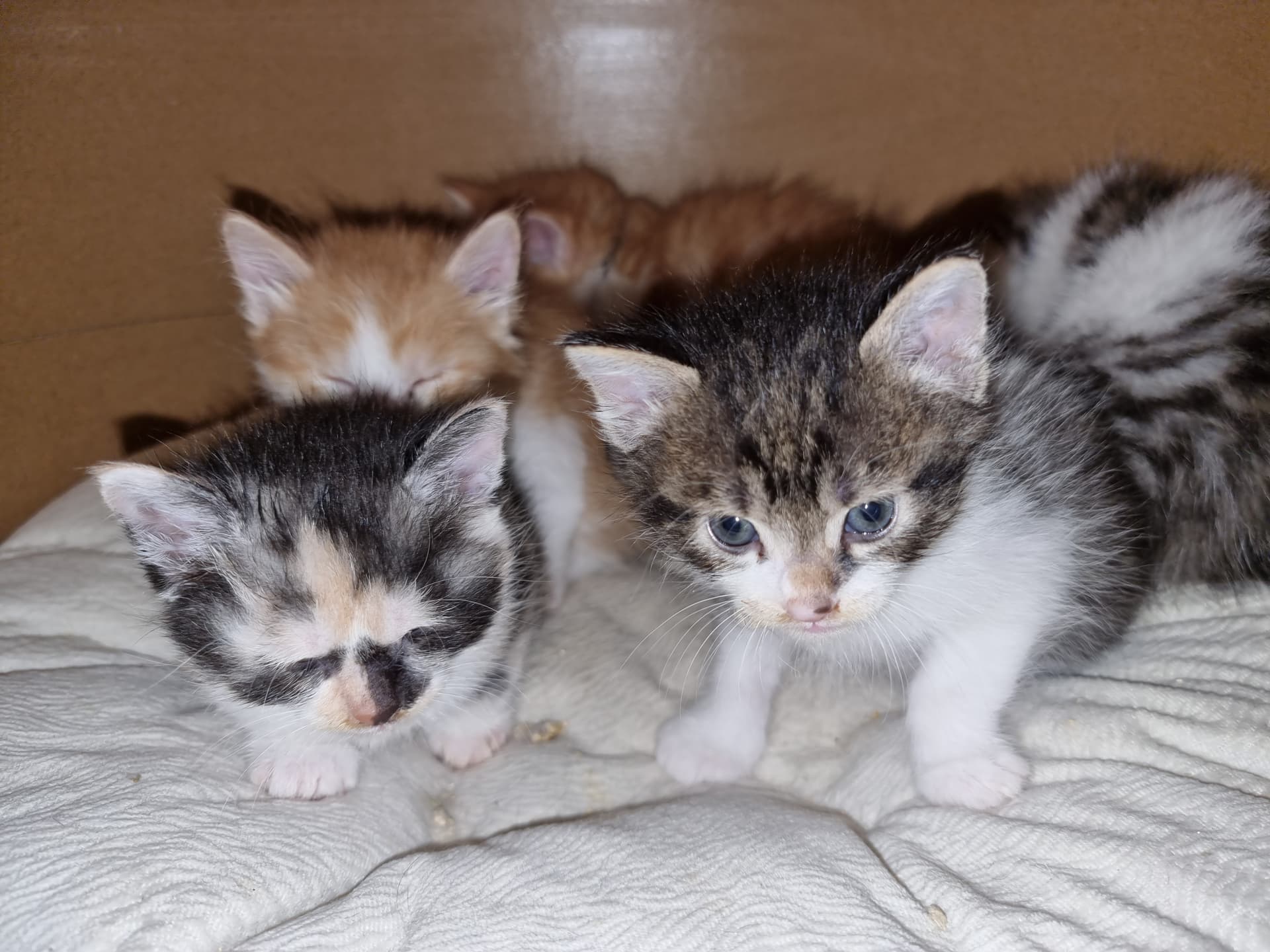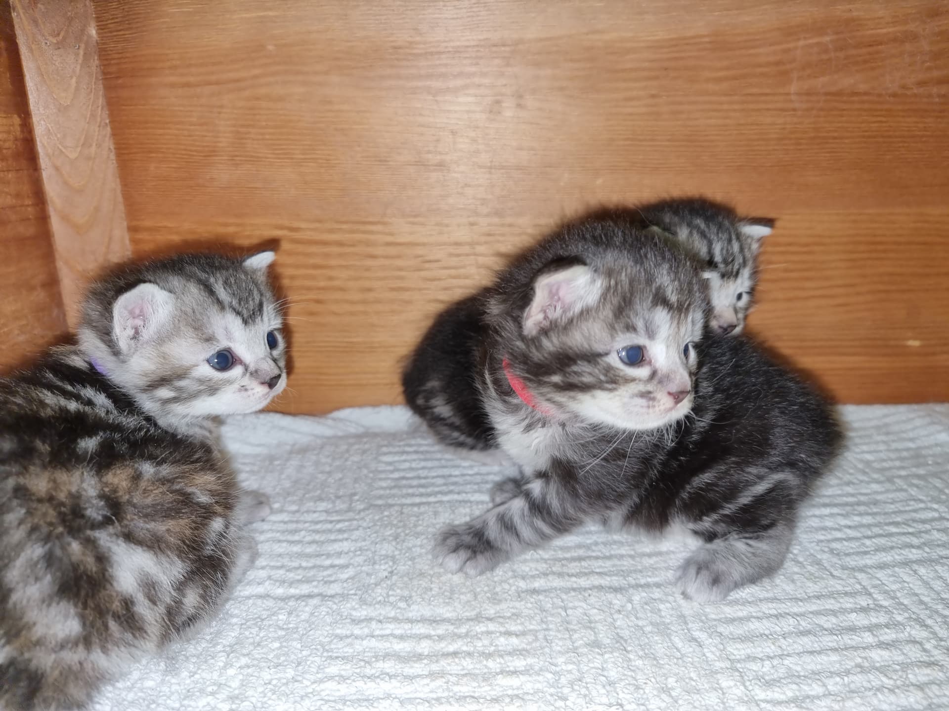 Killingen med orange halsbånd er makreltabby … de andre er klassisk/blotched tabby.