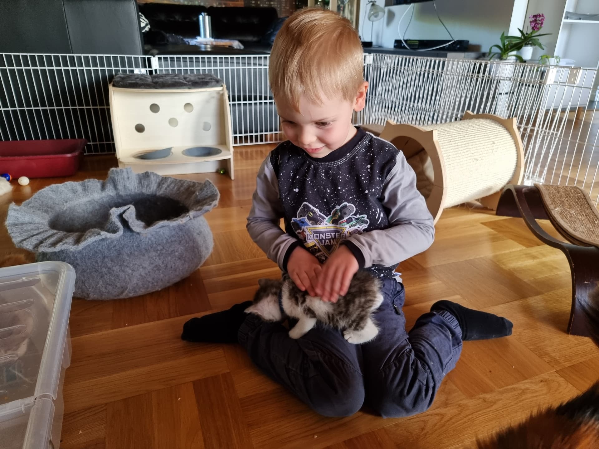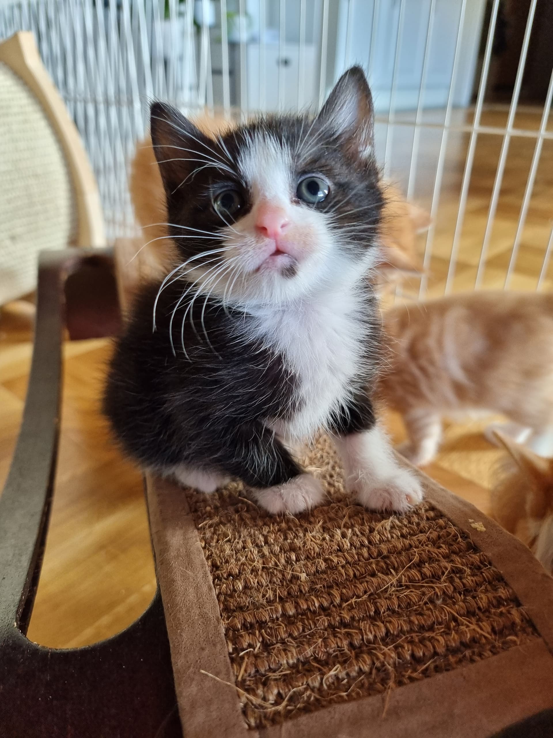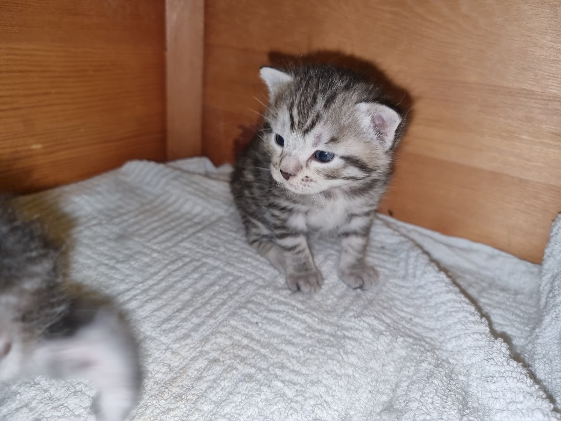 De er nu 4 og 5 uger. I går fik vi sønnikes 3 børn til overnatning, samt besøg af vores killinge socialiserings damer. Kravlegården var altså for lille, så vi lukkede op for at få mere plads. Og det må siges at være et hit for killingerne, nøj de kunne spæne rundt, men desværre, så vil de ikke længere nøjes med en lille indhegning. De plankede den