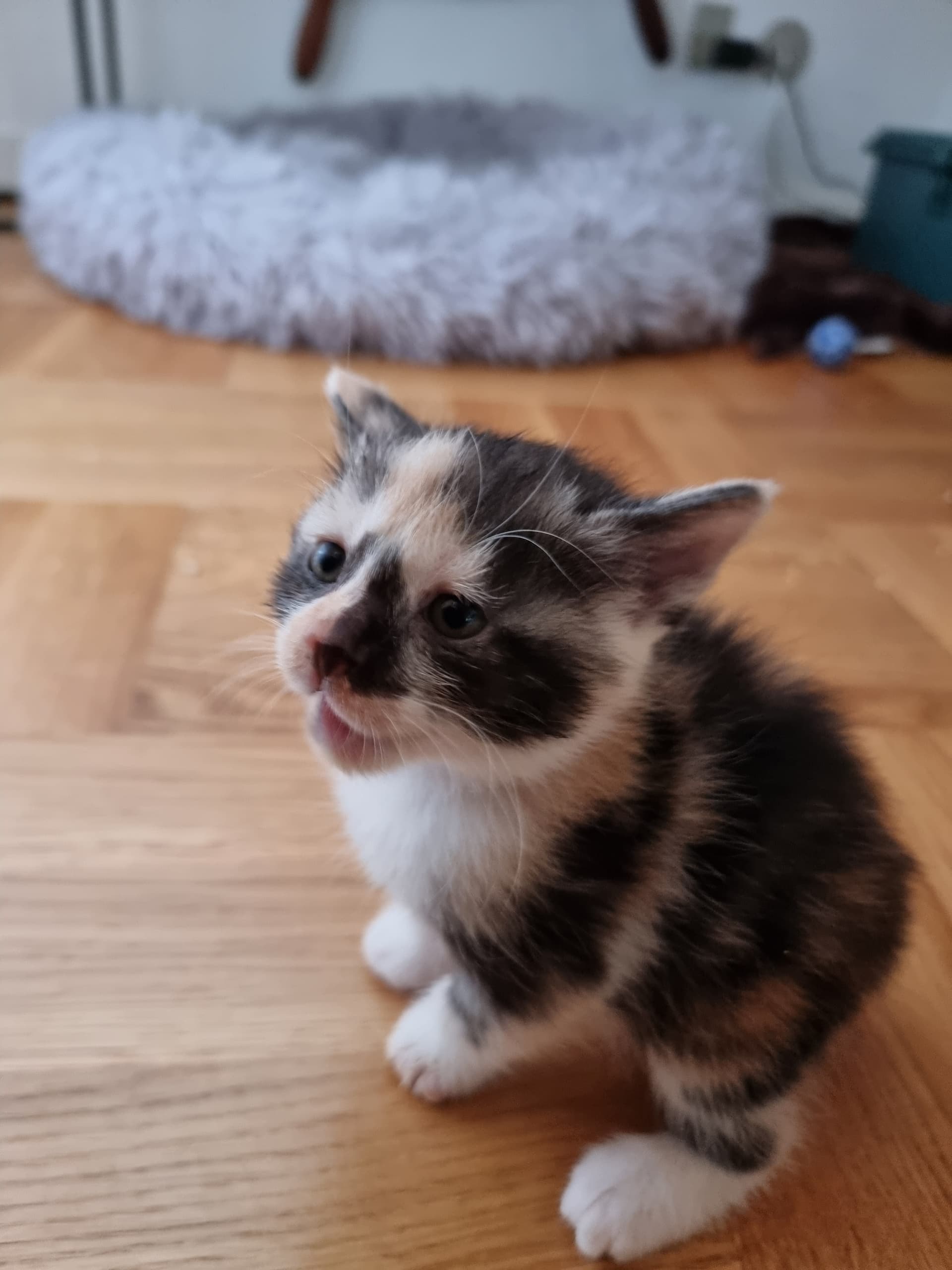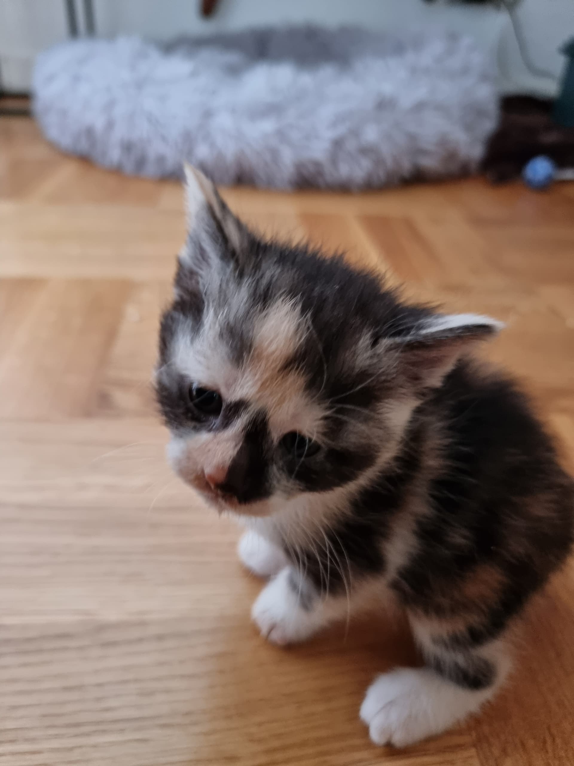 Den lille tortie tøs er nuttet. Hendes mønstre i ansigtet får hende til at se helt bekymret ud, det er virkelig cute.