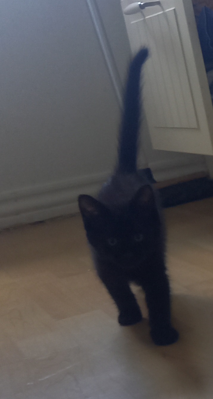Hittemissen vejer 1100 gram og er vel 10.5 uge nu. Jeg har lidt mistet tælling på ugerne Men han skal have første vaccine d 26, hvor er er 12-12.5 uge. Jeg synes ikke han er stor, men jeg aner ikke, hvor stor han bliver. Hans hale er blevet lang. (Se bort fra dårlig billedkvalitet, det er blot halelængden jeg var fascineret af)