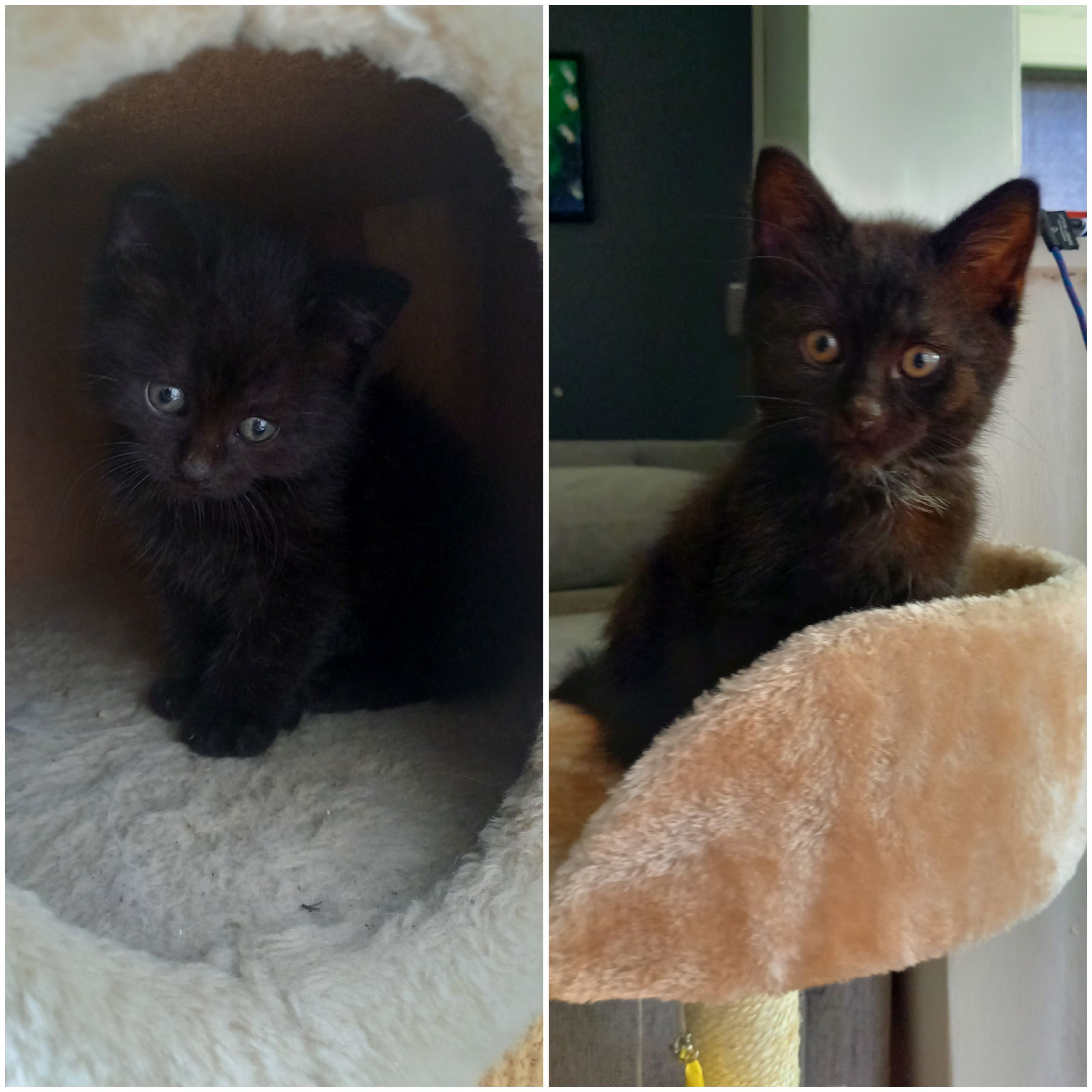 Sidespørgsmål som slet ikke handler om kradsebræt. Hvornår har han sin rigtige pels? I mangel af bedre ord. Han er ret tydeligt tabbystribet i det sorte, men det forsvinder måske?