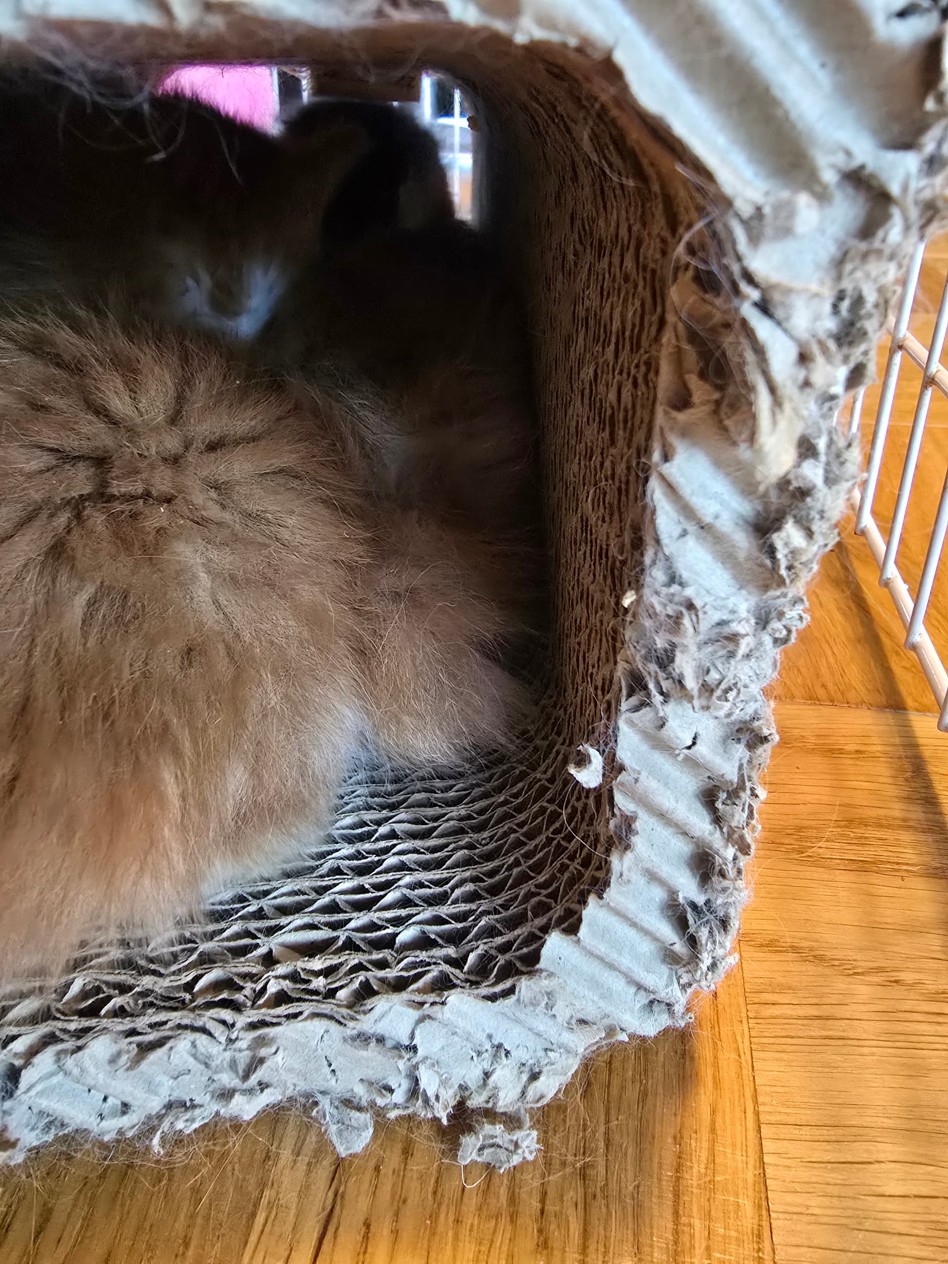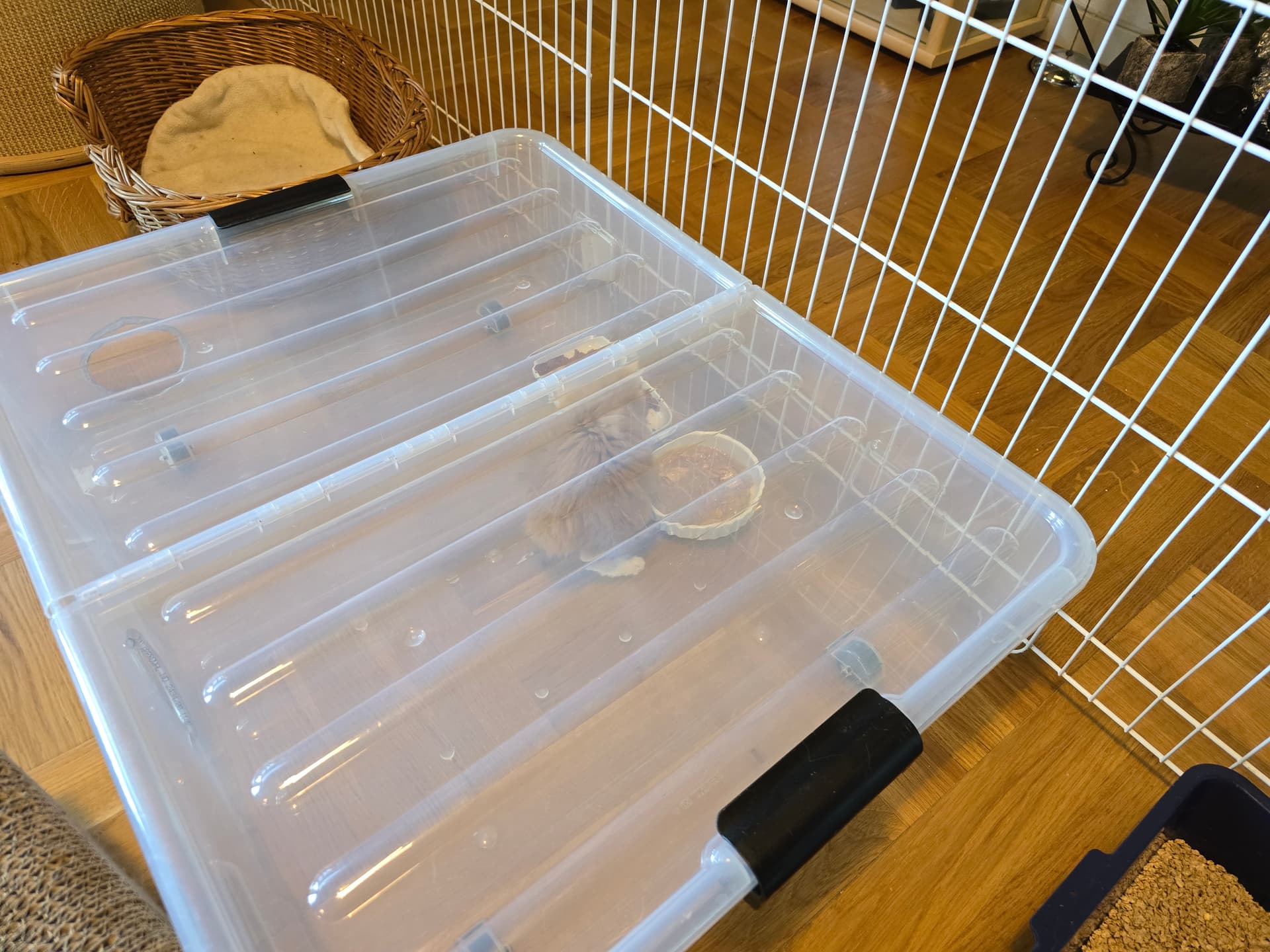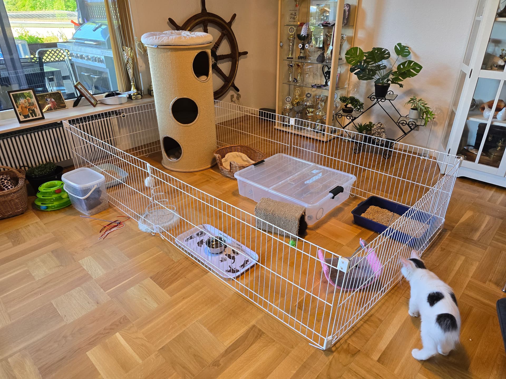 Vi har udvidet kravlegården, så de kunne få den store foderkasse derind. Skrighals skulle hjælpe, mens de andre 3 sov på trods af de blev flyttet rundt med flere gange.