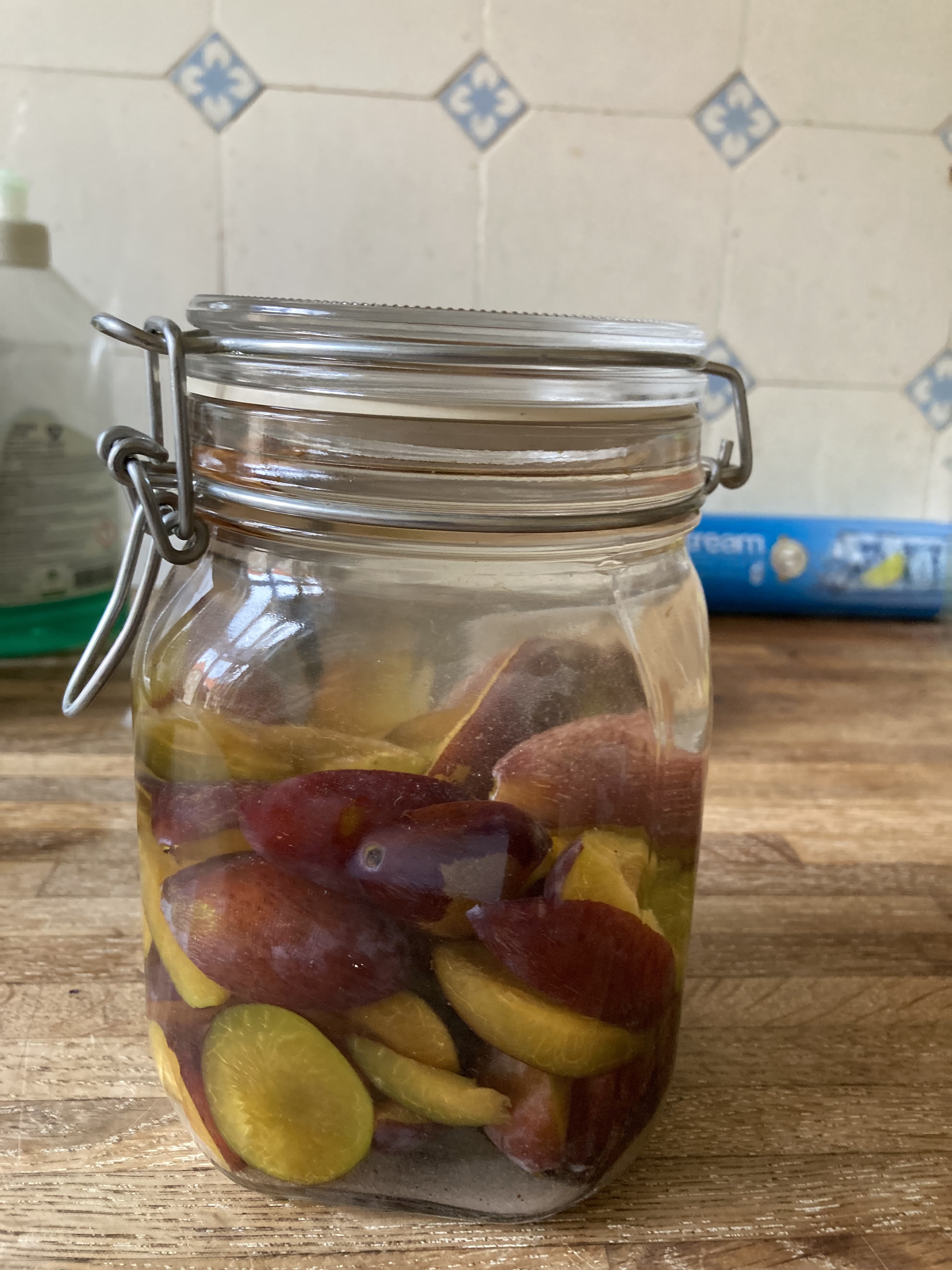 Blommer fra arbejde, lidt rørsukker, 1 vaniljestang og en flaske Smitnoff.