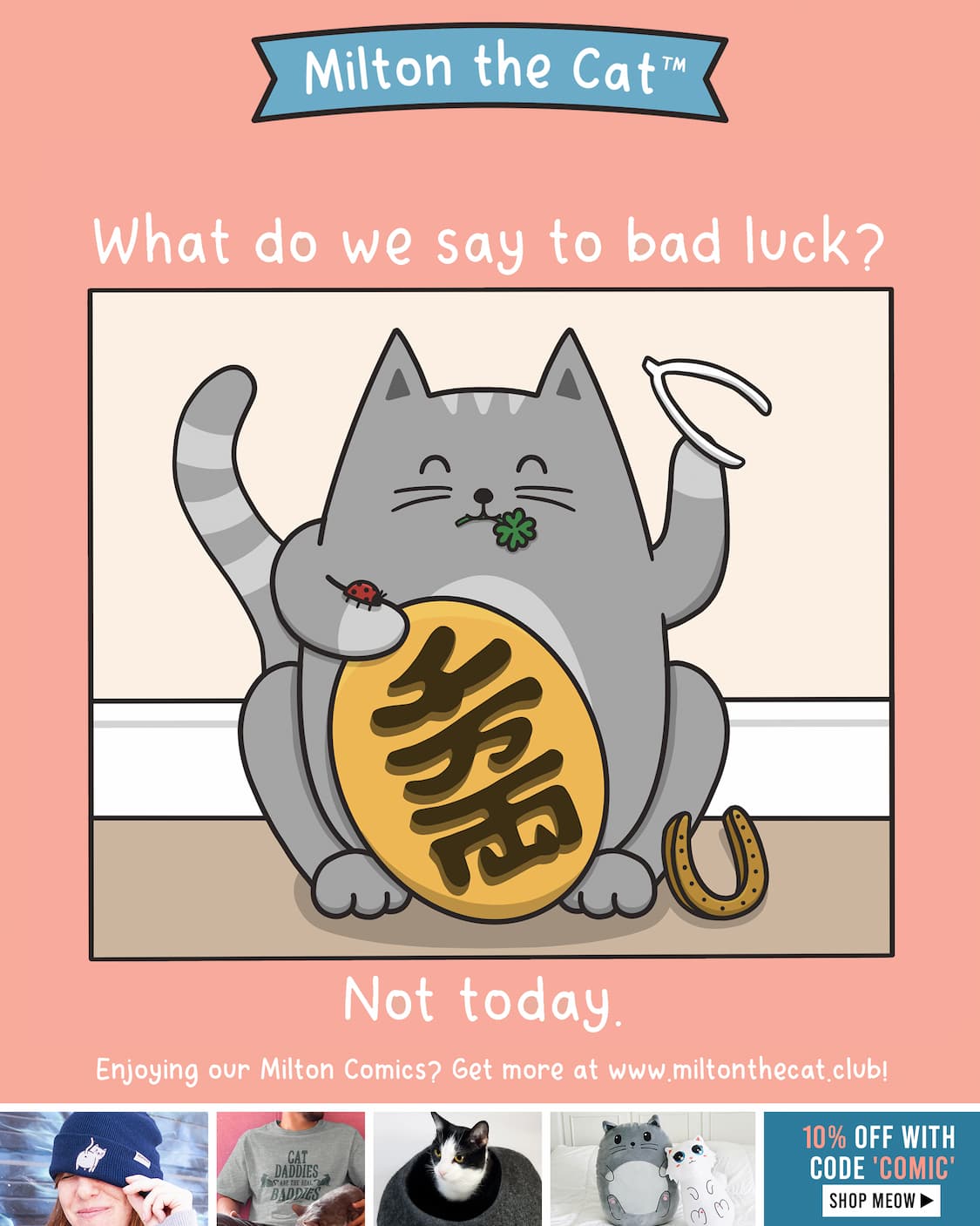 Det er den mønt de japanske Maneki Neko nogle gange sidder med. Maneki Neko har forskellige varianter alt efter hvad man forsøger at opnå, så både farven på katten og hvilken pote der er løftet betyder noget forskelligt. Teksten er også forskellig, men den Milton sidder med er “10 millioner Ryo”, som er et udtryk for et ønske om (økonomisk) velstand og held.