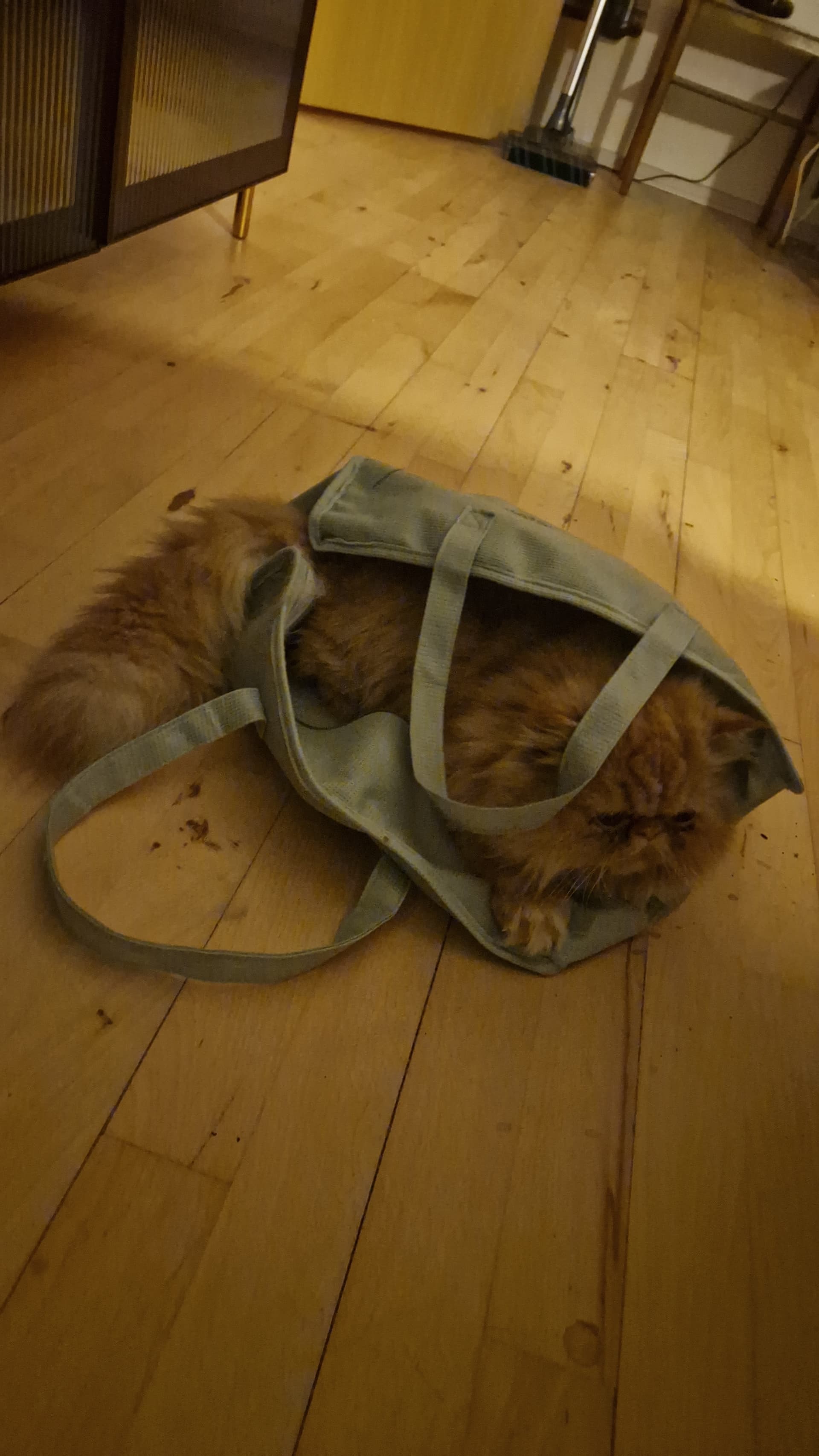 Har modtaget julegave fra arbejdet i dag, og som altid kommer den i en lille taske. Jeg har stadig tasken fra sidste år, fordi Dumle elsker den. Han har nu beslaglagt den nye. Men skal lige have skåret hankene over, for han har allerede taget en løbetur med hanken om brystet, og hvor sjovt han end synes den leg er, så vil jeg ikke risikere at han sidder fast i den på et tidspunkt hvor jeg ikke er hjemme.
