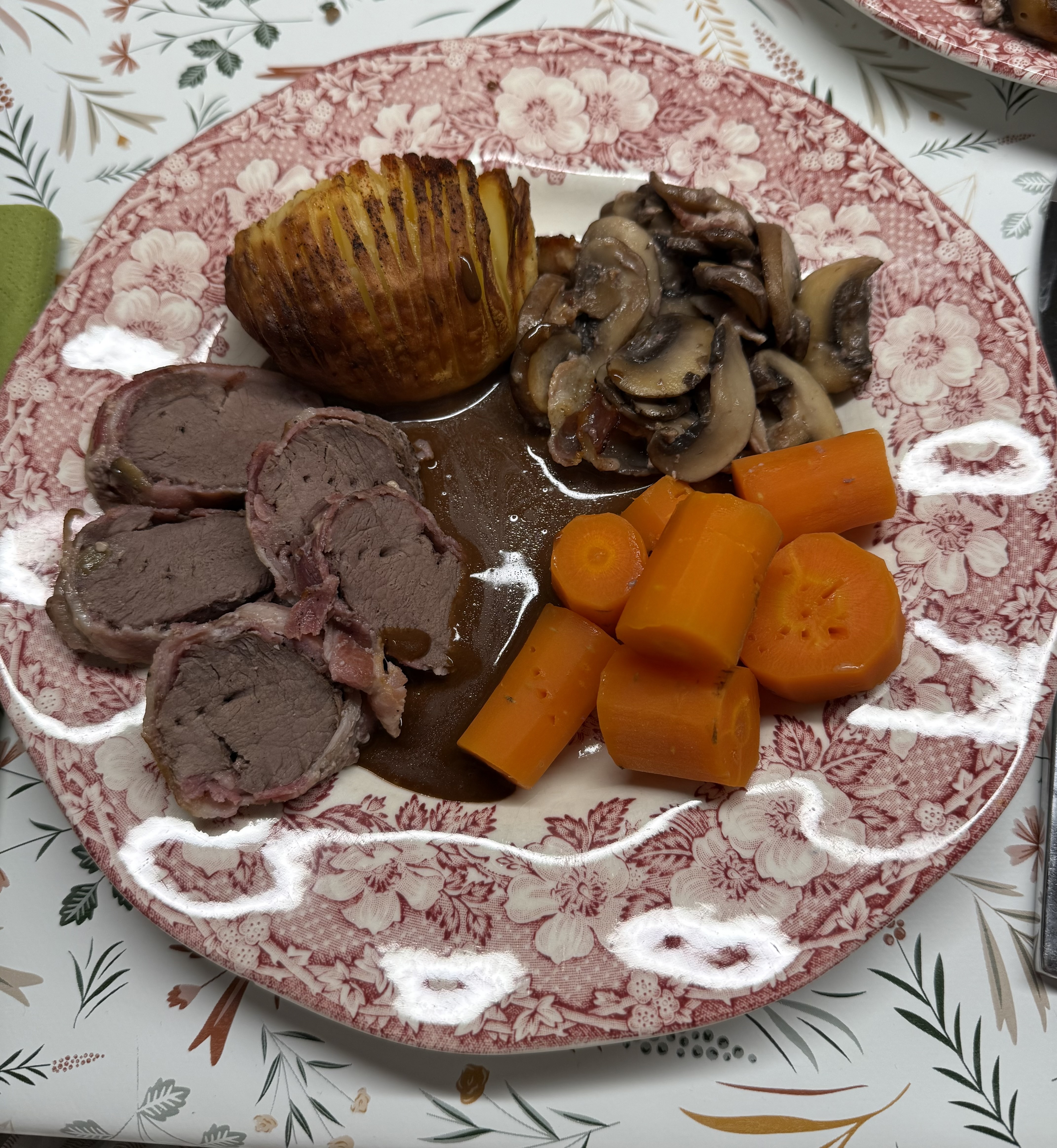 Rådyrfilet i ovn med markchampignon, bacon og et strit fløde. Dertil Hasselback kartofler og gulerødder.