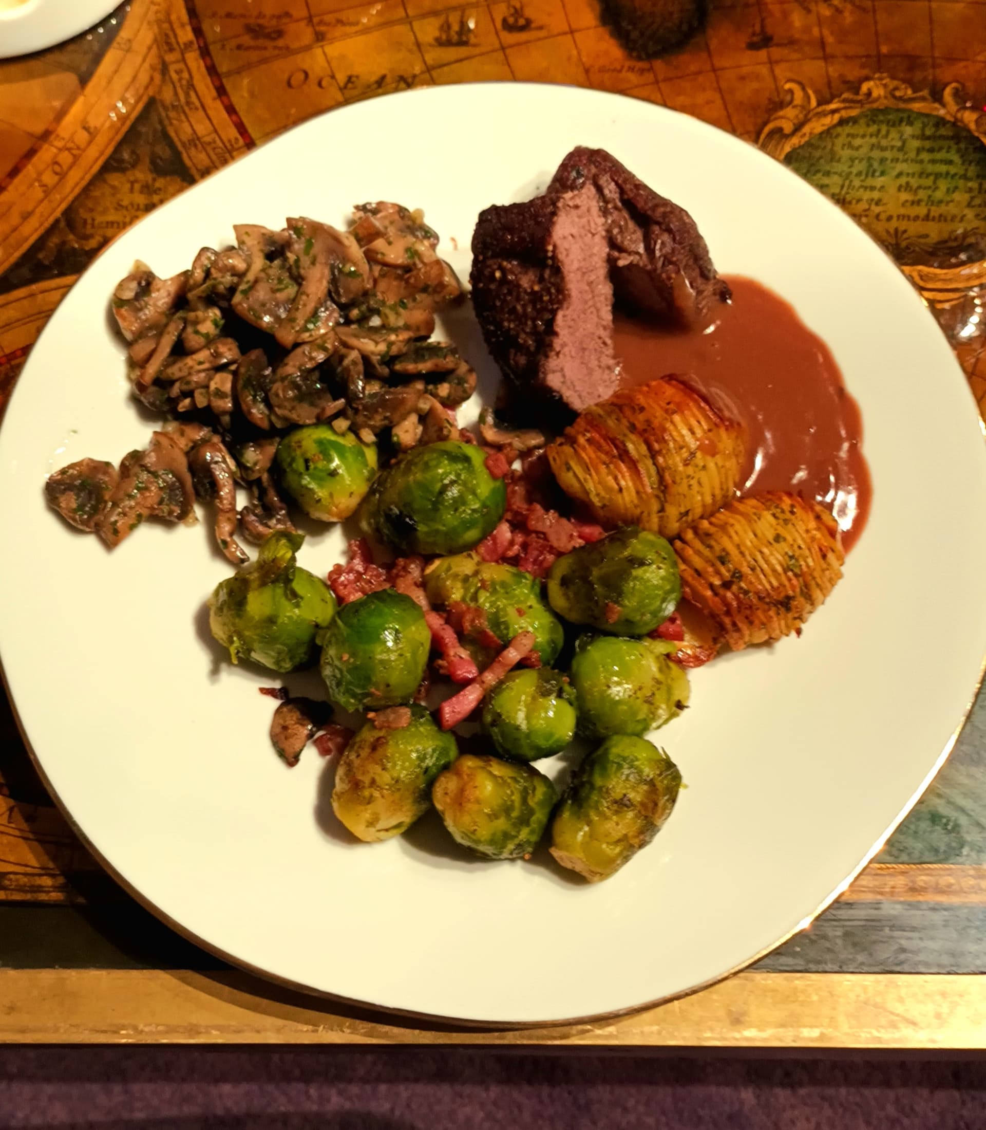 Kronhjortmedaljon (som desværre fik lidt for meget), vildtsauce fra Irma, champignoner med hvidløg, stegt rosenkål med bacon og kartofler. Og god vin! ![]()