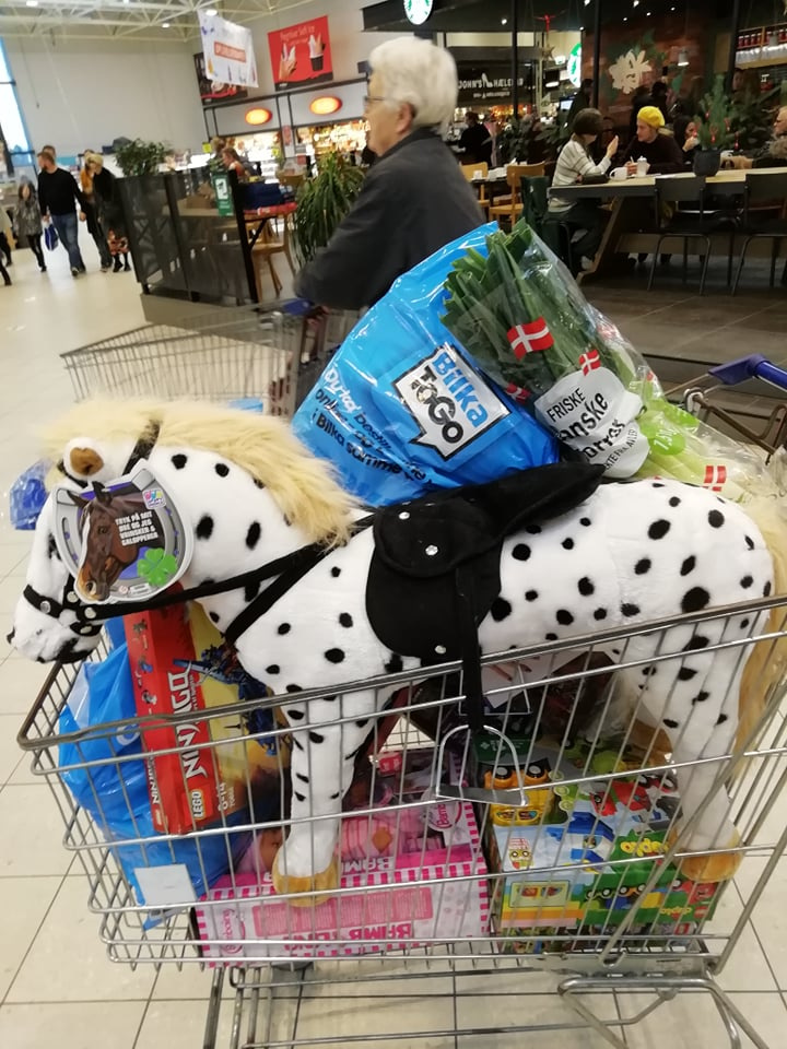 Og der kom et par forbi…de gloede og gloede…hvor var den hest lige henne…indtil de opdagede at den stod i vores indkøbsvogn