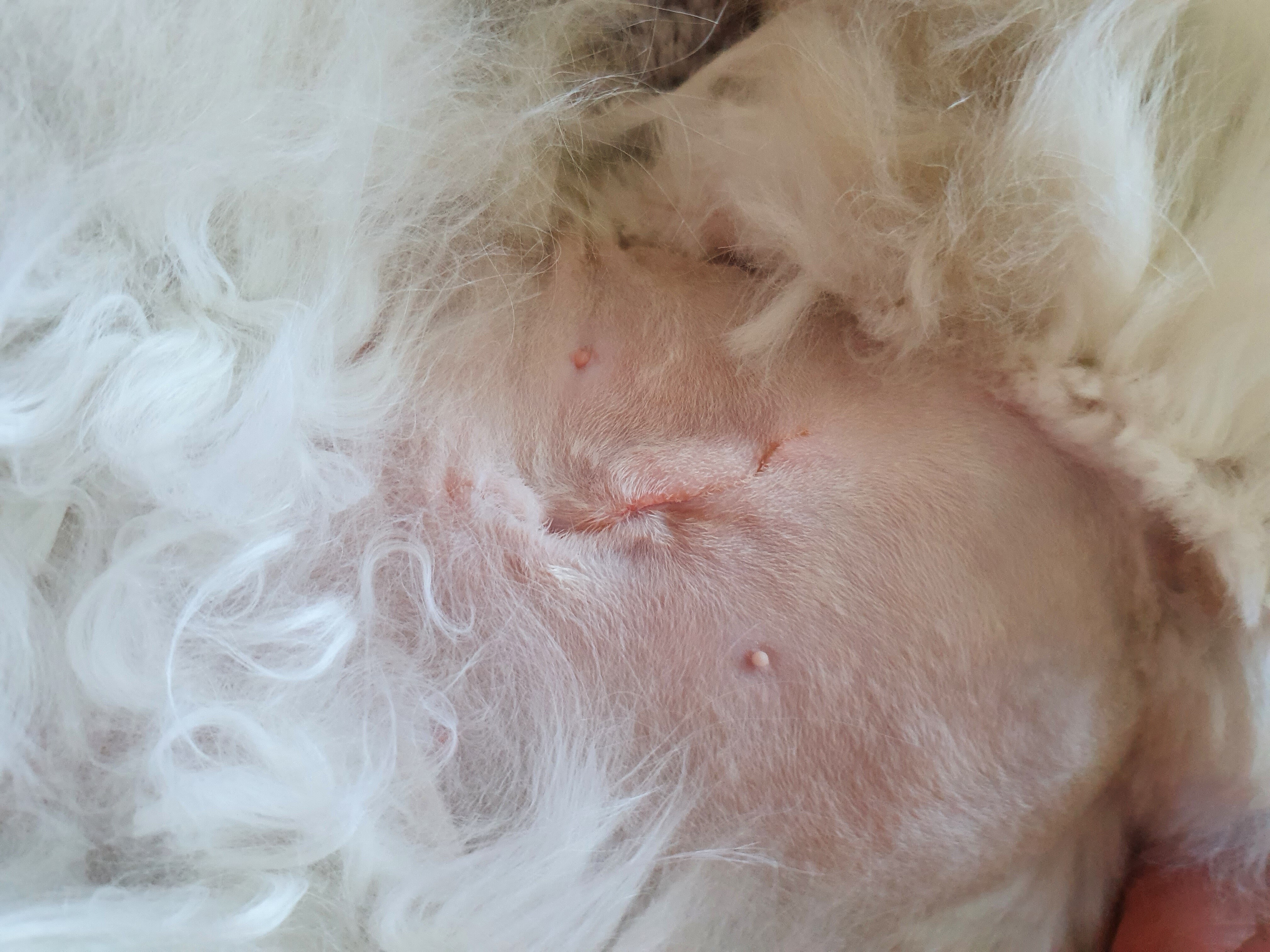 Det ser rigtigt fint ud - rent. tørt og uden at være hævet. Jeg kunne simpelthen ikke drømme om at sætte en body på noget så fint, for der er ingen grund til at hun skulle pille i det. Hvis du er nervøs, så hold øje med om hun piller - men jeg tvivler. Kraver har fanden skabt, og bodystocking kommer lige efter. Skal kun bruges, hvis det er absolut nødvendigt ![]()