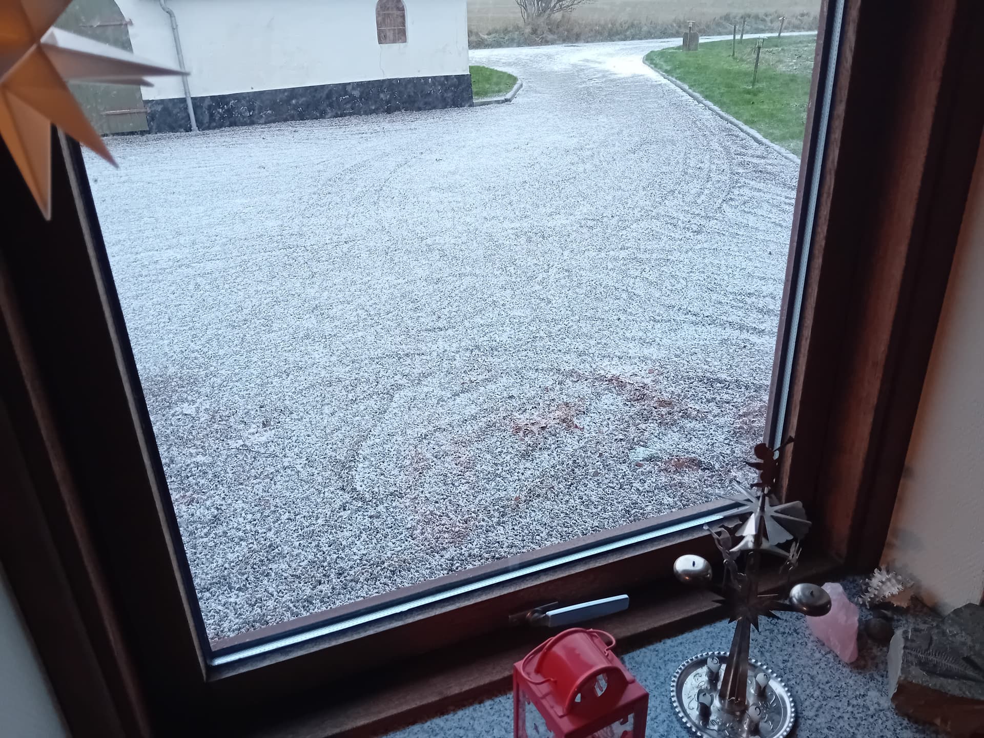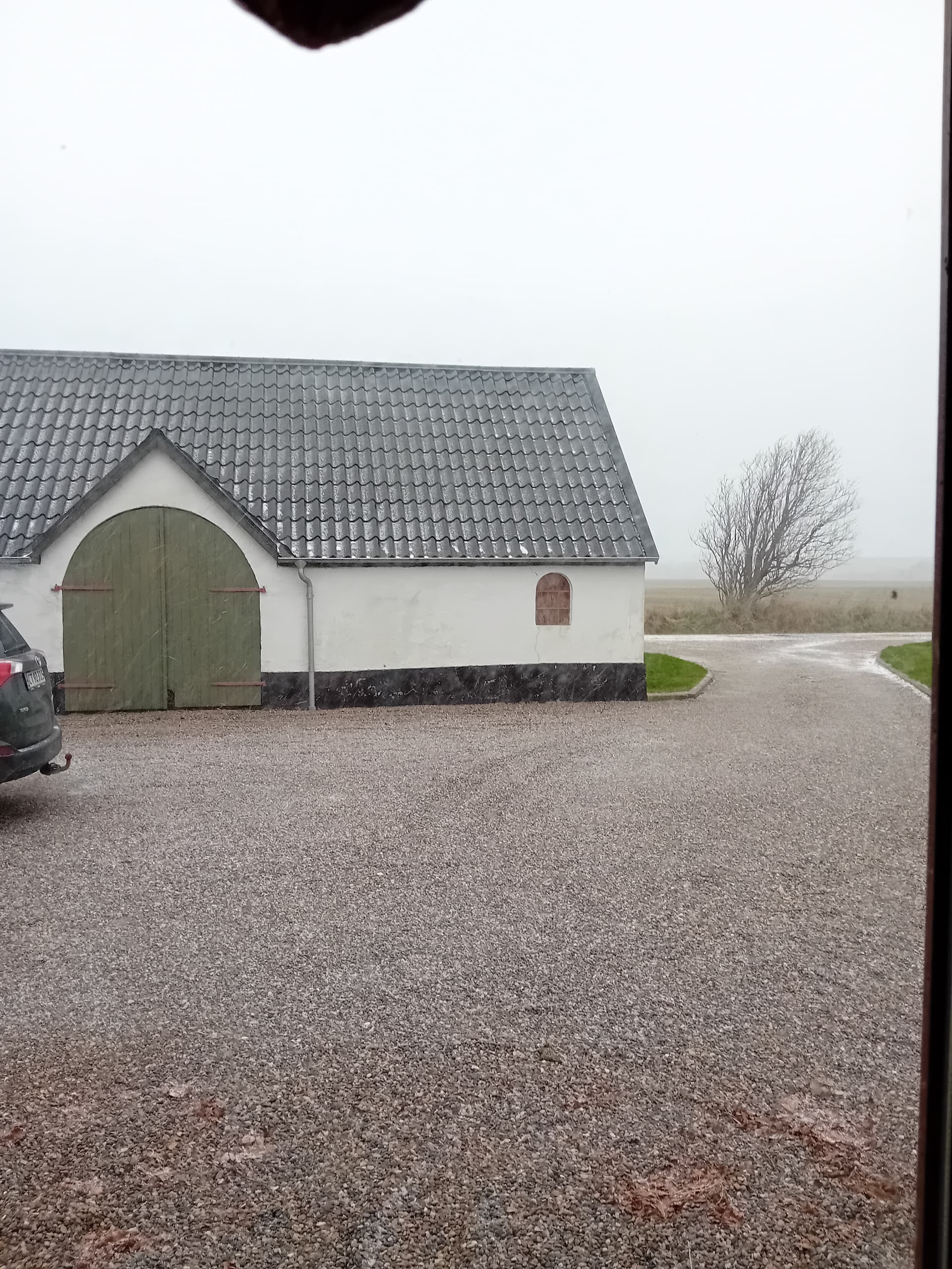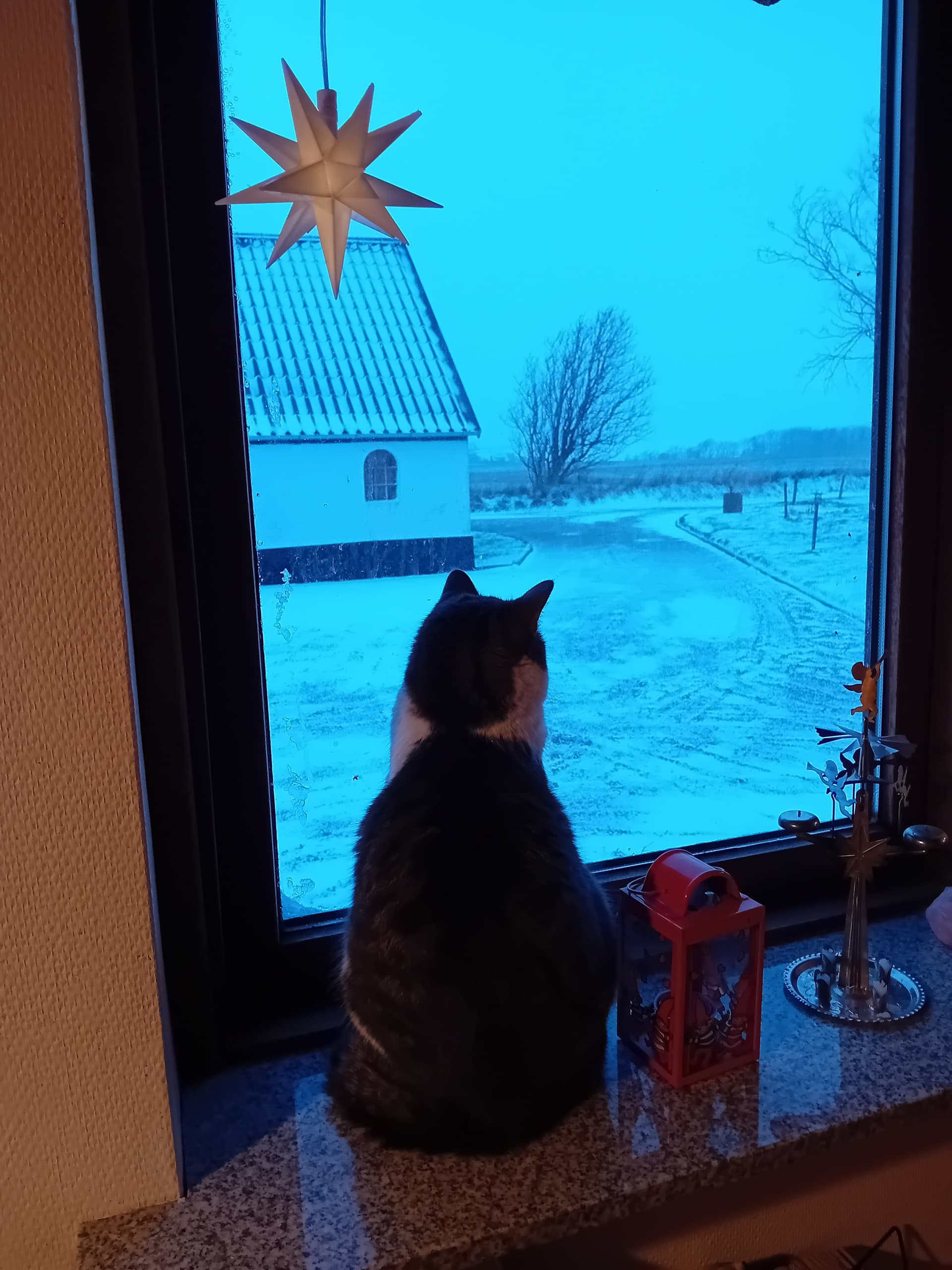 Jeg åbnede kattelemmen ved 01-tiden, da jeg skulle ud og slukke hos hestene, og ikke engang der havde nogen af dem travlt med at komme ud - og i dag har det overvejende set sådan her ud:
