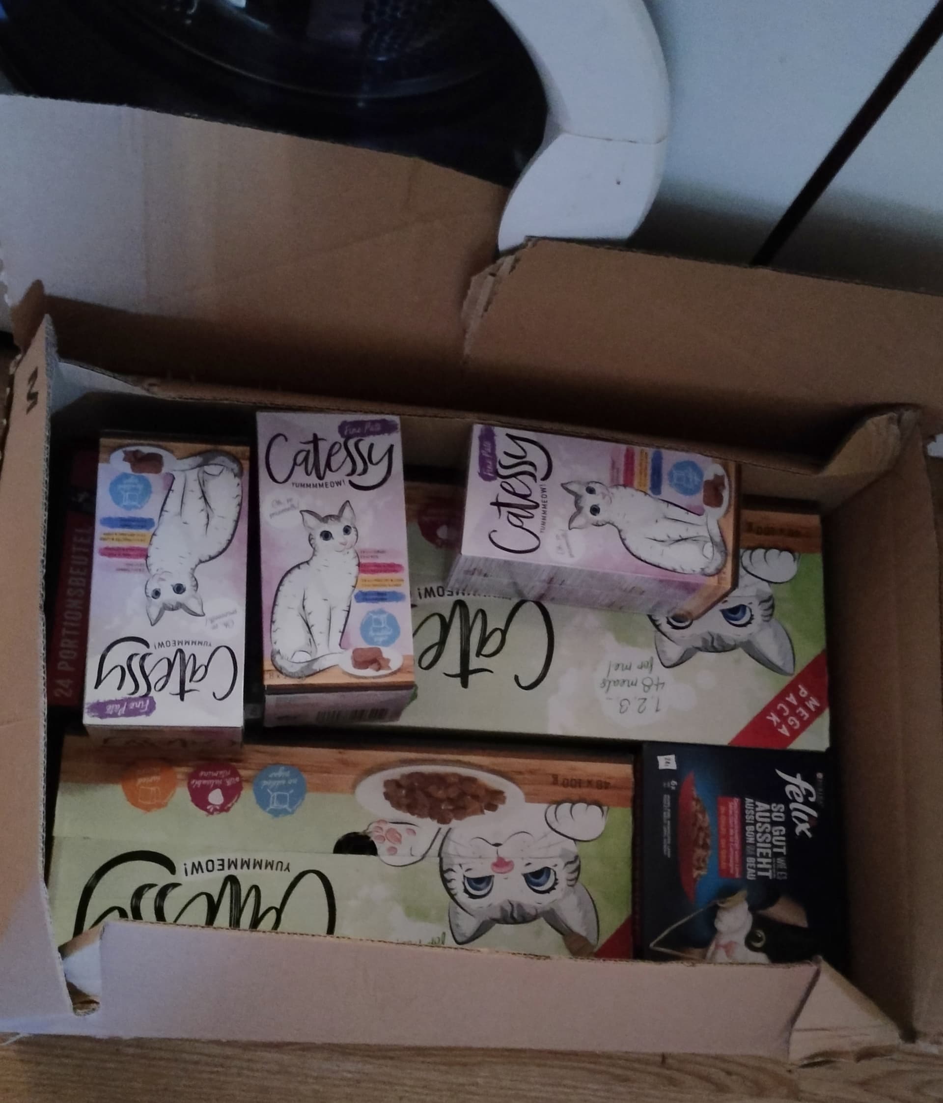 19,9 kg. vådfoder (en enkelt af de små Catessy pakninger fjernet fra kassen) … den første kat til at rynke på snuden, ryger ud på røv og albuer! ![]()