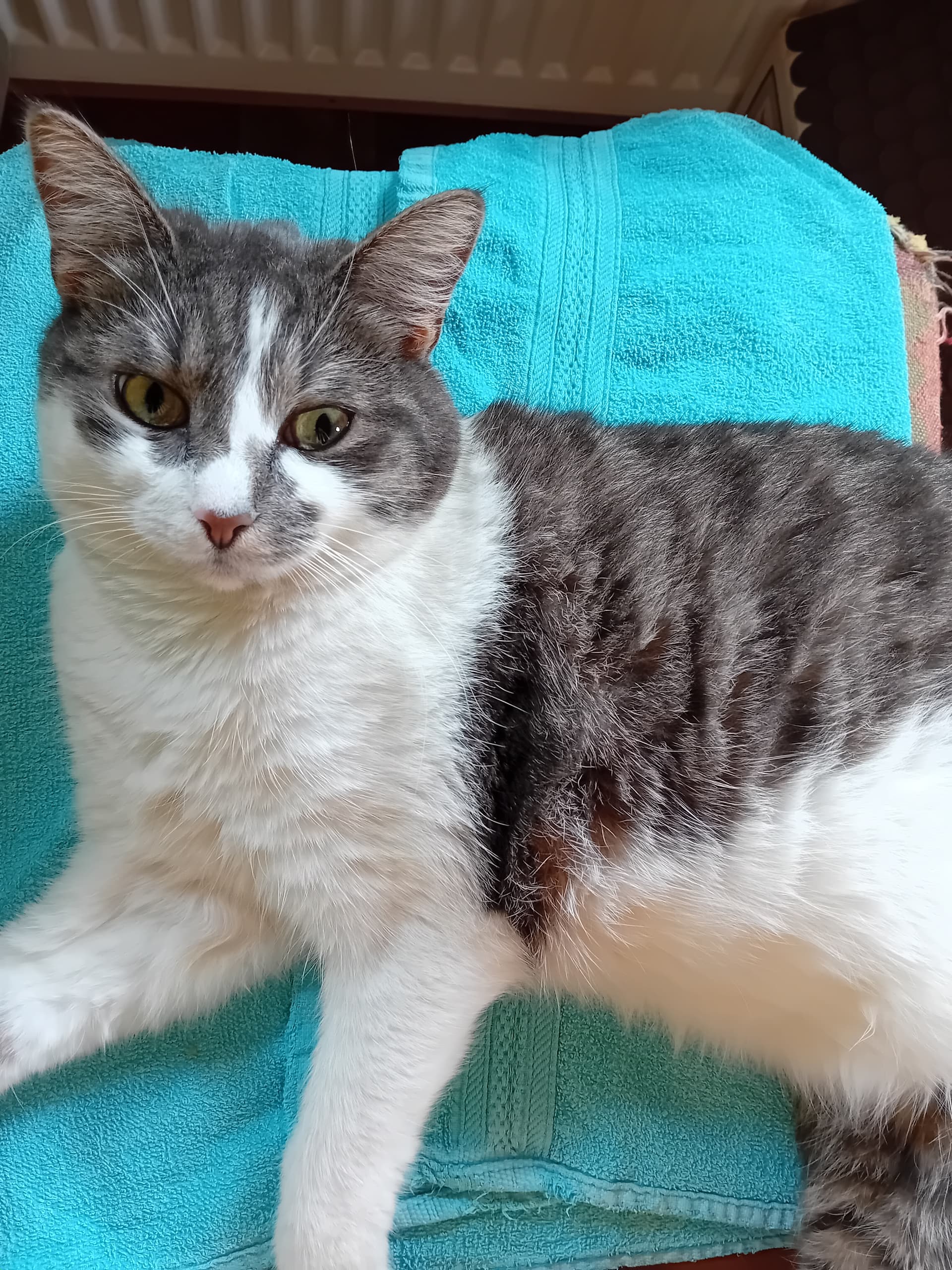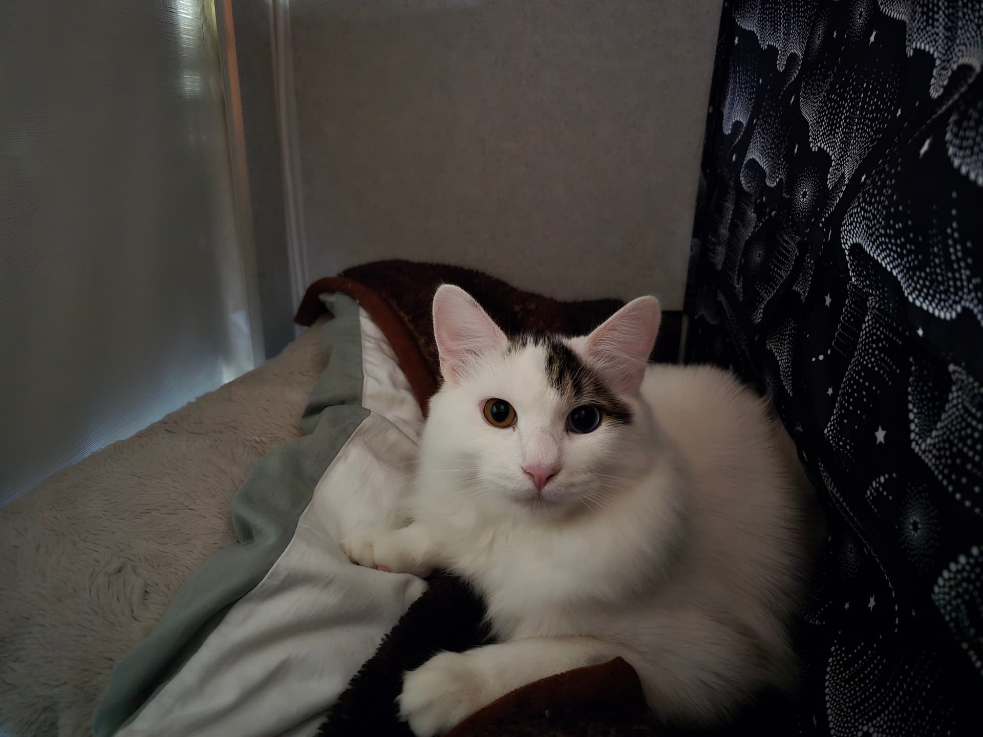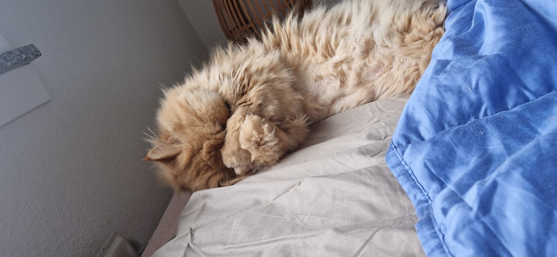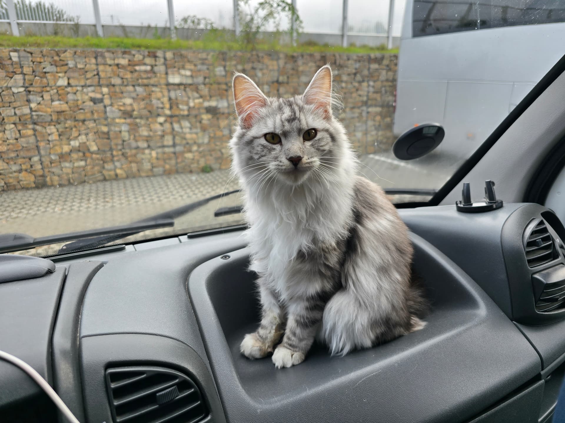 Hun er heldigvis helt sig selv, når vi er i camperen, på udstillingen var hun knap så skræmt søndag som lørdag. (Lørdag gik hun i total panik, lige så snart hun kom ud af buret, men på ingen måde aggressiv, søndag kunne vi tage hende ud og løfte hende, selvomhun helst villegemme sig)