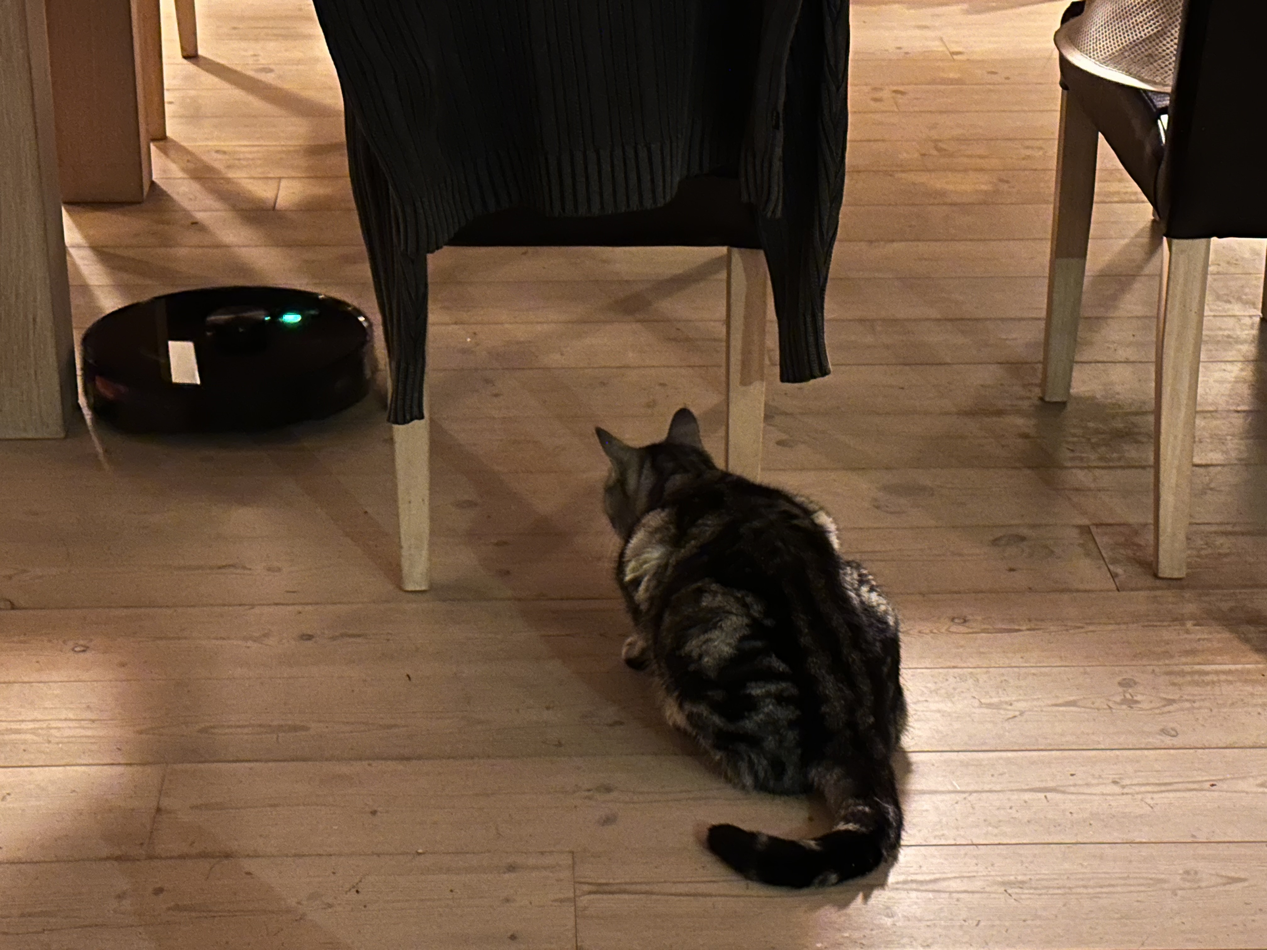 Den kan selvfølgelig ikke tage hjørner ordentligt, kantlister og flytte på ting etc., så den erstatter ikke vores støvsugning fuldstændigt, men det er stadig skønt at man ikke kommer hjem og tænker “ååh, jeg burde støvsuge”.