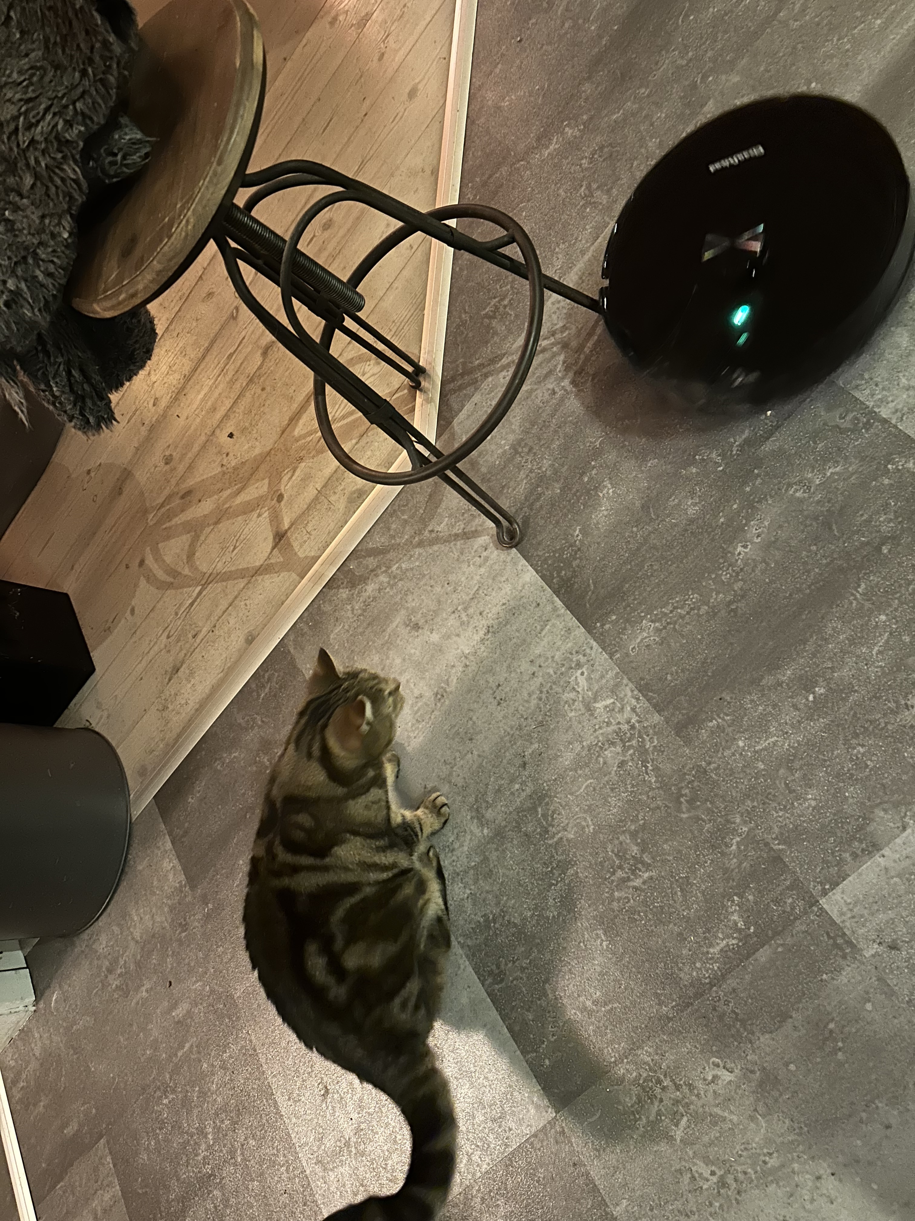Vi fik den første for 15+ år siden, og er på nr. 2 iRobot Roomba model, hvor den nuværende er 5 år gammel. Vi er RIGTIG glade for at have sådan en. Det gør virkelig en forskel på den daglige mængde skidt på gulvet at have sådan en til at køre. Vi bor i 2 etager og har den primært til at køre nogenlunde dagligt i køkken-alrummet, hvor kattene (og vi) trækker meget skidt ind og ud fra haven og hvor kattebakkerne er. Den er sat til at køre på timer-funktion på de tidspunkter, jeg ved, vi ikke er hjemme (for Kira har ret, den larmer! Så den skal helst ikke køre mens vi er i rummet). Samt vi sætter den ofte lige ud og tager gangen også. Den kan desværre ikke bare tage begge rum, da den strander på dørtrinnet på vej ud fra gangen igen. Så jeg skal bare lige huske at bruge ½ min på at samle kattelegetøj etc. op fra gulvet inden jeg går, og så fungerer det.