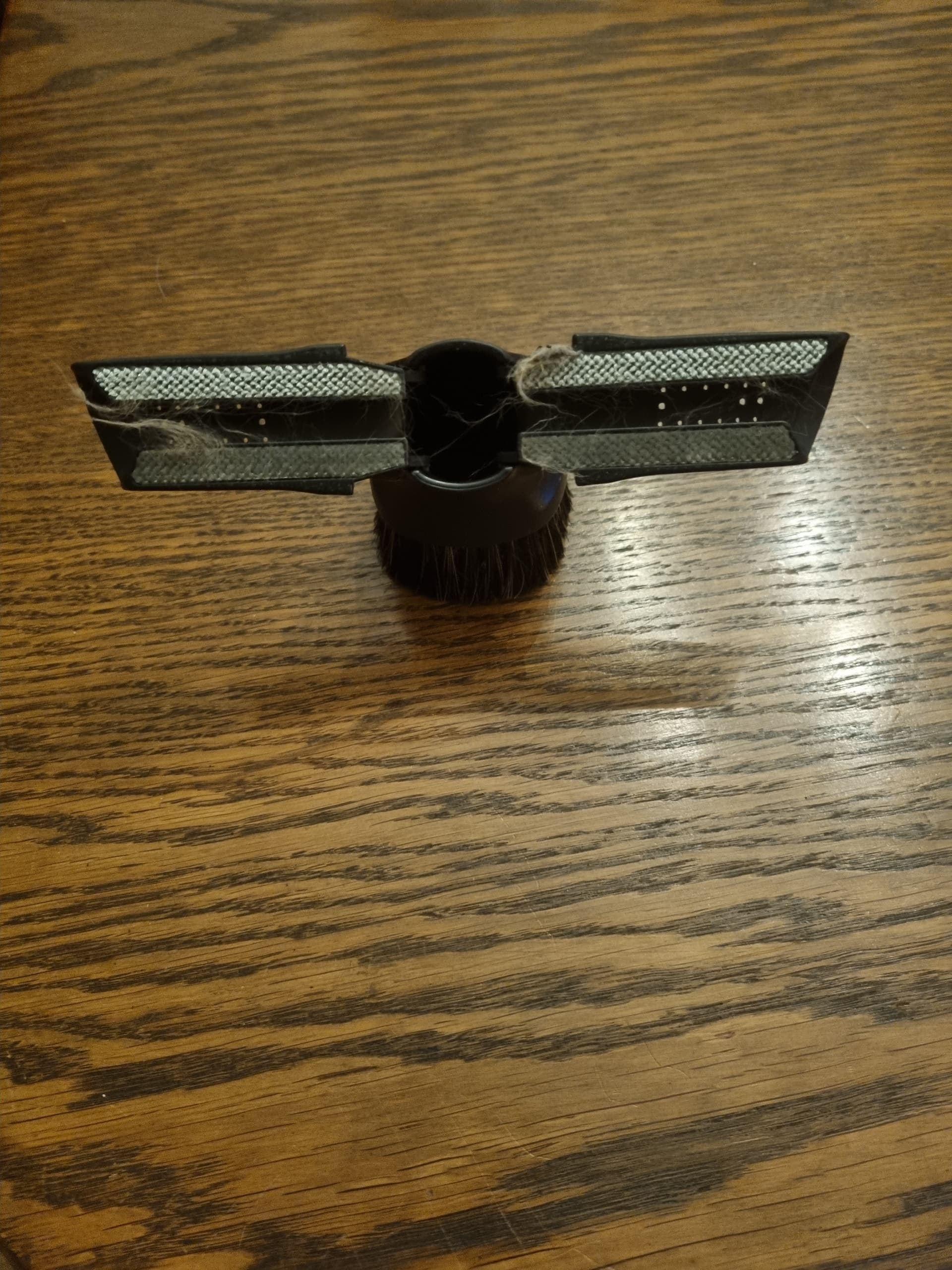 Plastic-delen på det lange stykke kan så åbnes op som vist på billede 2 og 3 herunder. Den del af det er jeg bare ikke tilfreds med - for vingerne brækker af for et godt ord, så den er f****** irriterende at bruge. Det kan jeg slet ikke have - det skal bare fungere. Den har også den slags stof på sugedelen som fungerer som kæledyrshår magnet - man kan bare ikke bruge den i praksis, fordi vingerne ryger af hele tiden.